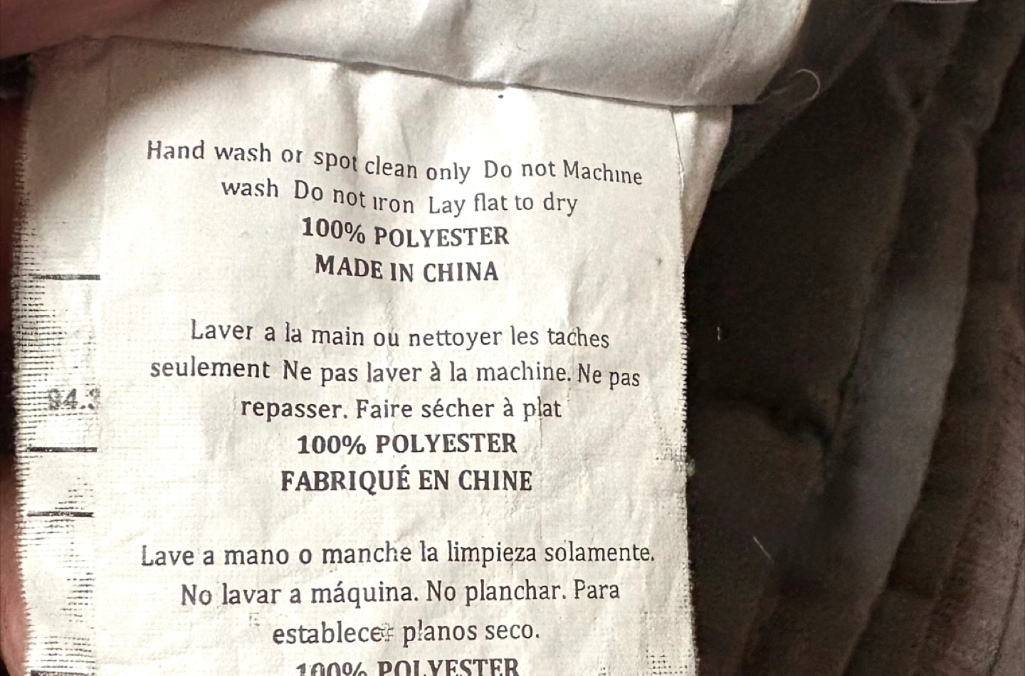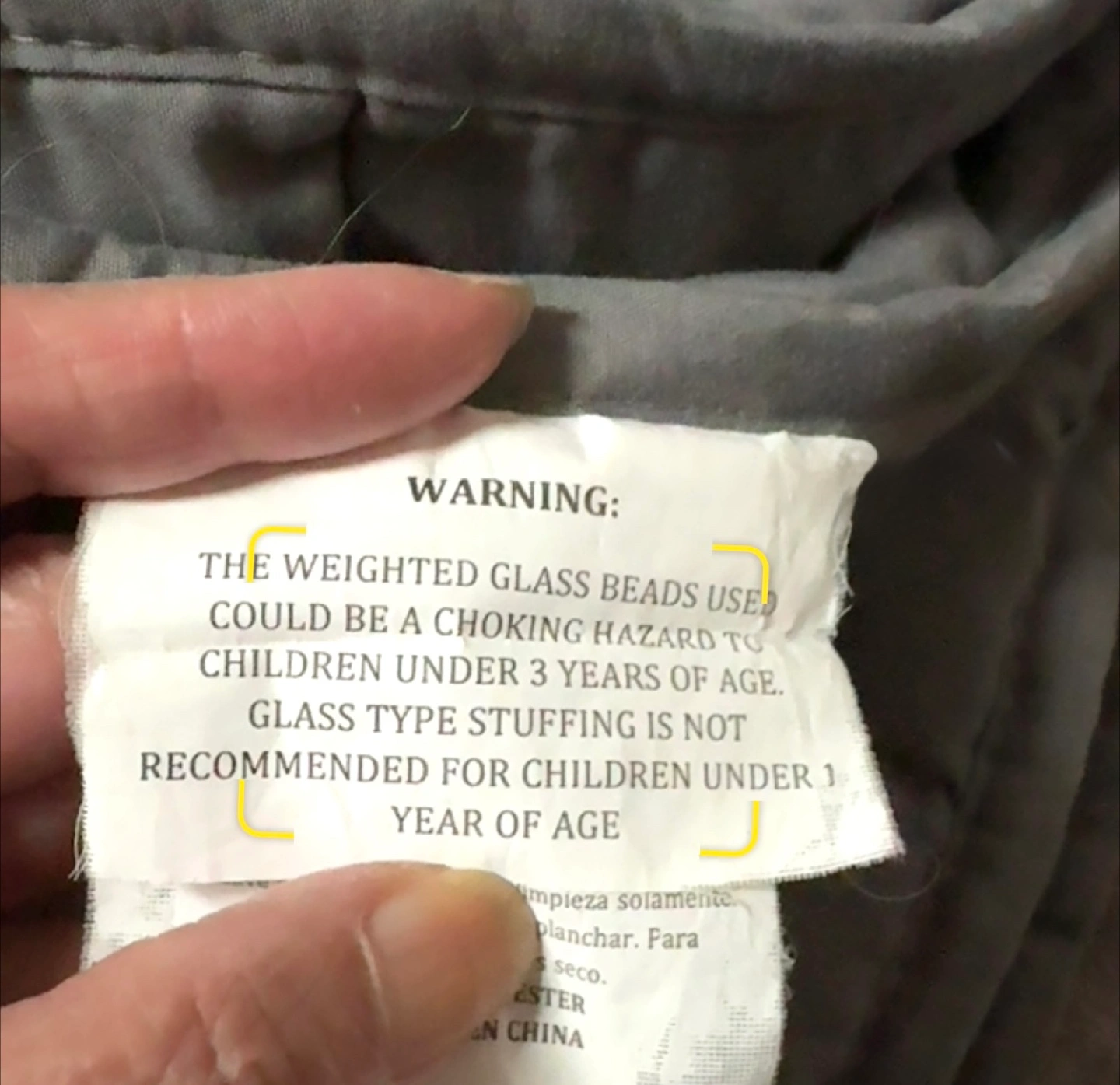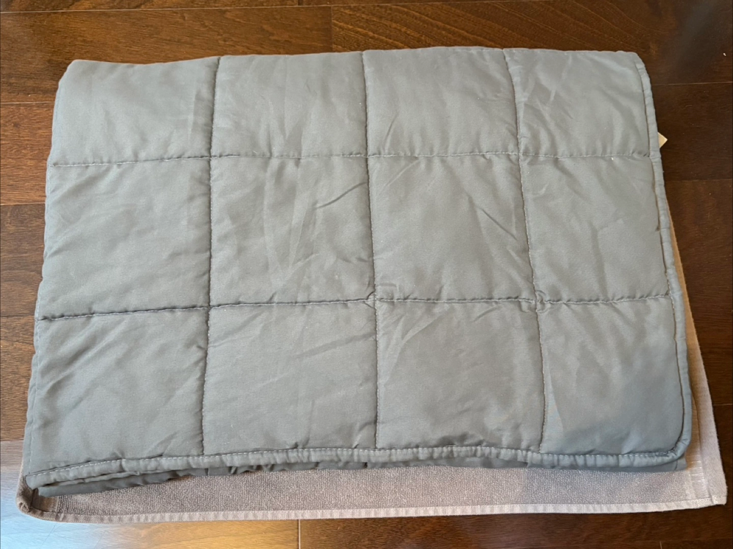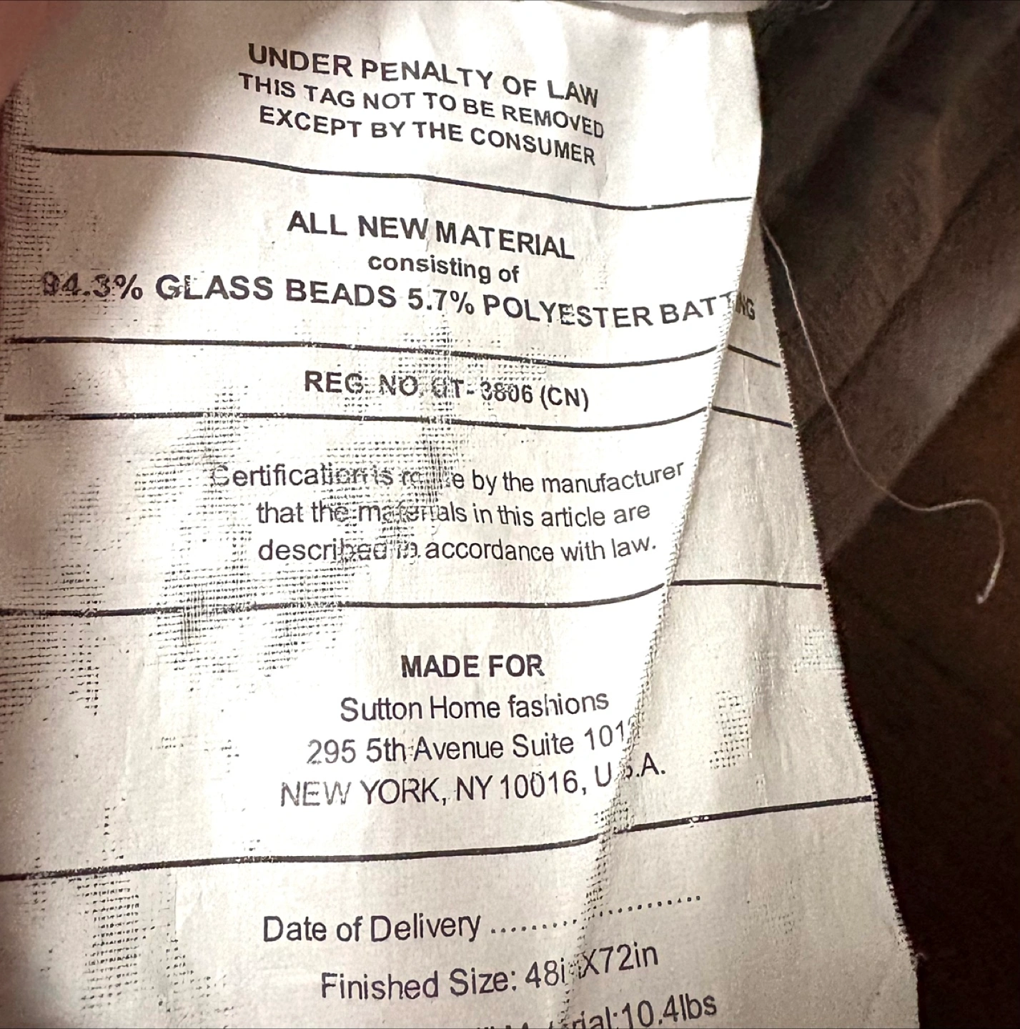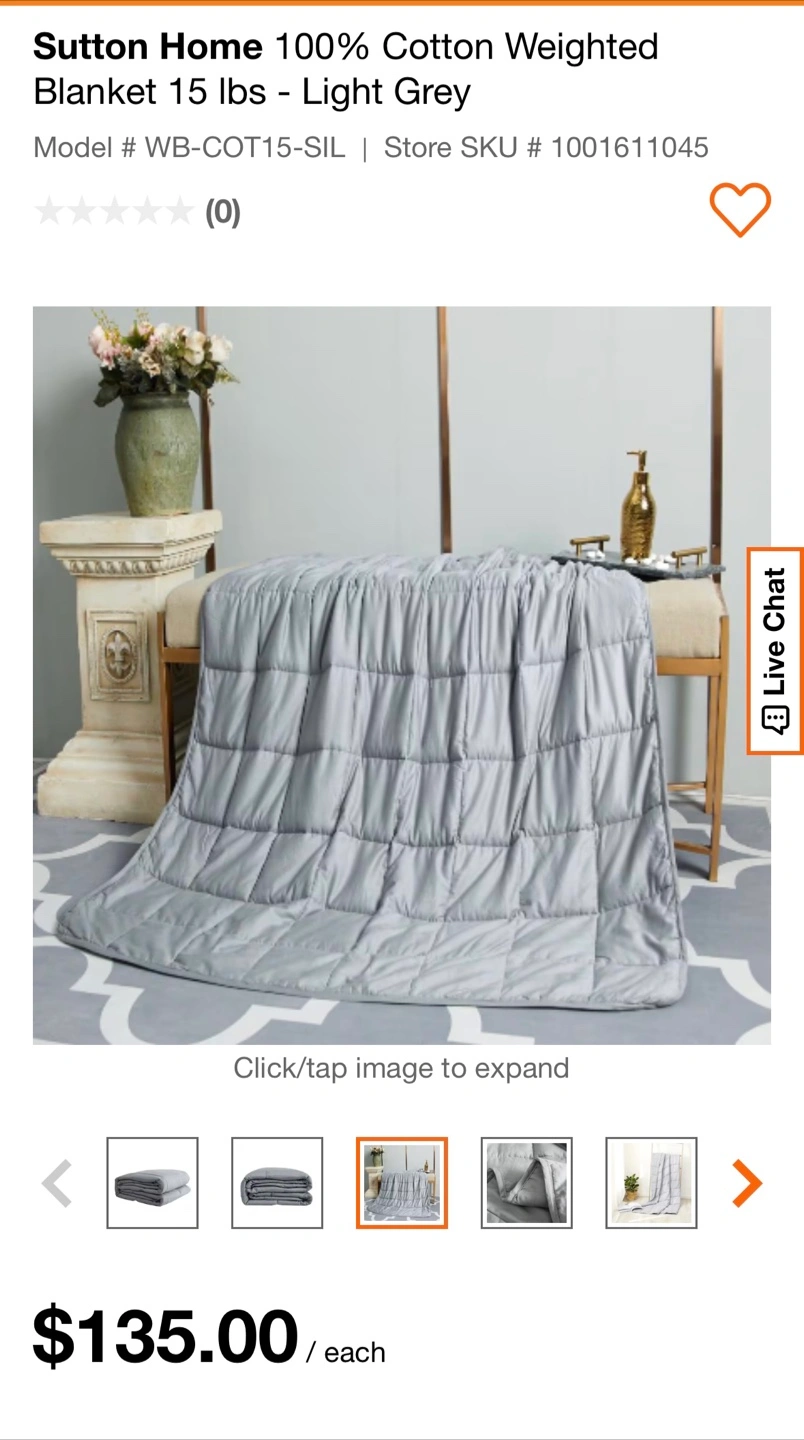 This is a Sutton Home weighted blanket in light grey! It's made of 94.3% glass beads and 5.7% polyester batting. - Brand: Sutton Home fashions - Size: 48 in x 72 in - Weight: 10.4 lbs Not suitable for under 3 years old. Used for one season over a flat sheet , in great condition.