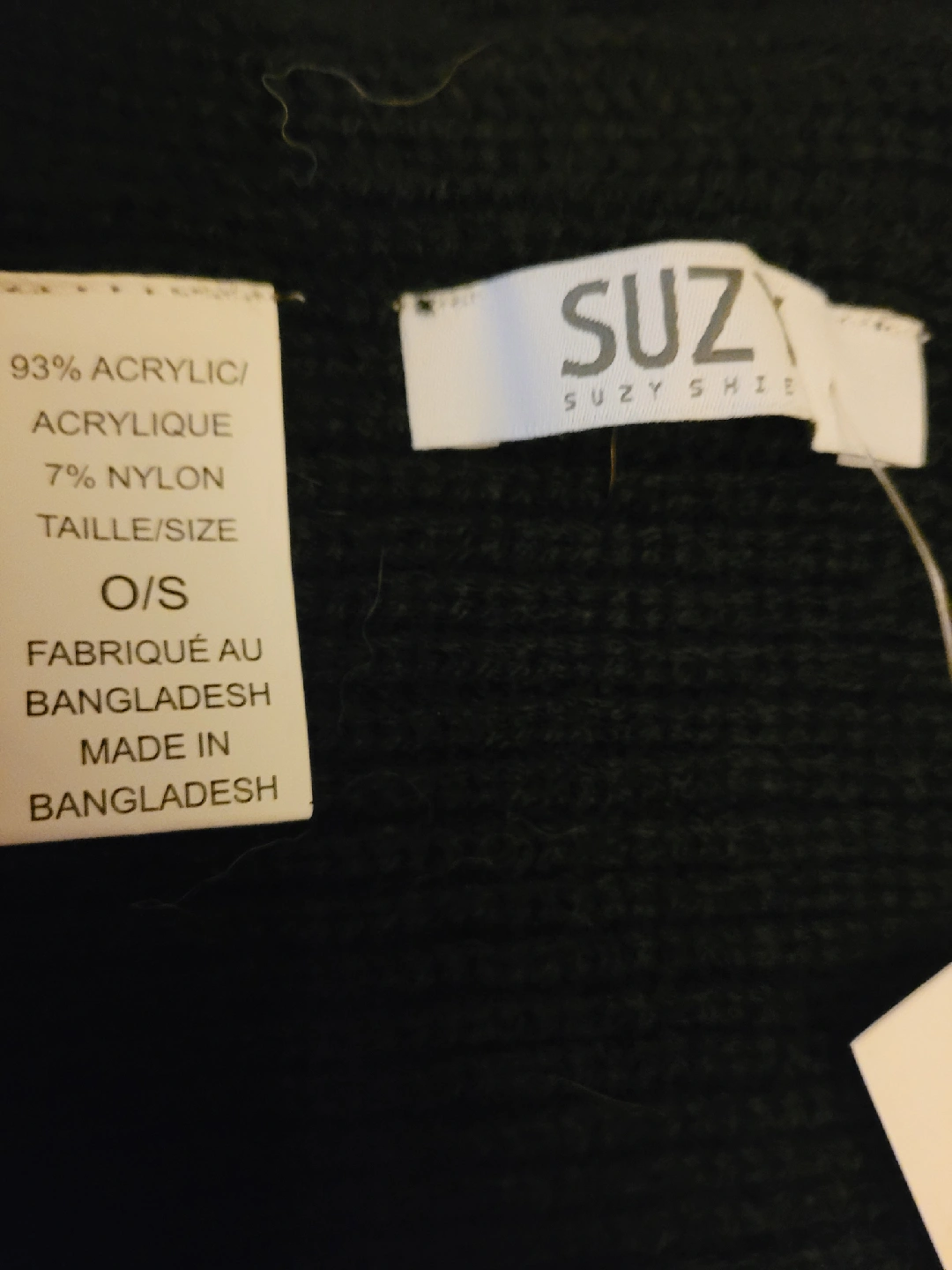 Selling a brand new Suzy Shier scarf that still has the tags on! It's a stylish black colour and made of 93% acrylic and 7% nylon. Size is O/S.