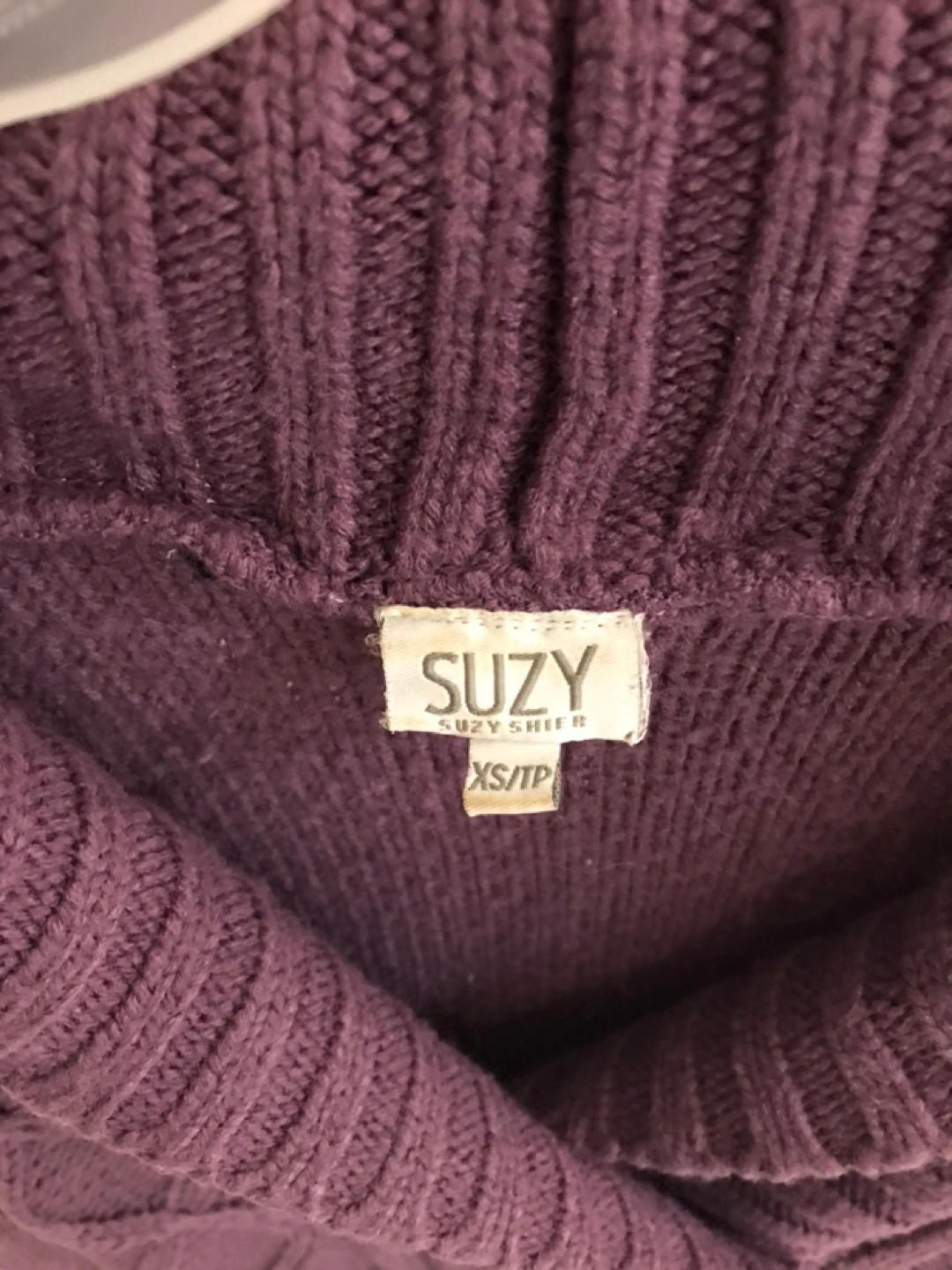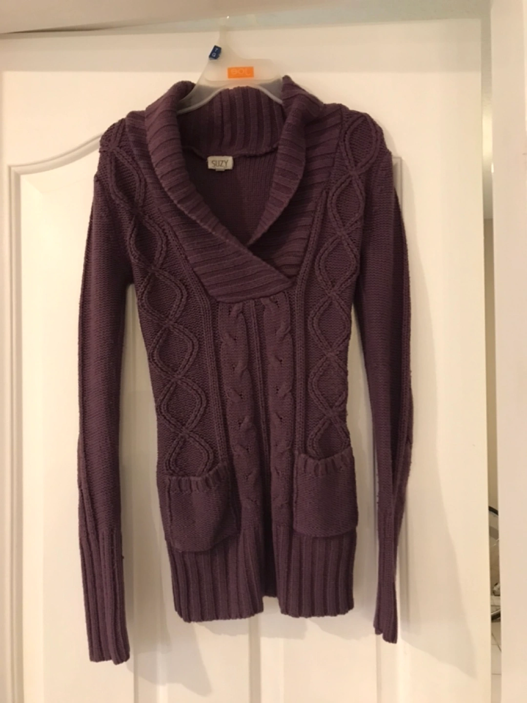 Women's purple fitted knit sweater. Size X/S. Long sleeves. Length 26”. Collared neckline. Two pockets. Have not worn it for a while as it does not fit me anymore. In good condition.
