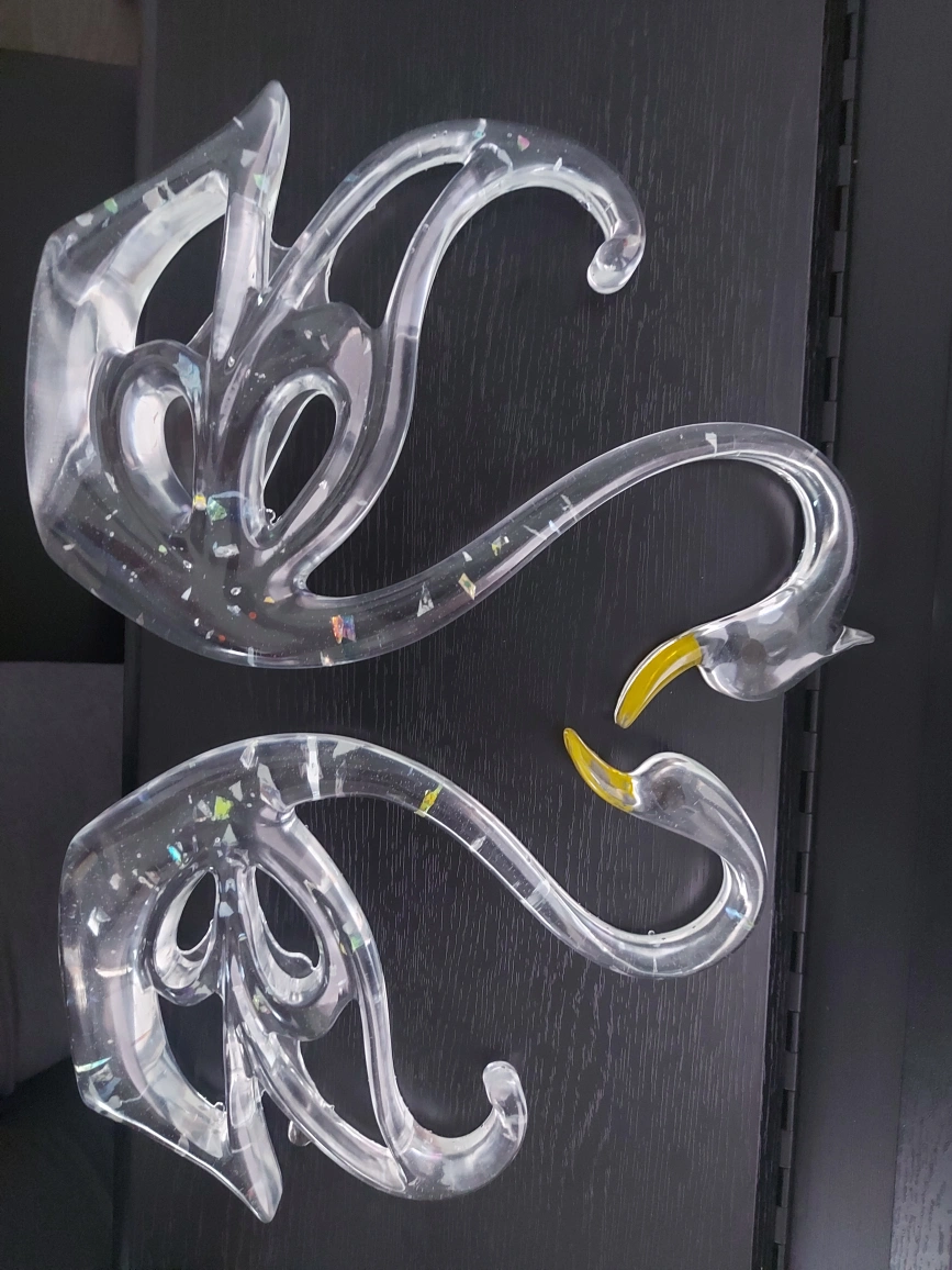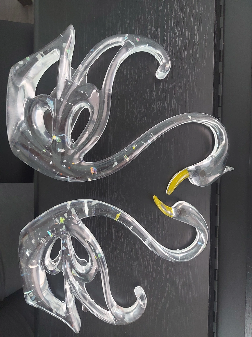 These are decorative swan objects! They're clear with some iridescent confetti inside. They would look great on a shelf or desk
