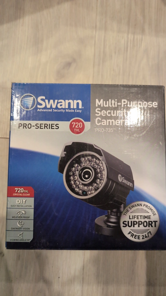 Selling a Swann Pro-Series 720 TVL multi-purpose security camera. It's brand new in the box and includes all installation accessories such as cable, mounting brackets, screws, power adapter and splitter. It has a weatherproof casing and day/night vision. The camera is indoor/outdoor IP67 rated.