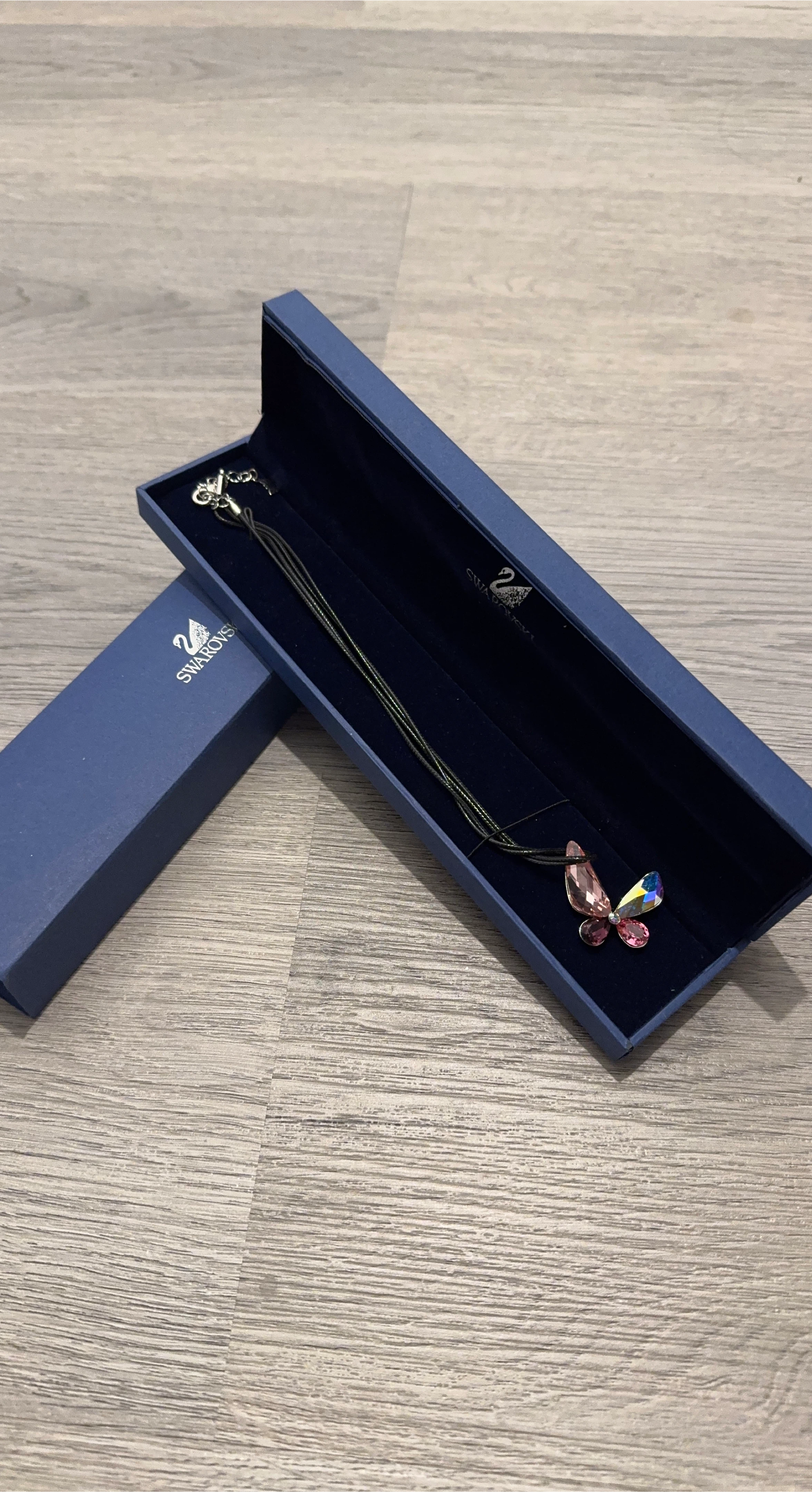 Selling a beautiful Swarovski butterfly pendant necklace. It features a delicate crystal butterfly on a black cord. The necklace comes with its original box. It's in great condition and ready to add a touch of sparkle to your style!