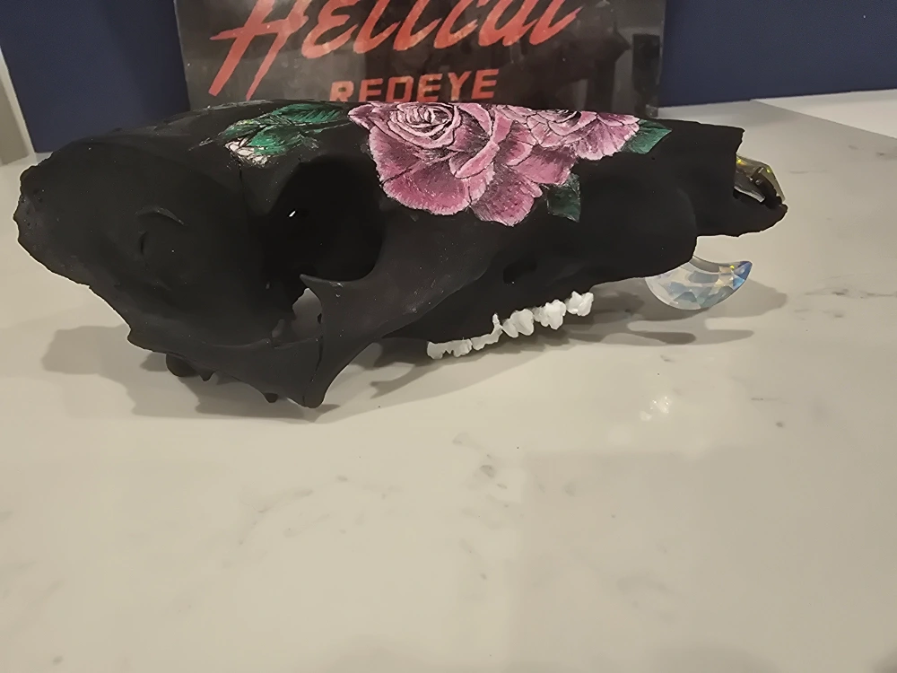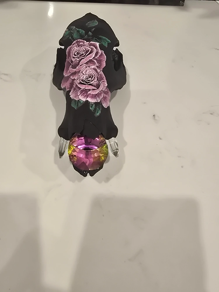 This is a Swarovski Crystal moon adorned Arizona Javelina skull. It has been painted black with roses and has 4 total Swarovski crystal moons - 2 in snout & 2 in place of tusks. It would make a great addition to any collection or as a unique piece of home decor CASH ONLY