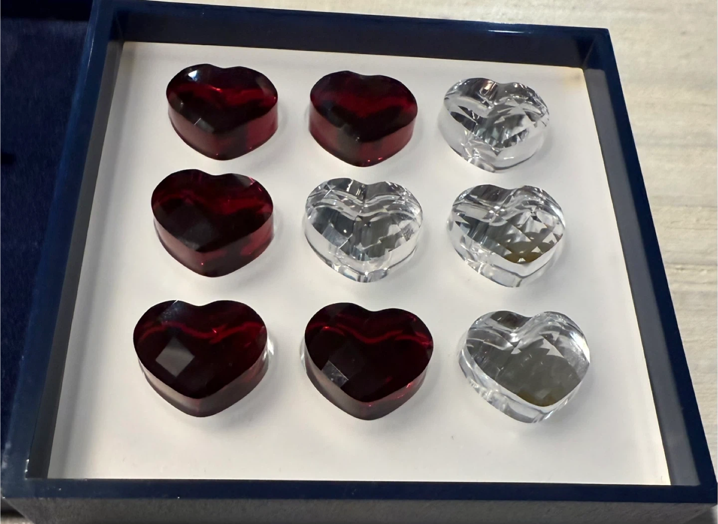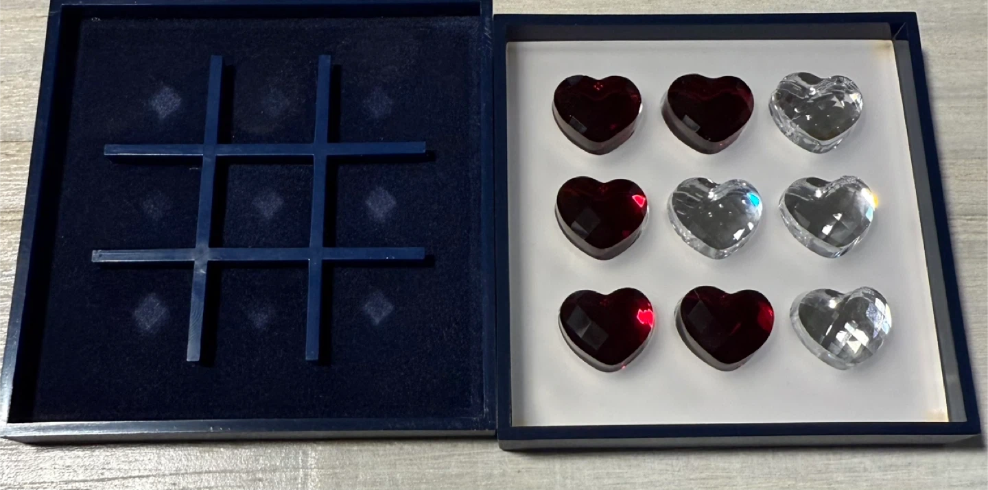 Selling a Swarovski Tic Tac Toe game! It comes with the original box and all the pieces. The set includes crystal hearts in red and clear, making it a beautiful decorative piece as well as a fun game to play