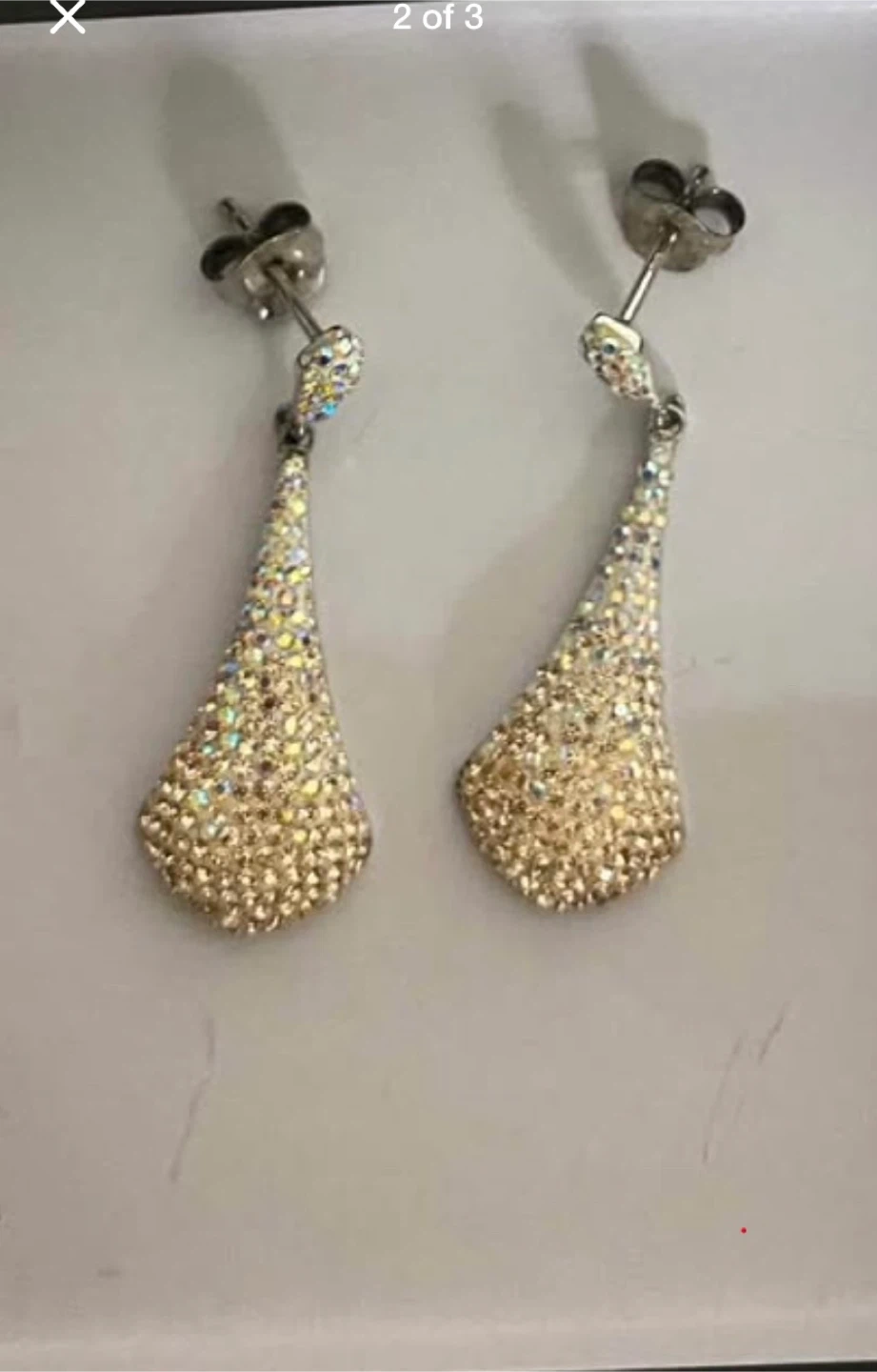 Selling a pair of sparkly dangle earrings. They have a unique shape and are covered in shimmering stones. Perfect for adding a touch of glamour to any outfit!