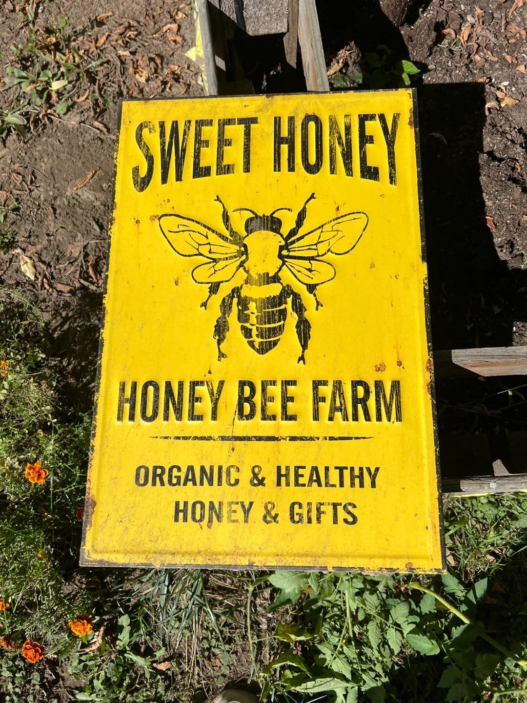 Selling a "Sweet Honey Honey Bee Farm" sign! It's yellow with black lettering and a bee design. Perfect for adding a rustic touch to your space