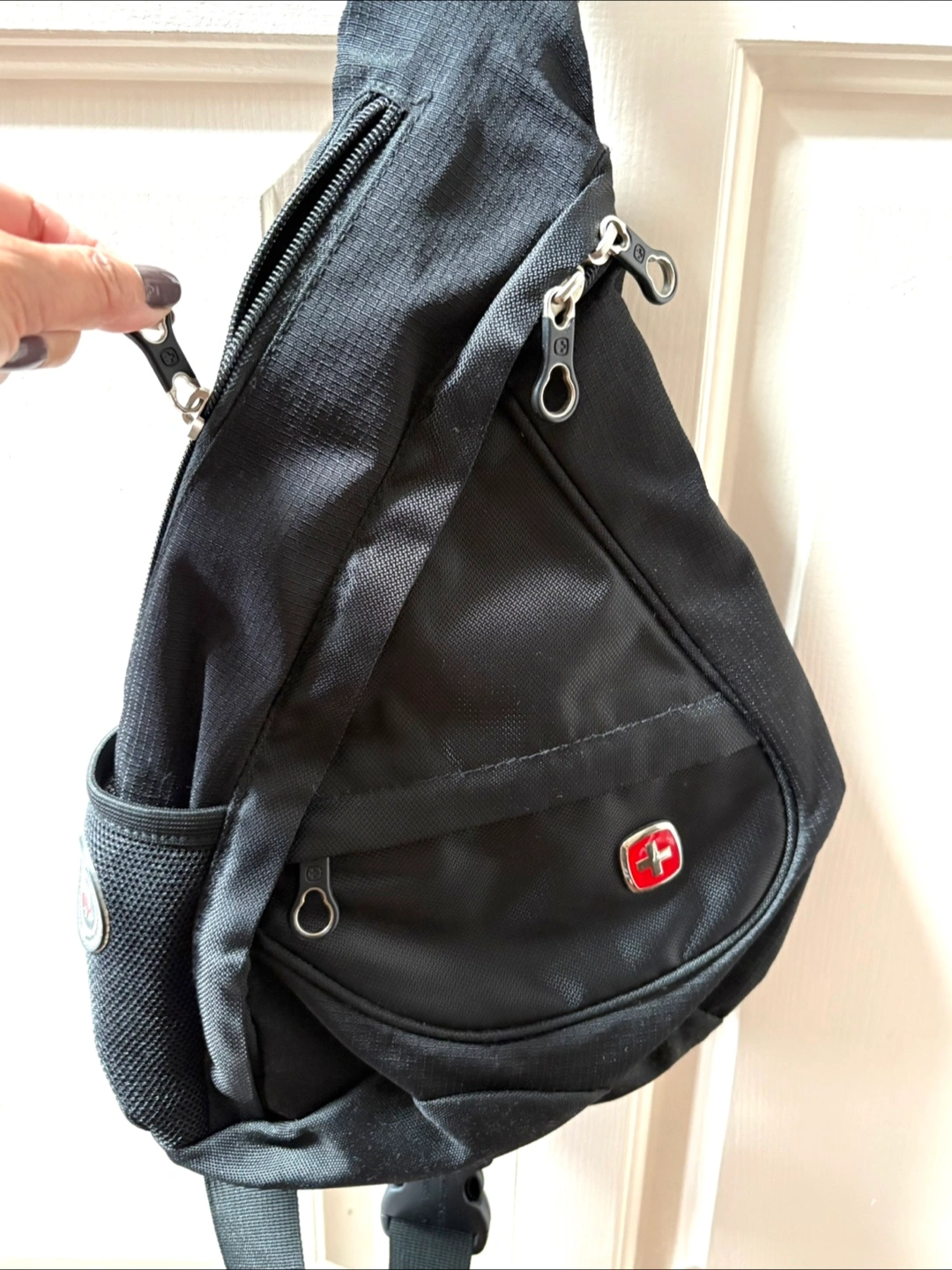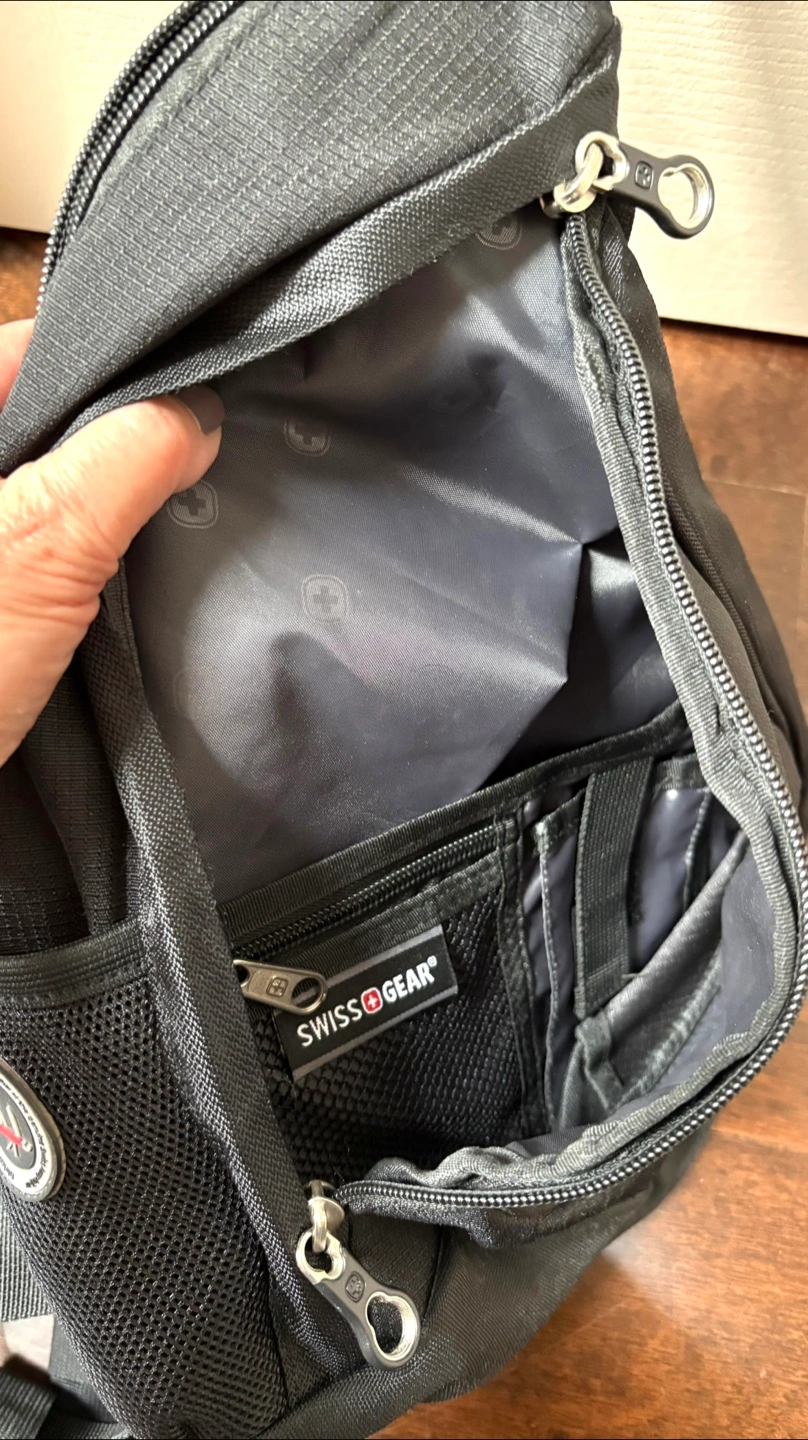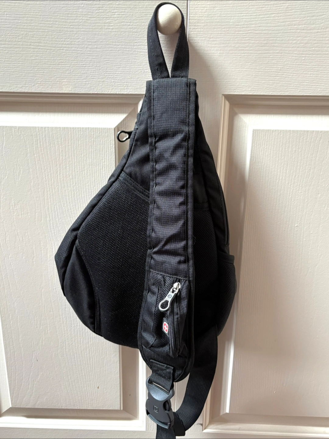 Looking to sell my SwissGear sling bag! It's in great shape and perfect for carrying your essentials. It's black and has a few different zippered compartments for organization. 16” long 11” wide