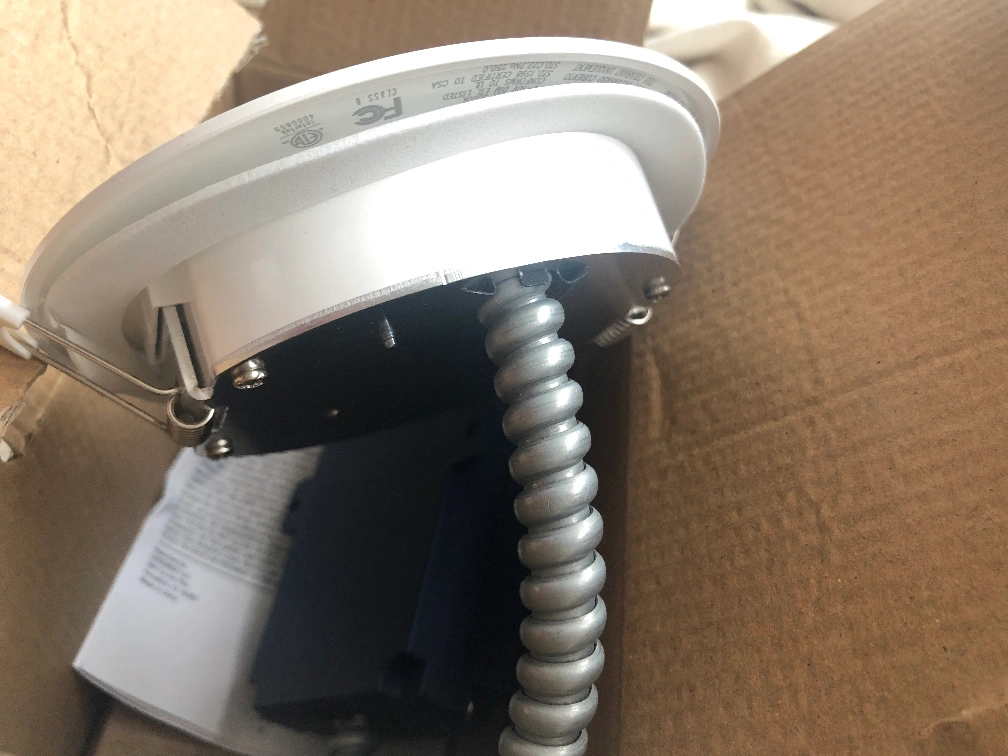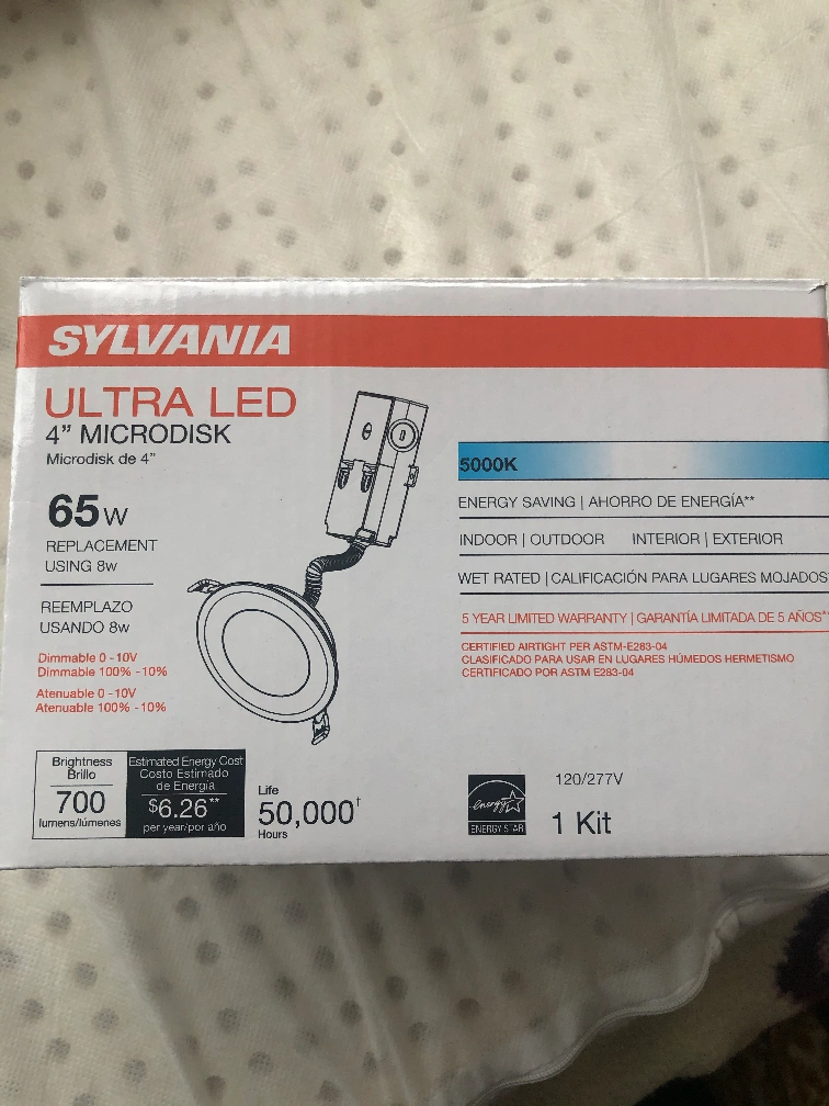 Selling a brand new Sylvania Ultra LED 4" Microdisk light. It's a 65W replacement using only 8W, and has a brightness of 700 lumens. It's suitable for indoor and outdoor use, and is also rated for humid environments. It has a 5-year limited warranty. The light has a colour temperature of 5000K and a rated life of 50,000 hours. The box is included