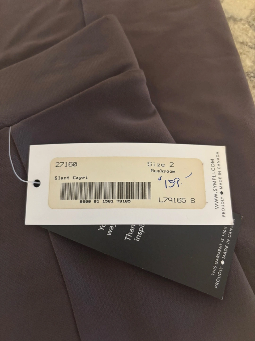 These Sympli Slant Capri pants are in a lovely mushroom colour and size 2. They're made in Canada! Originally bought for $159. New with tags Priced to sell!