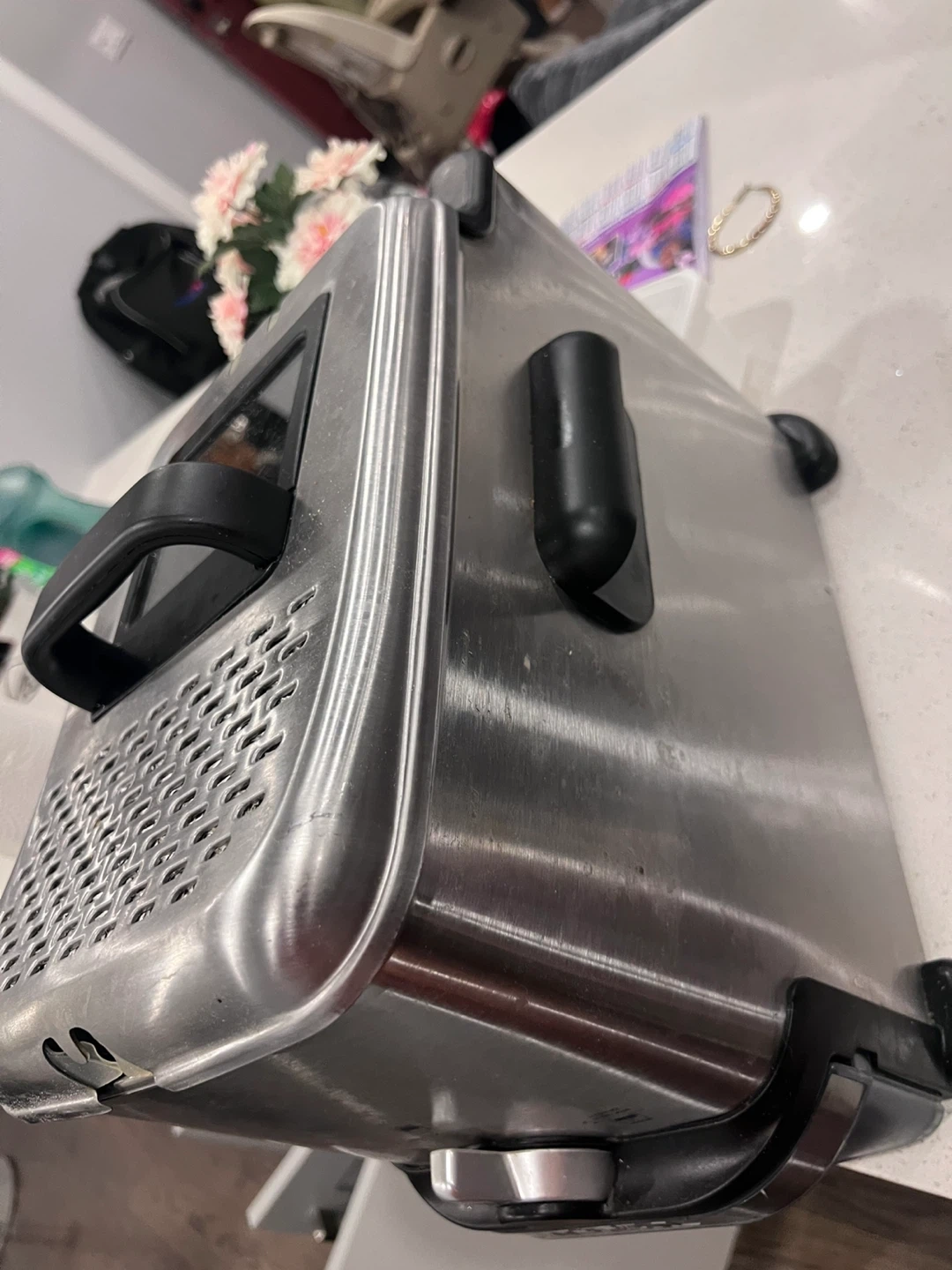 Selling a T-Fal deep fryer in good condition. It's perfect for making fries or other fried foods at home. It has a stainless steel finish and a black base.