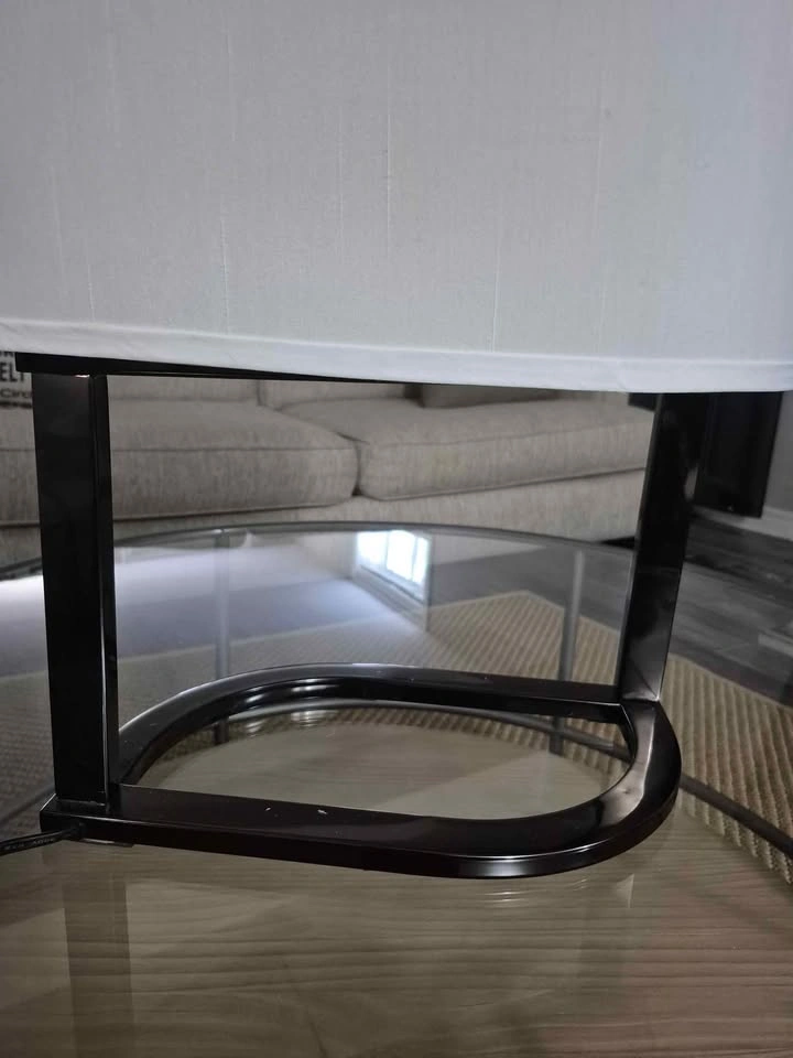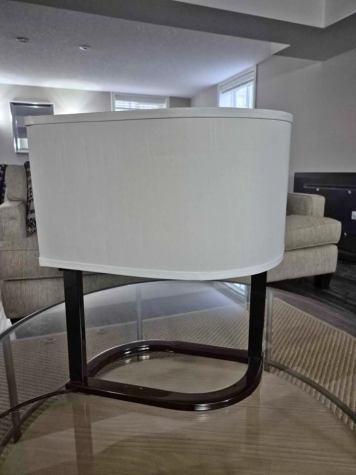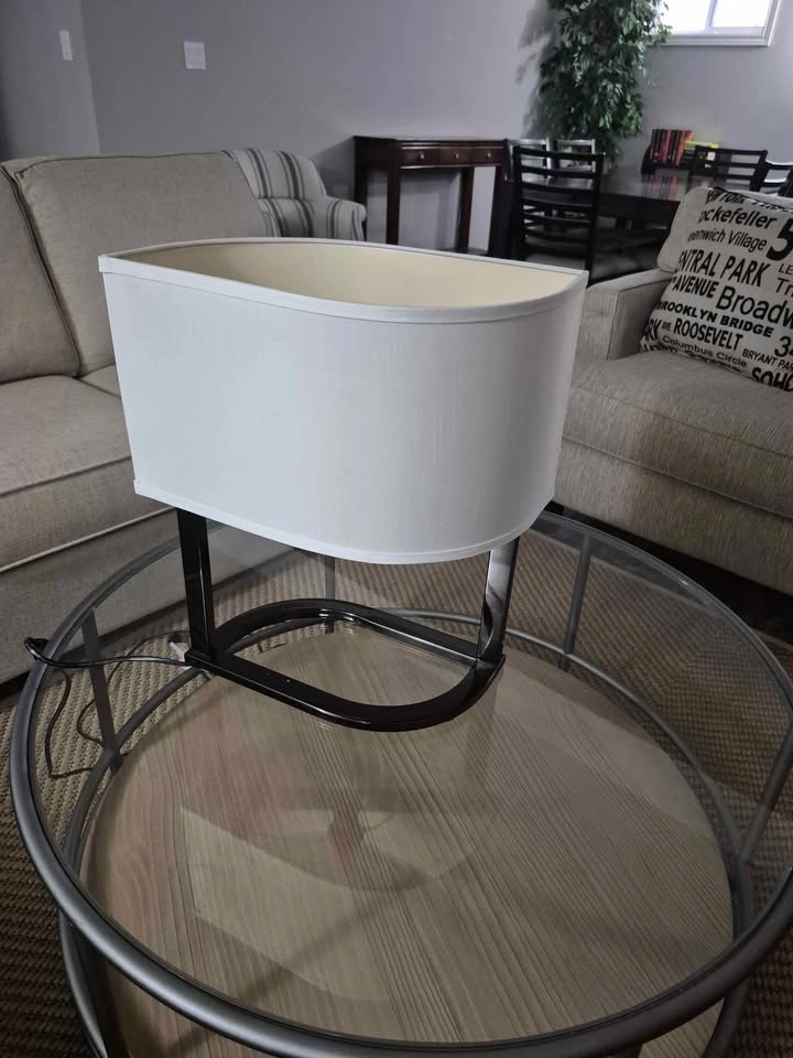 This used lamp features a sleek black base and a modern white shade, perfect for adding a touch of elegance to any room. While it's in used condition, it still shines brightly and functions perfectly.