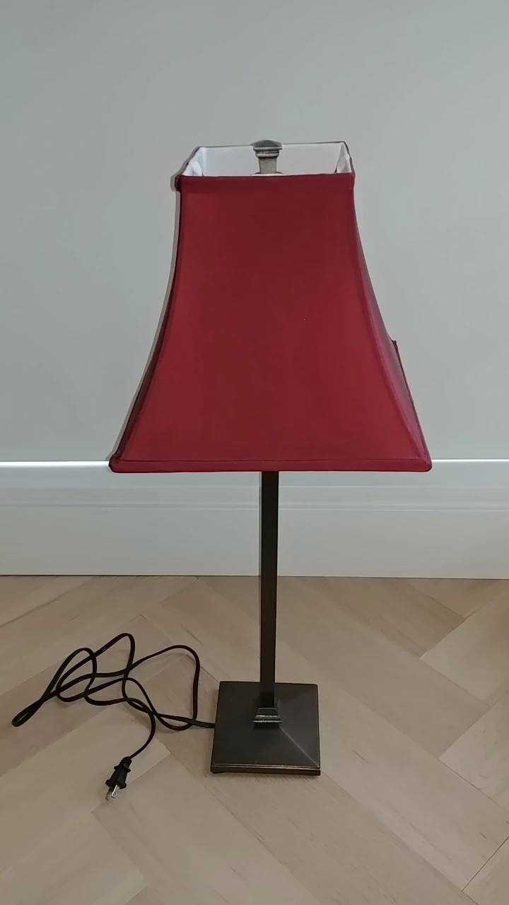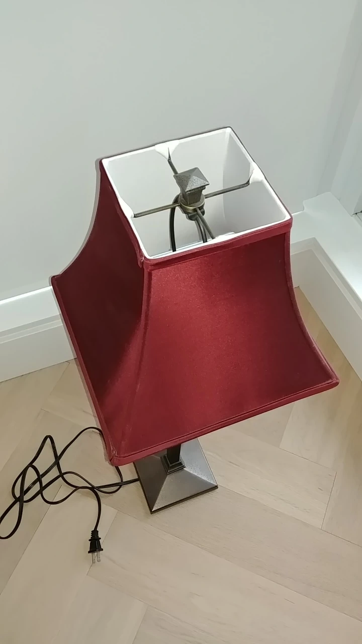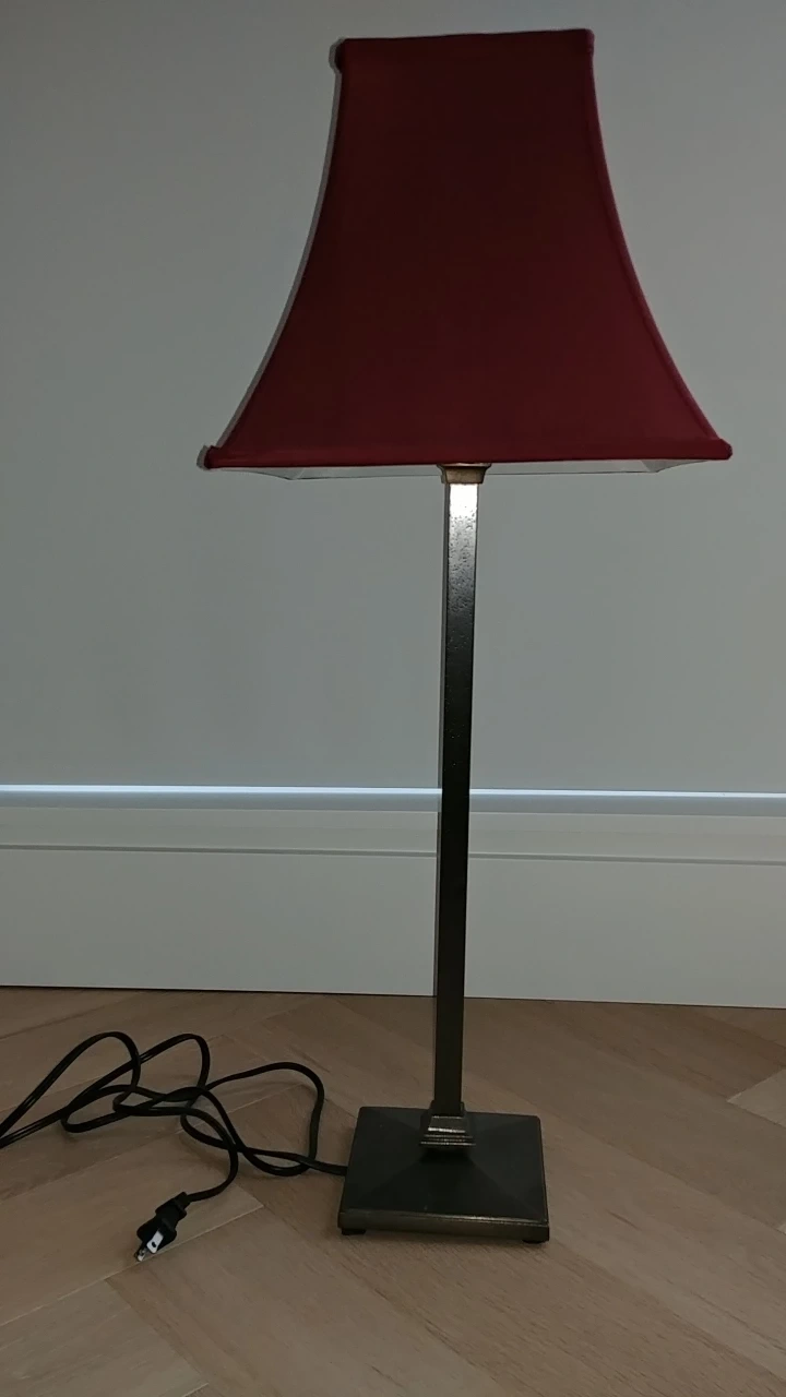 Tall table lamp with a burgundy lampshade. The lamp is made of metal. Silk lamp shade from Restoration Hardware. 11" square.