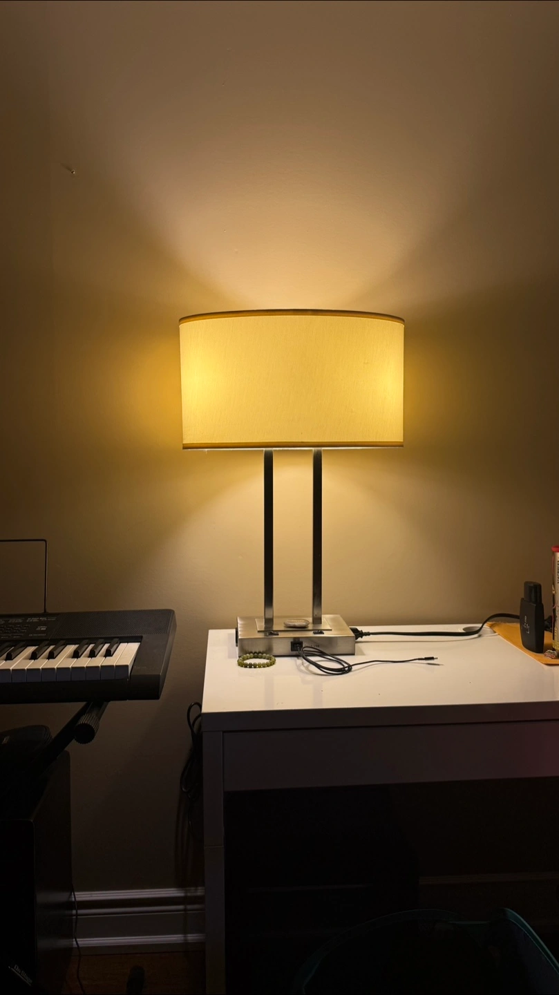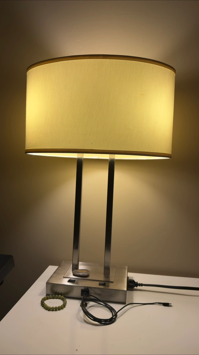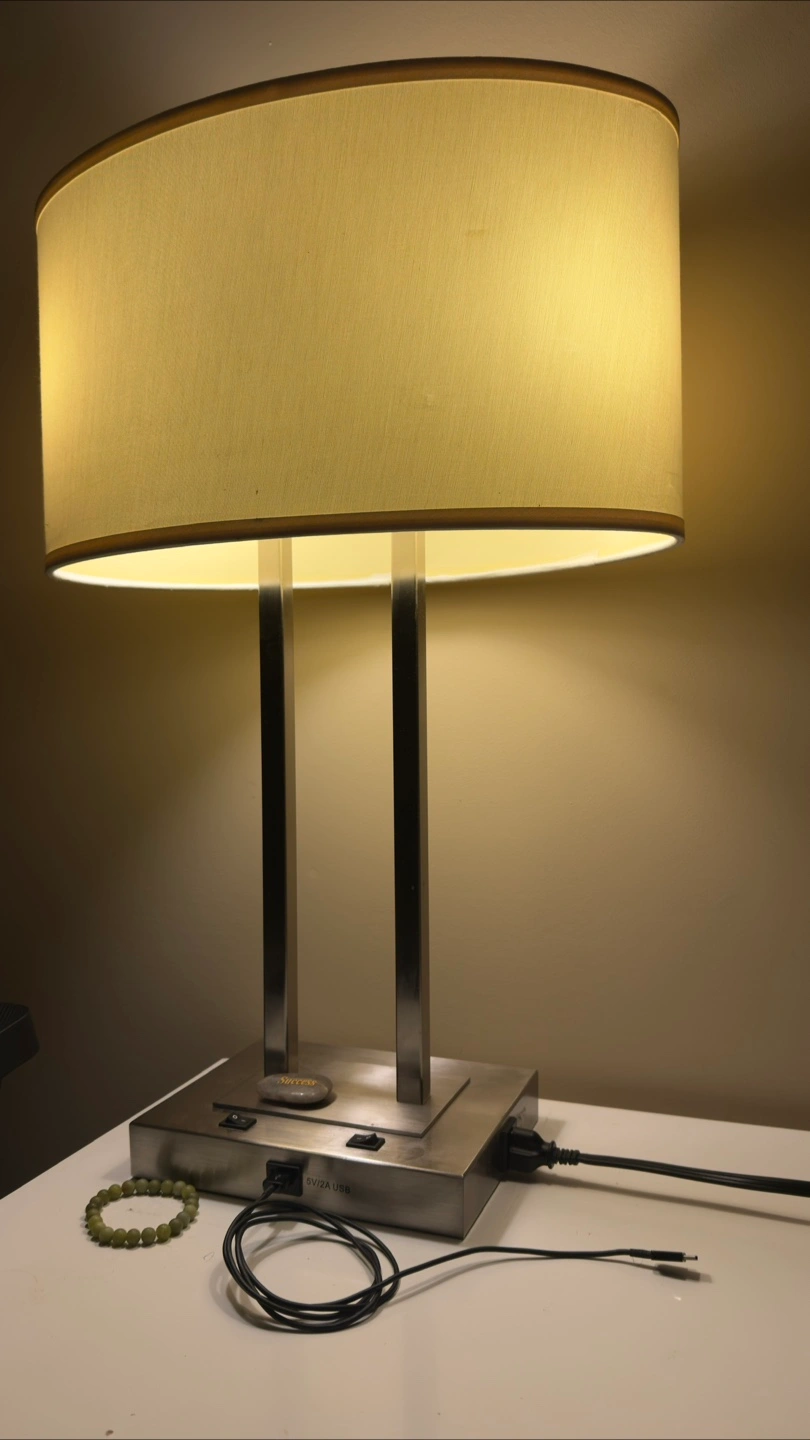 This is a table lamp with shade and a brushed stainless steel metal base. It also features a built-in USB charging port on the base, perfect for charging your devices while you work or relax and also has Ac outlets. Perfect for a bright warm a comfortable lighting.