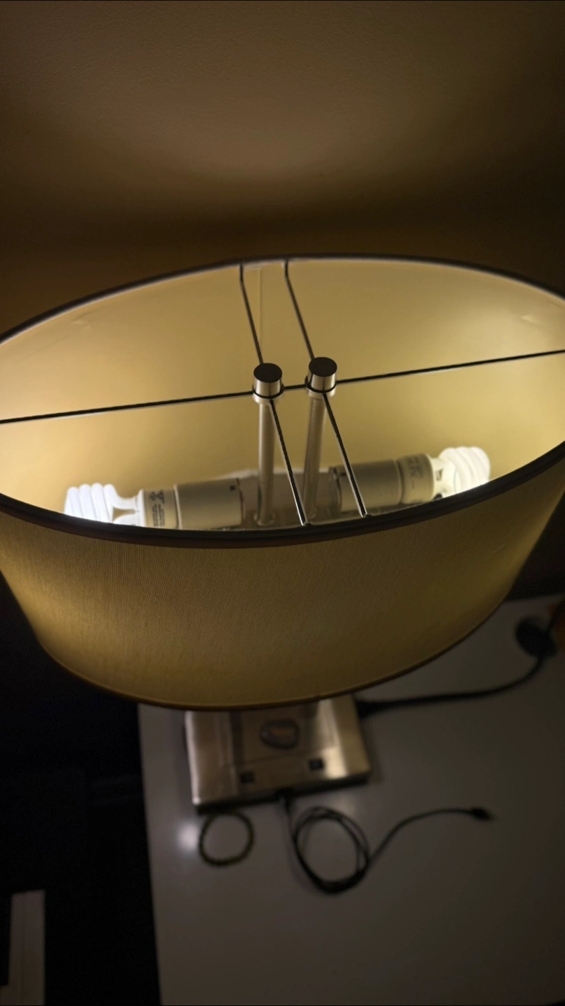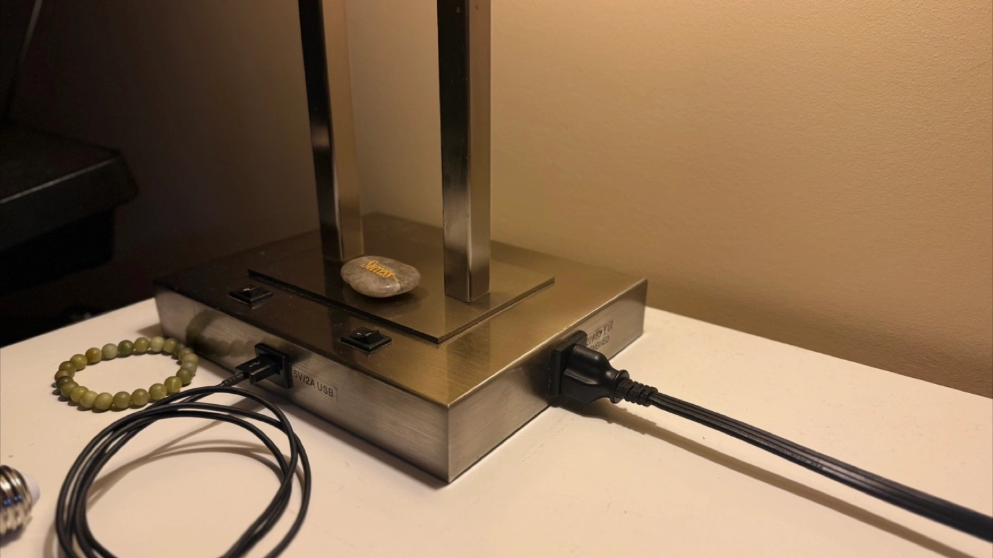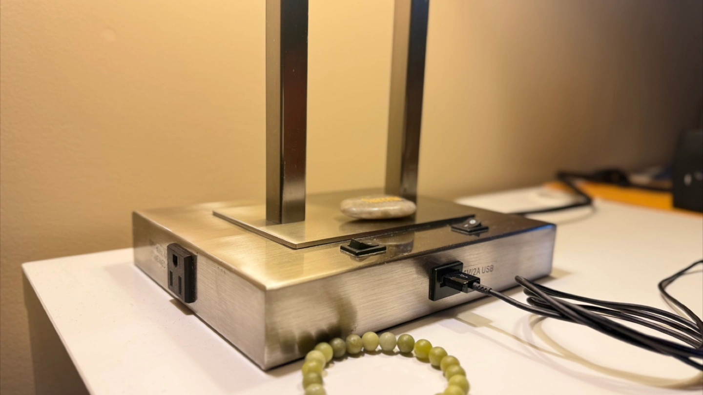 This is a table lamp with shade and a brushed stainless steel metal base. It also features a built-in USB charging port on the base, perfect for charging your devices while you work or relax and also has Ac outlets. Perfect for a bright warm a comfortable lighting.