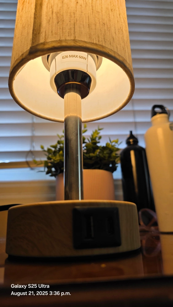 Here's a handy table lamp that's perfect for a bedside table or desk! It has a wooden base and a neutral-toned shade. Plus, it comes with built-in USB ports so you can easily charge your devices retail price is $30 with taxes. brand new . never used. comes in box