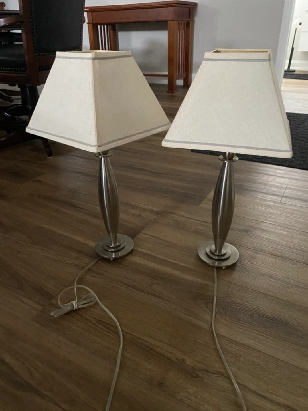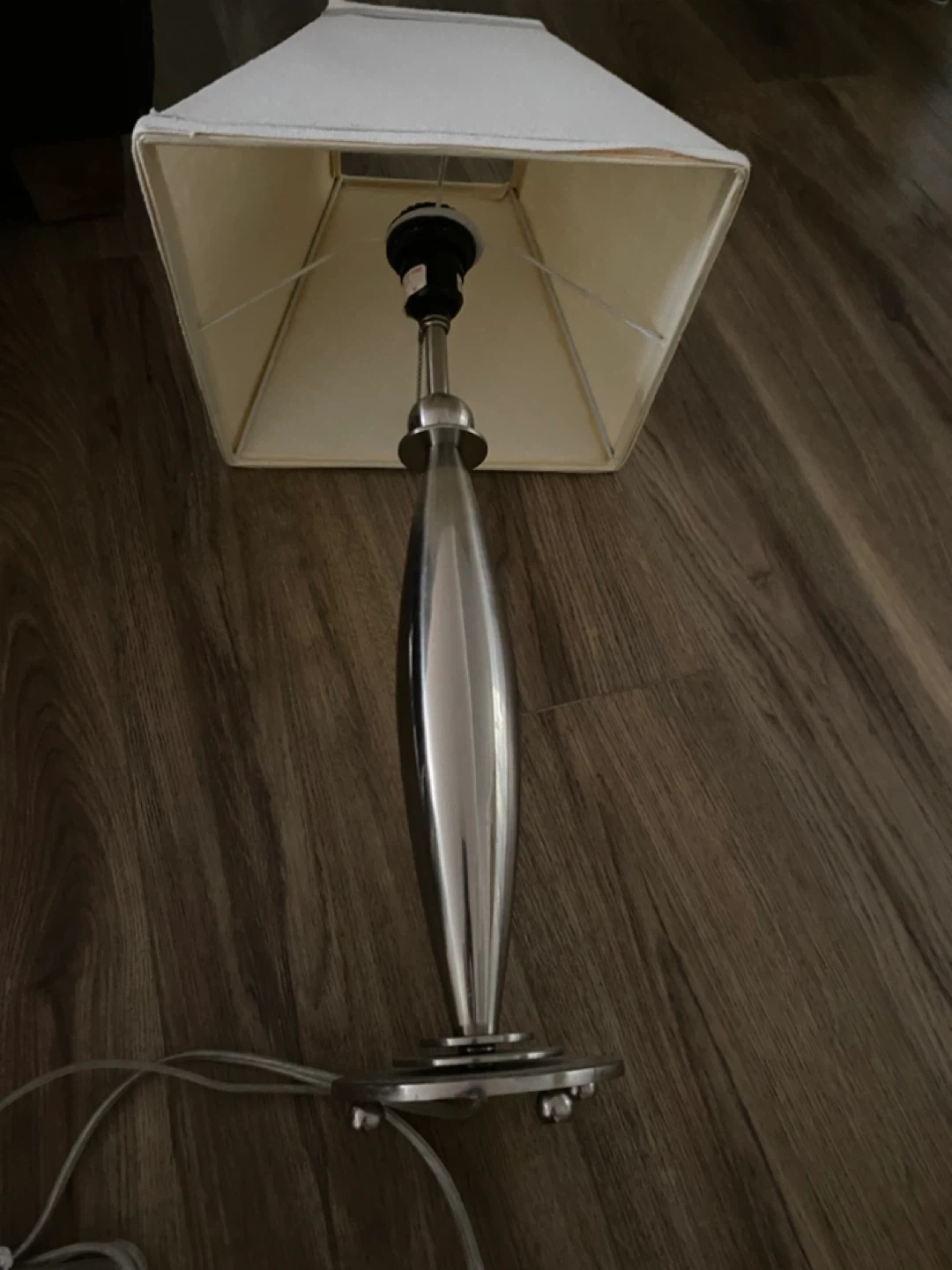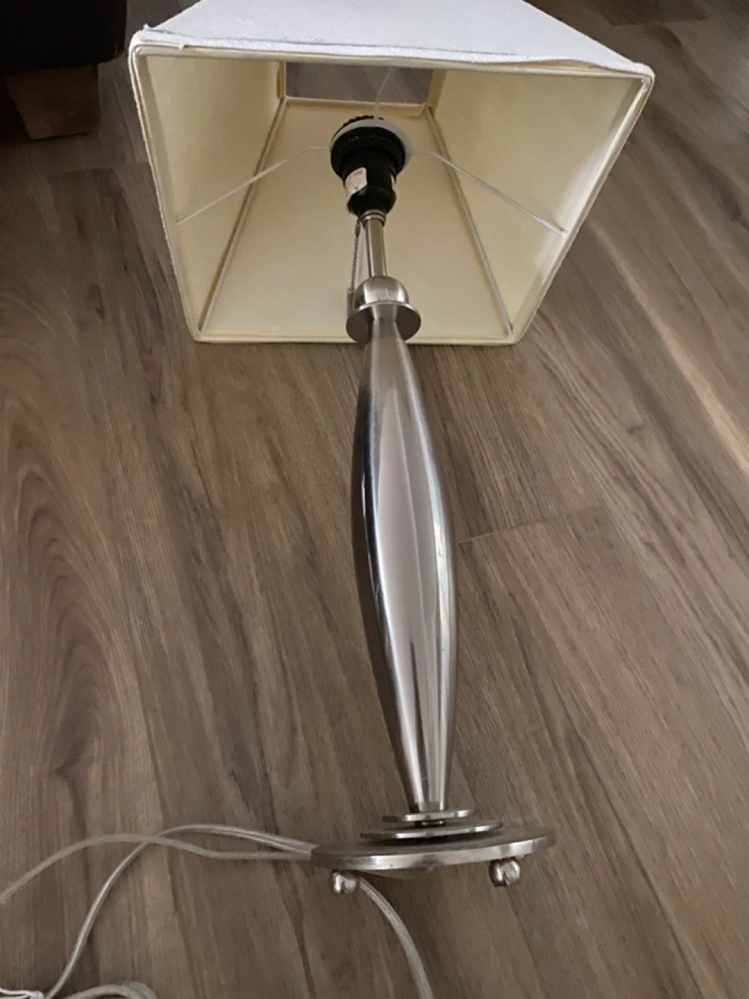 Selling a table lamp with a sleek, silver-tone base and a white square shade. It's in great shape and would look lovely in any room. Perfect for adding a touch of elegance to your space!