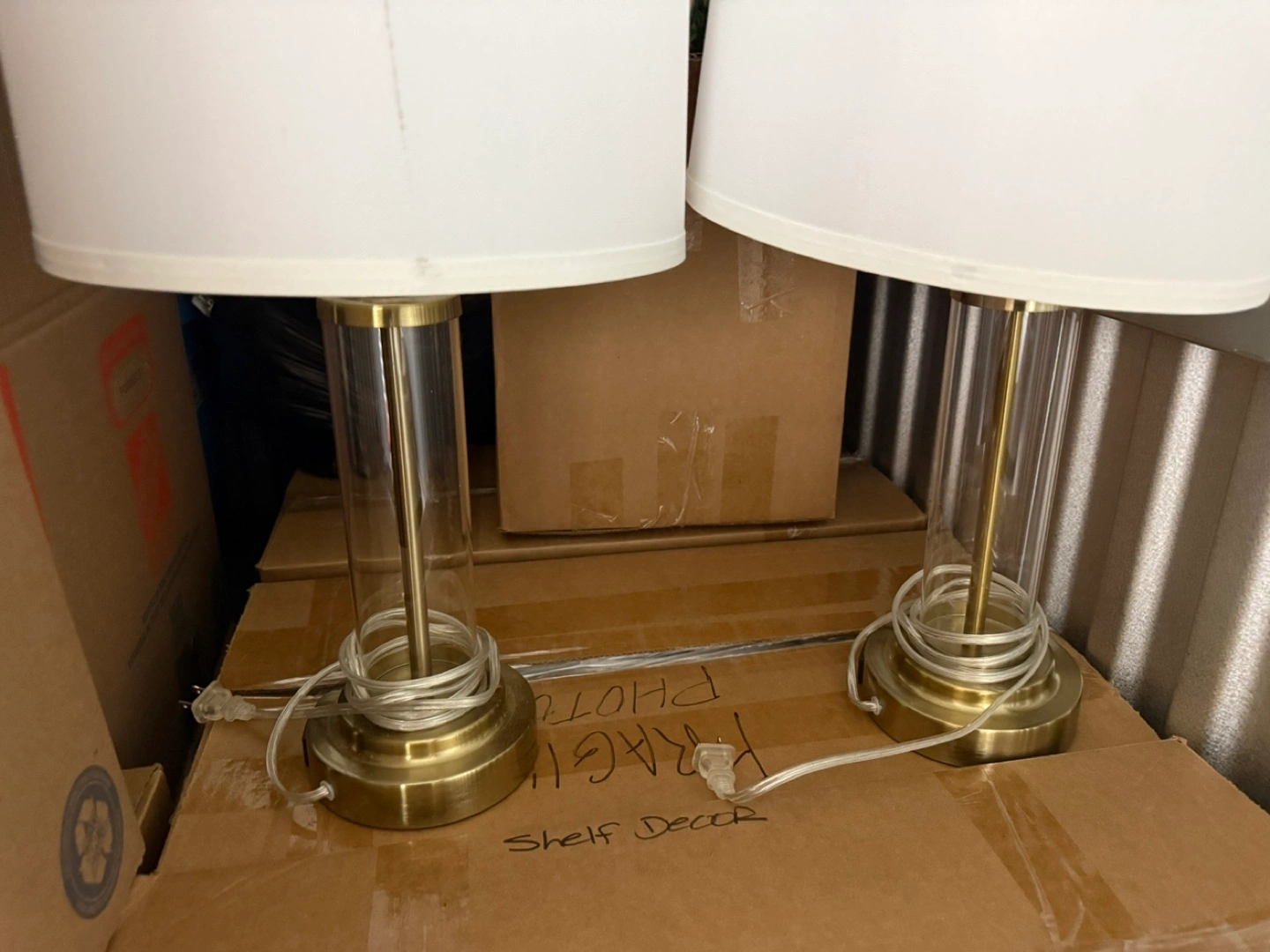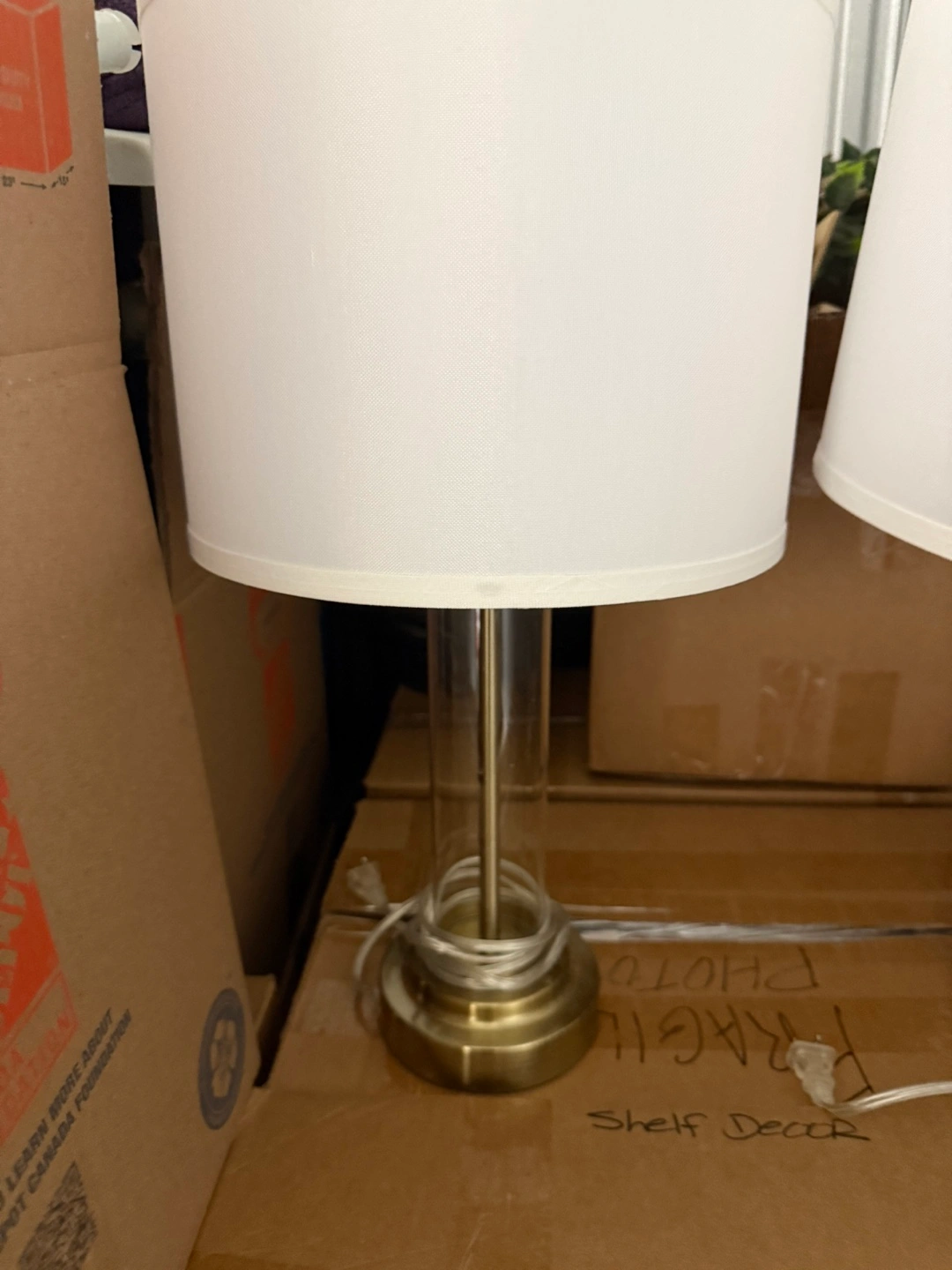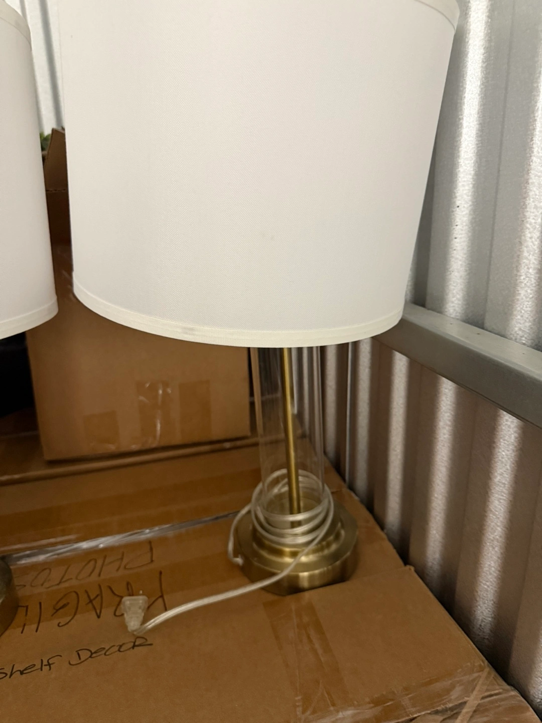 Selling a table lamp that would look great in any room. It features a clear glass body with a gold-tone base and a crisp white shade. A simple way to brighten up your space!
