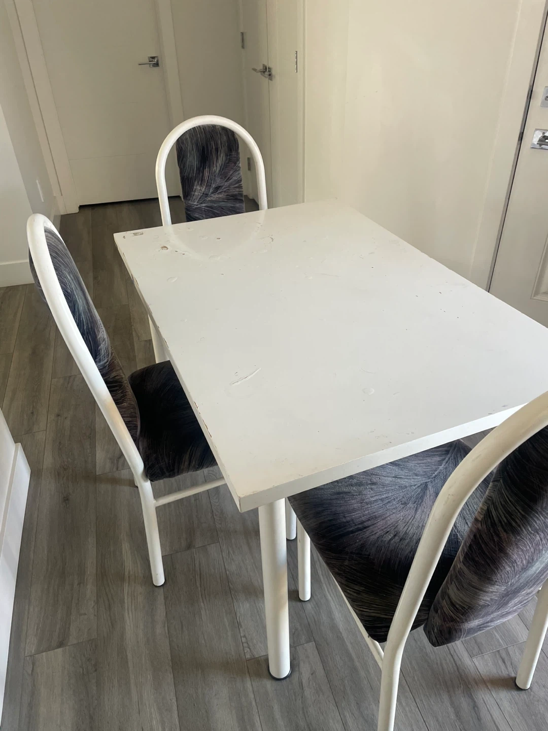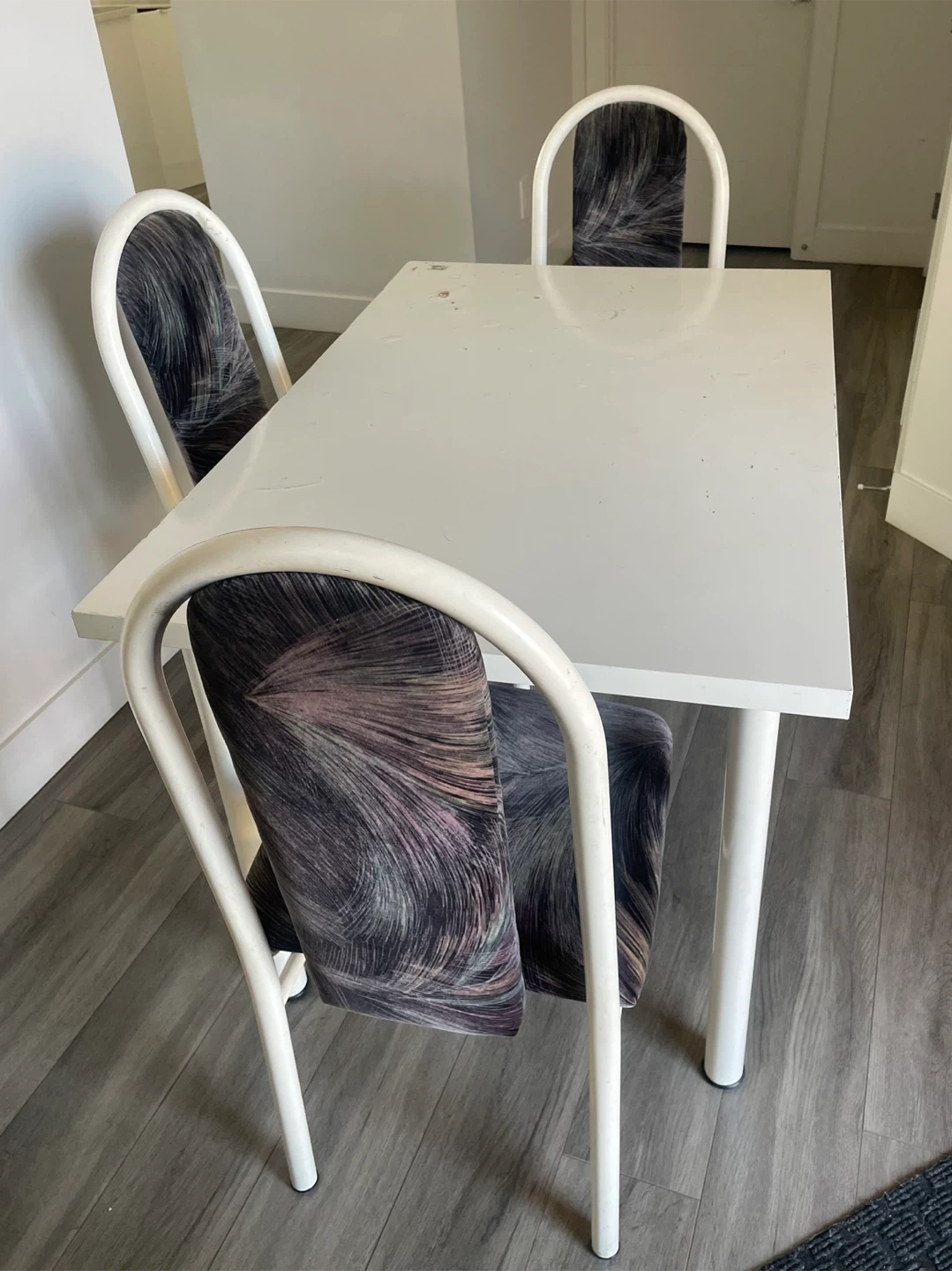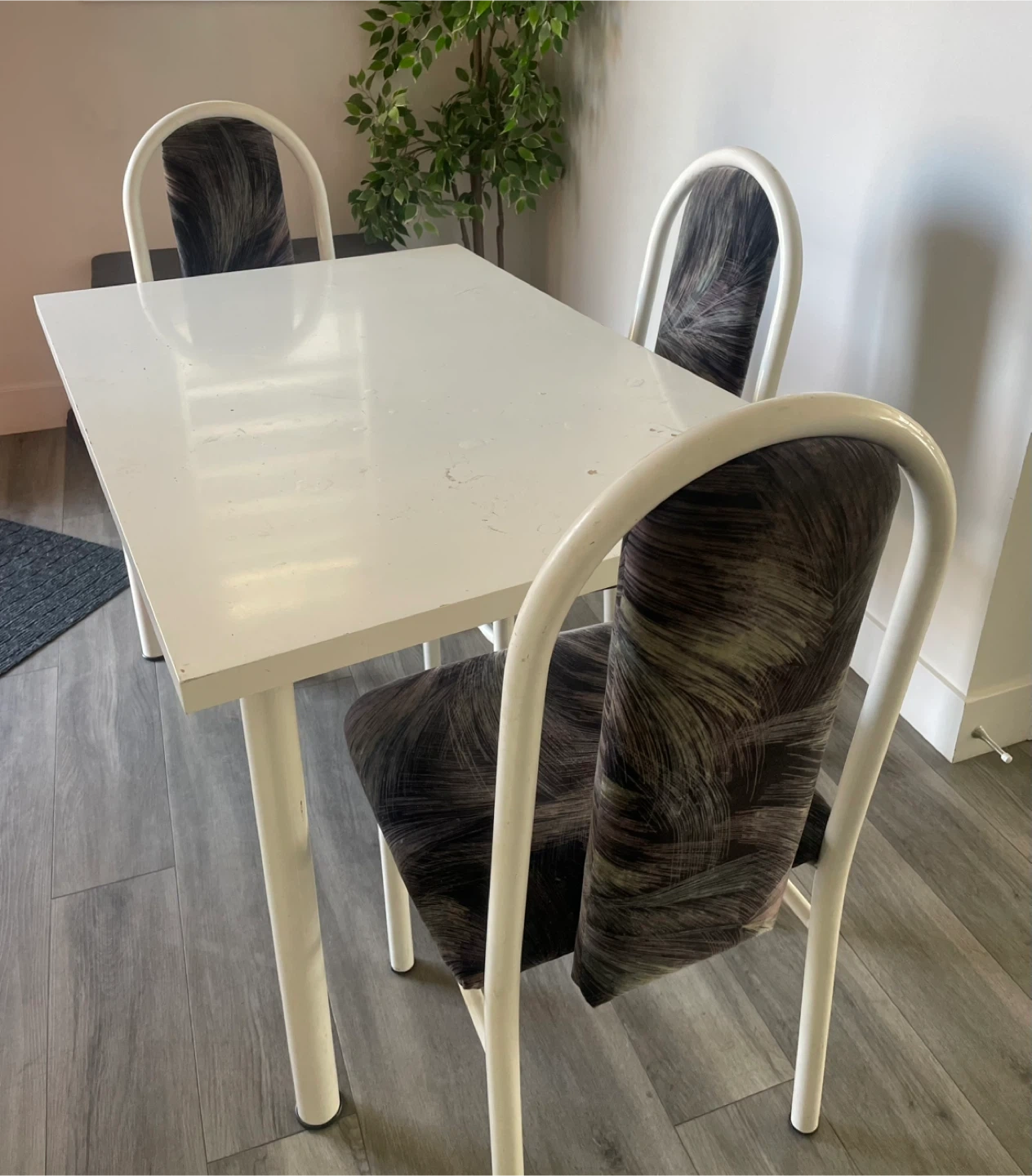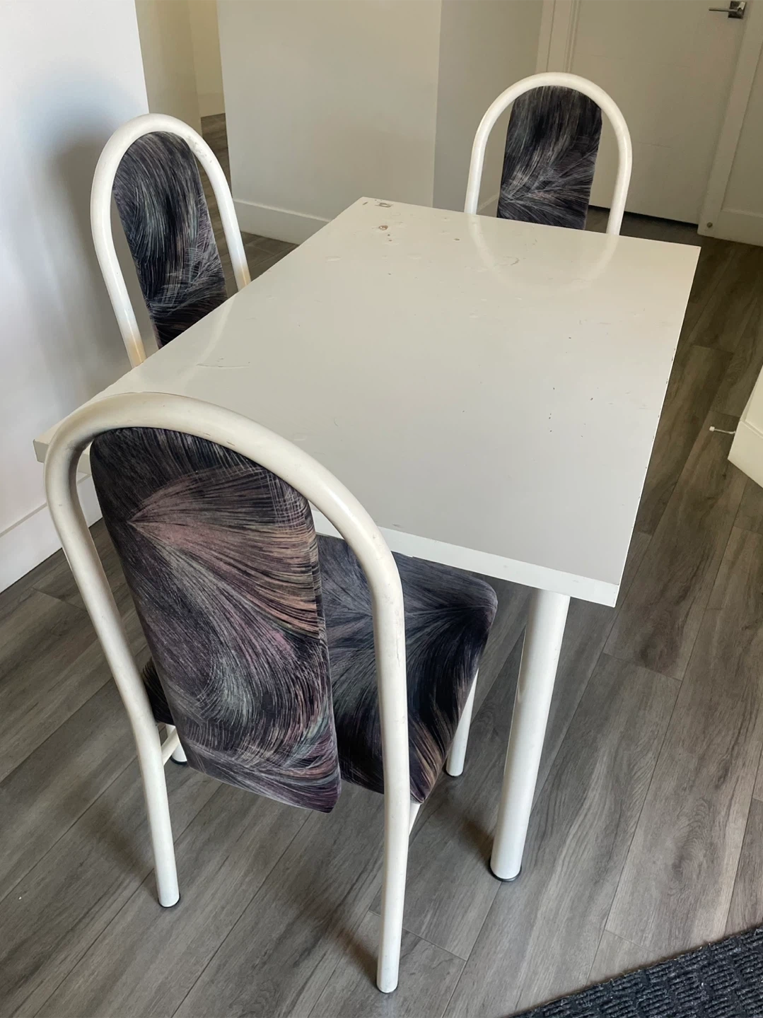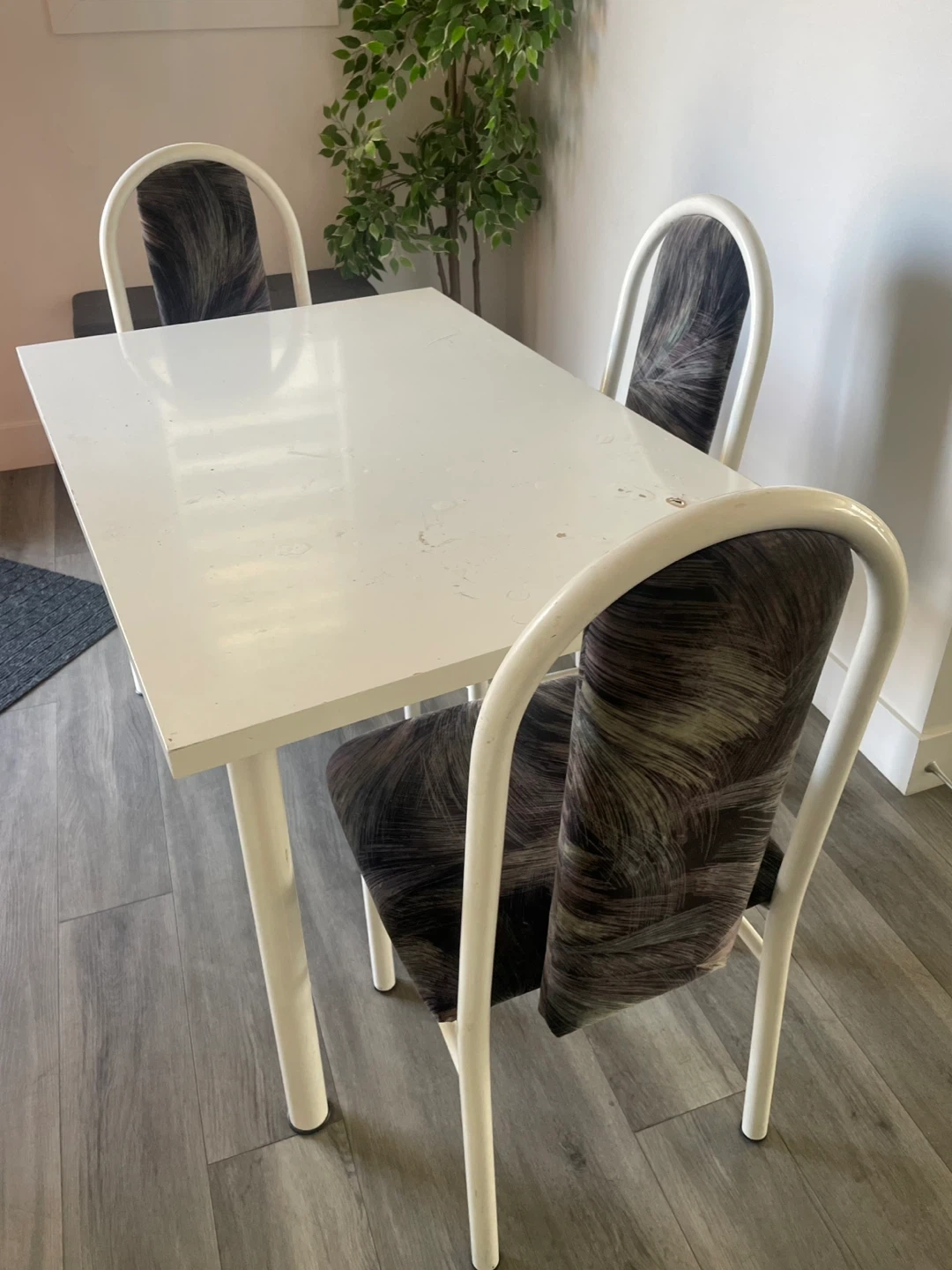 • $80 For Everything. White Table, The Chairs Have Unique Patterned Fabric. Perfect ForA Small Dining Area Or Kitchen! It's In Good Condition Some Wear As Used. *Table Can Be Dismantled* Cash & Pick Up Only Can't Deliver. FIRST COME FIRST SERVE NO HOLDS