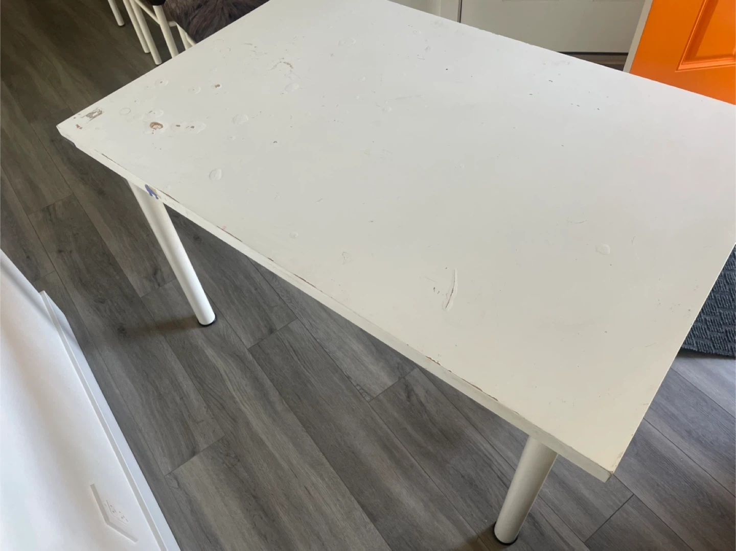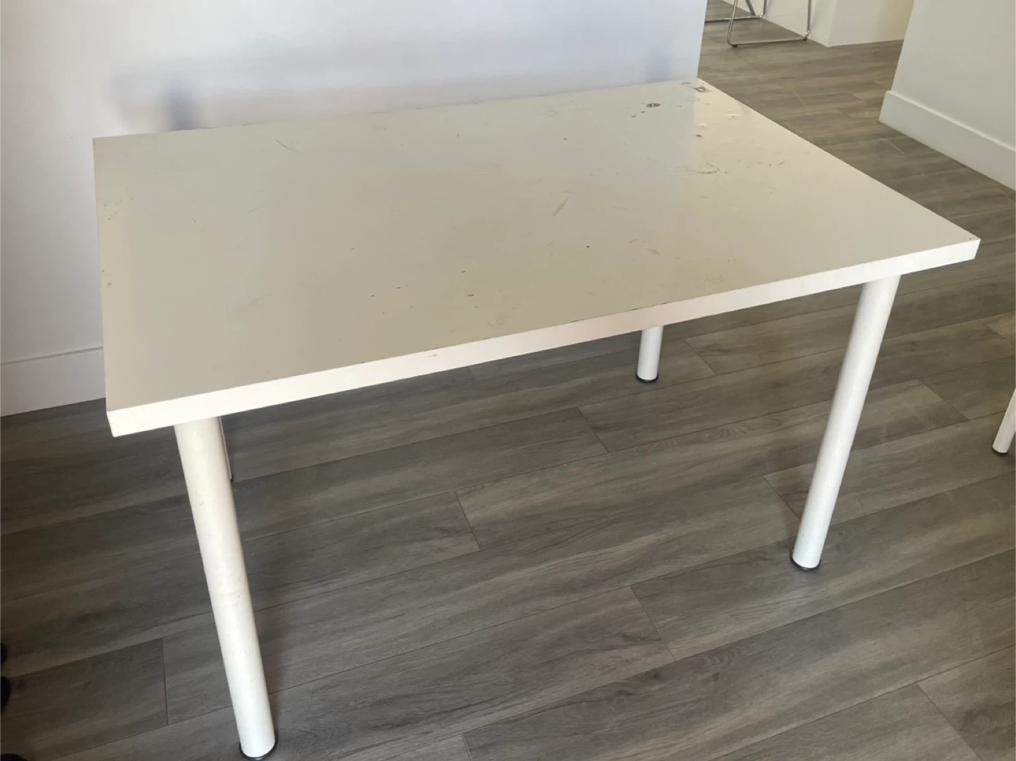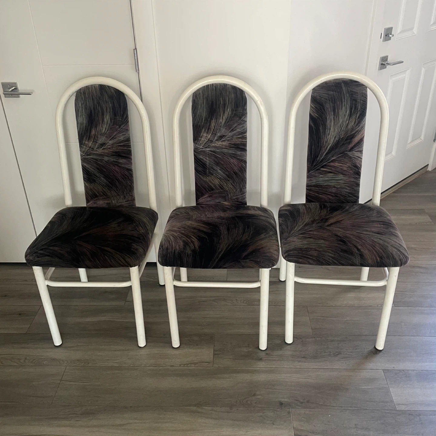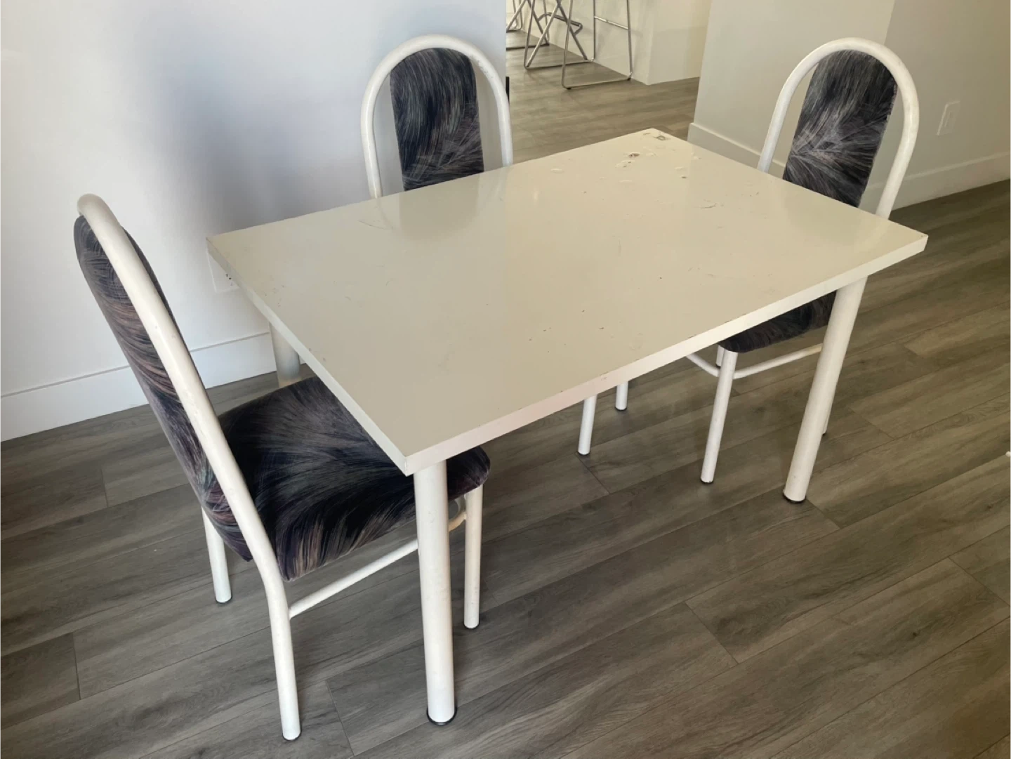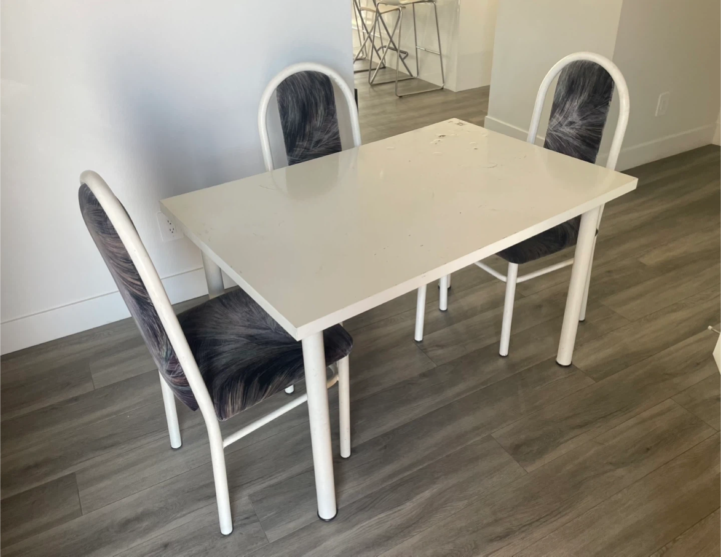 • $80 For Everything. White Table, The Chairs Have Unique Patterned Fabric. Perfect ForA Small Dining Area Or Kitchen! It's In Good Condition Some Wear As Used. *Table Can Be Dismantled* Cash & Pick Up Only Can't Deliver. FIRST COME FIRST SERVE NO HOLDS