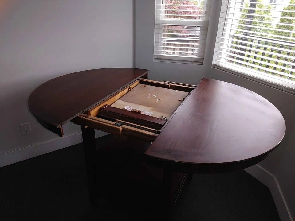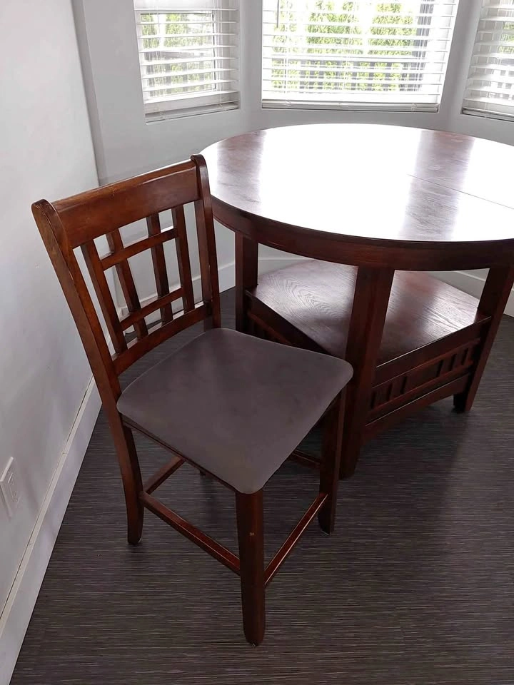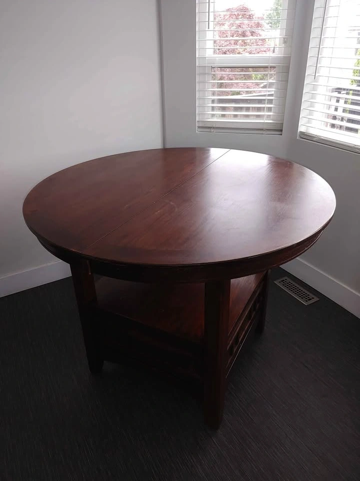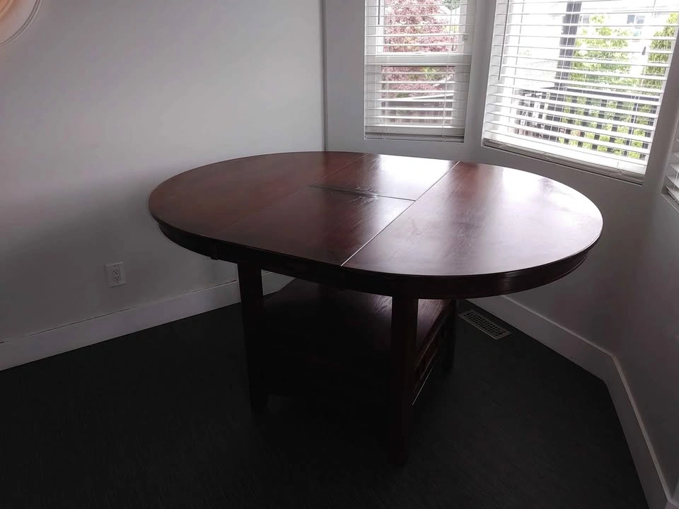 A few marks on top of table. One chair has a broken cross piece which needs to be fixed before using it. All other chairs are fine. The table is 3' high and 4' round without extension. The extension is 17.5" wide. So with the extension the table is 4' wide by 5' 5.5" long.