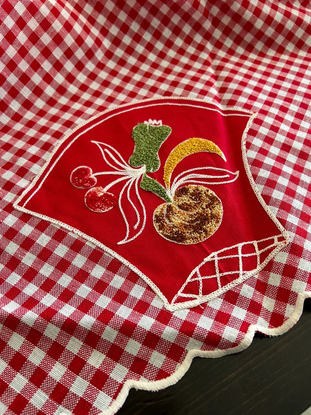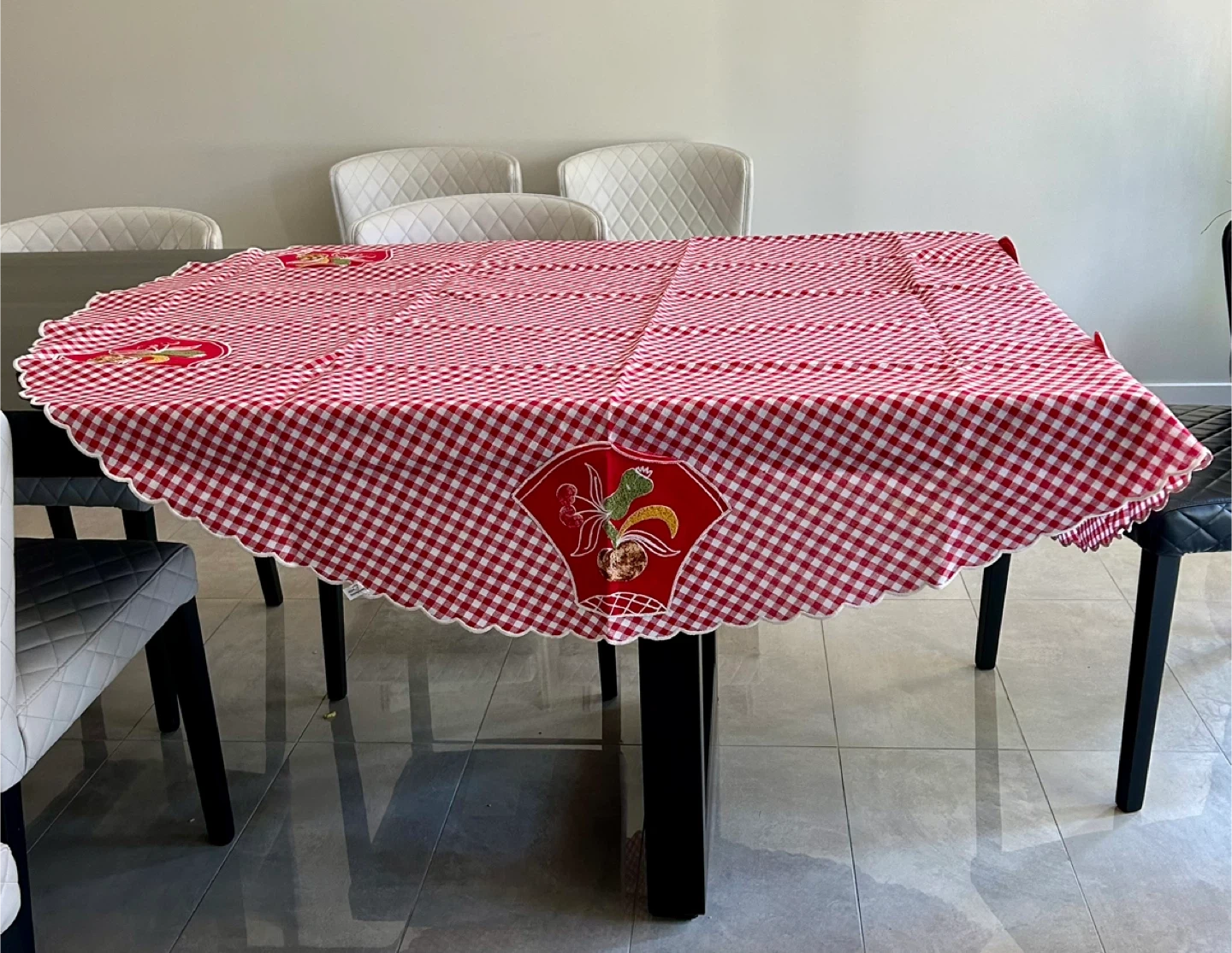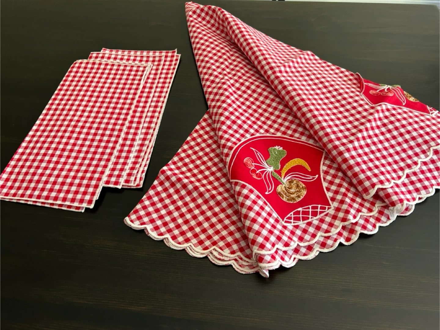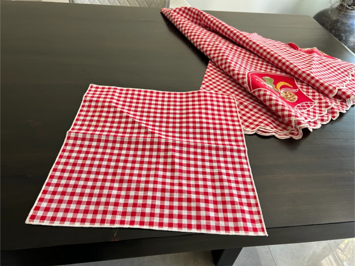 Round tablecloth 66” with decorative pockets for 6 napkins. Napkins 16” square. 100% cotton.