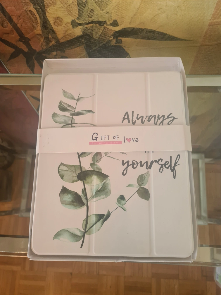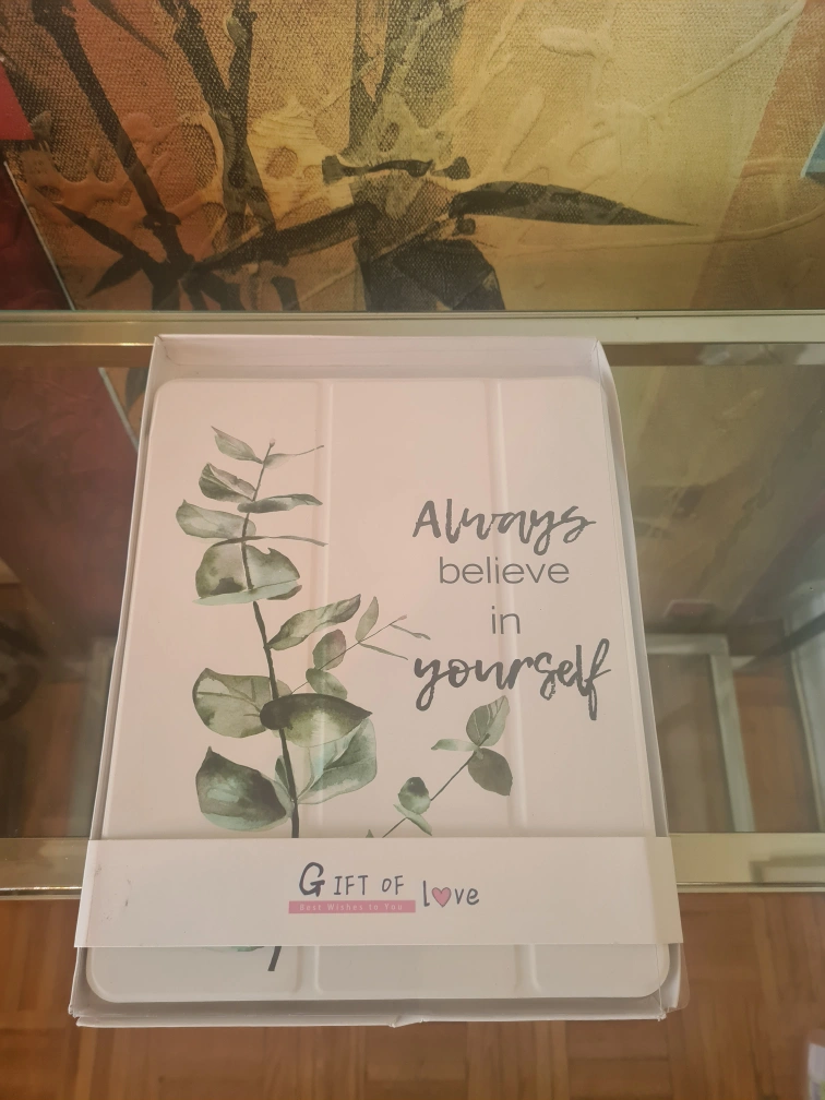 New tablet case. Features a watercolour eucalyptus design and the words "Always believe in yourself". Gift of Love branding.