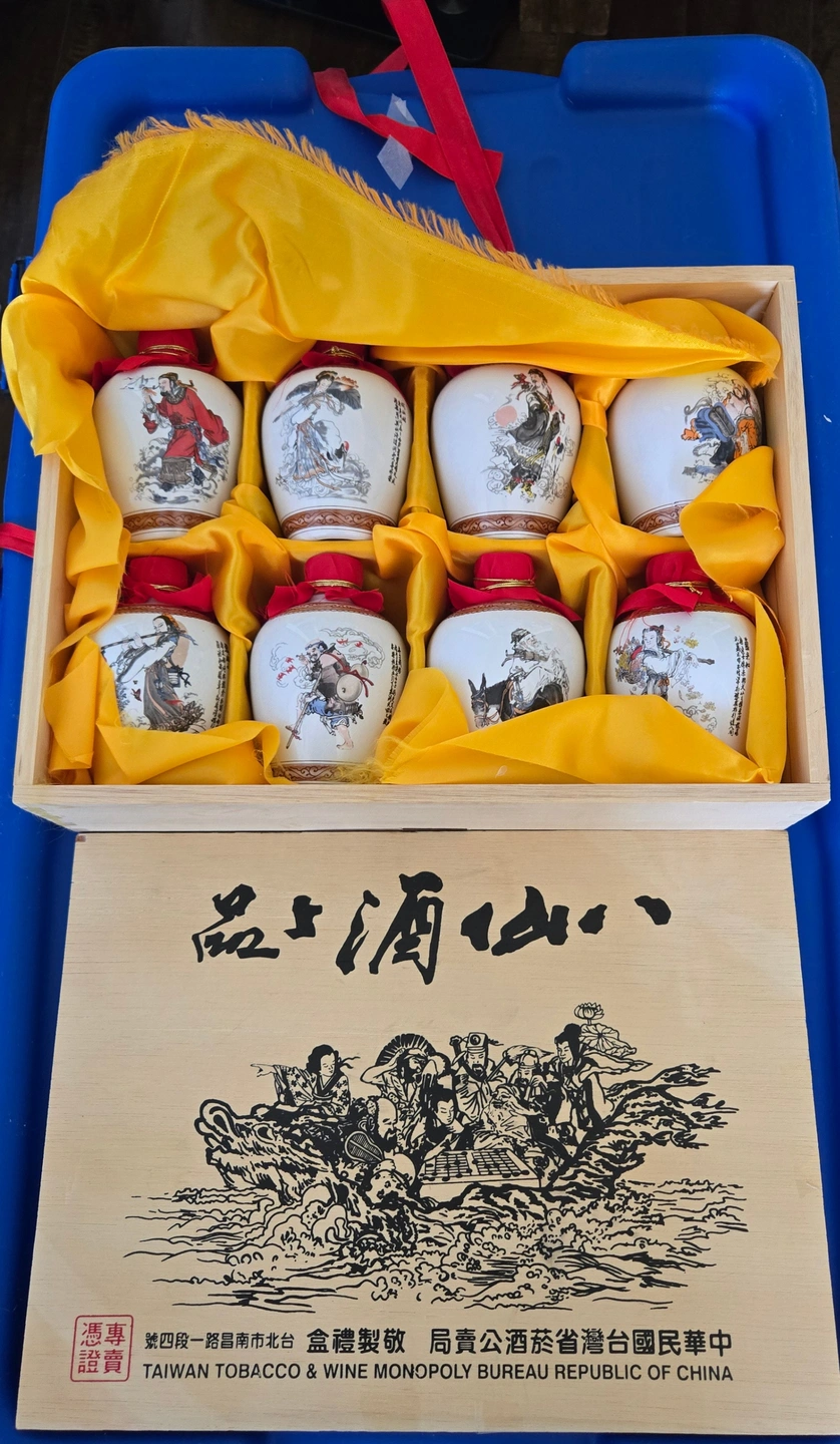 Wood BIRTHDAY BOX with 8 Ceramic Decanters, each depicting one of the 8 Fairies / Immortals," Eight Fairies in Birthday Celebration " started from the Tang Dynasty. This is a Vintage Set Meant to be displayed! Wood Box Measurement: 13''x9-1/2''x3-1/4'' Decanters Measure 4-1/4'' TallRAREWould Make a Great Gift! Unopened Ba Xian Fine Wine Ceramic Mini Bottle 8-Piece Set Wooden Box Included Aged Liquor Chinese Liquor Taiwanese 150ml 30%–65%