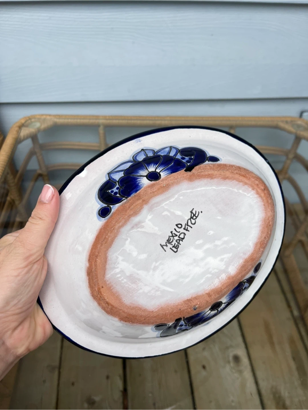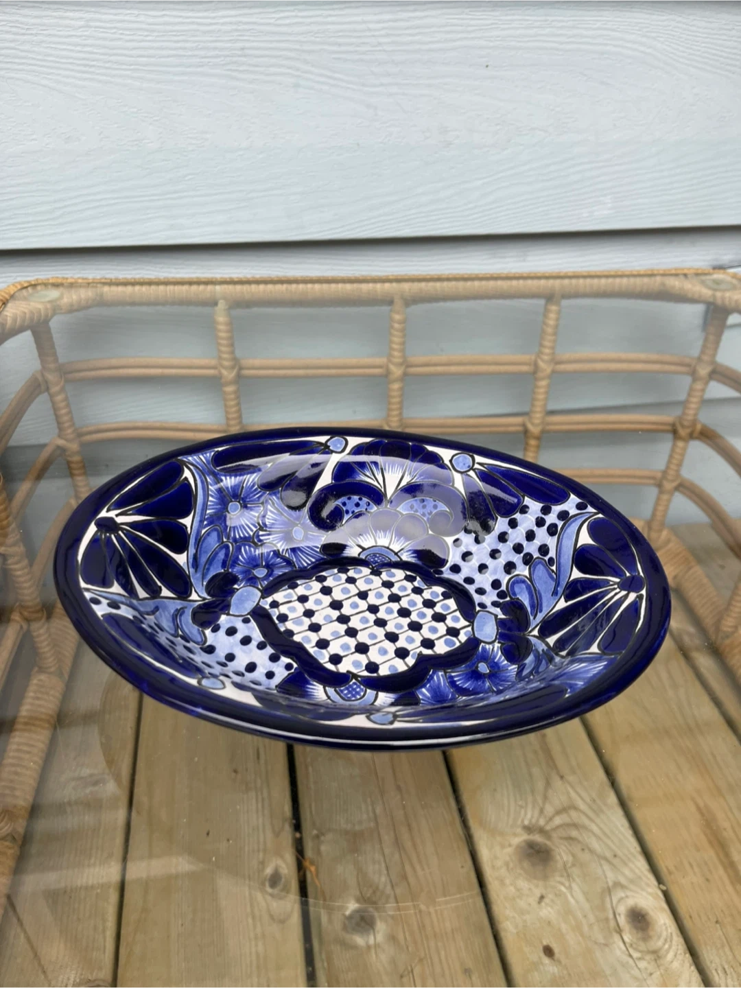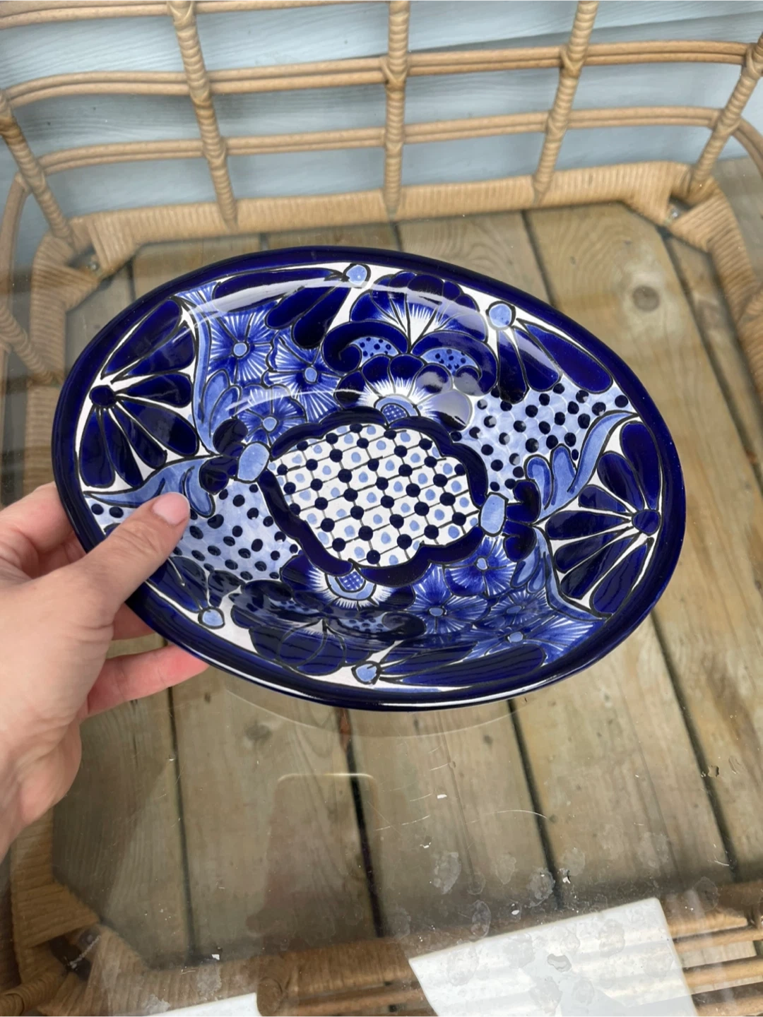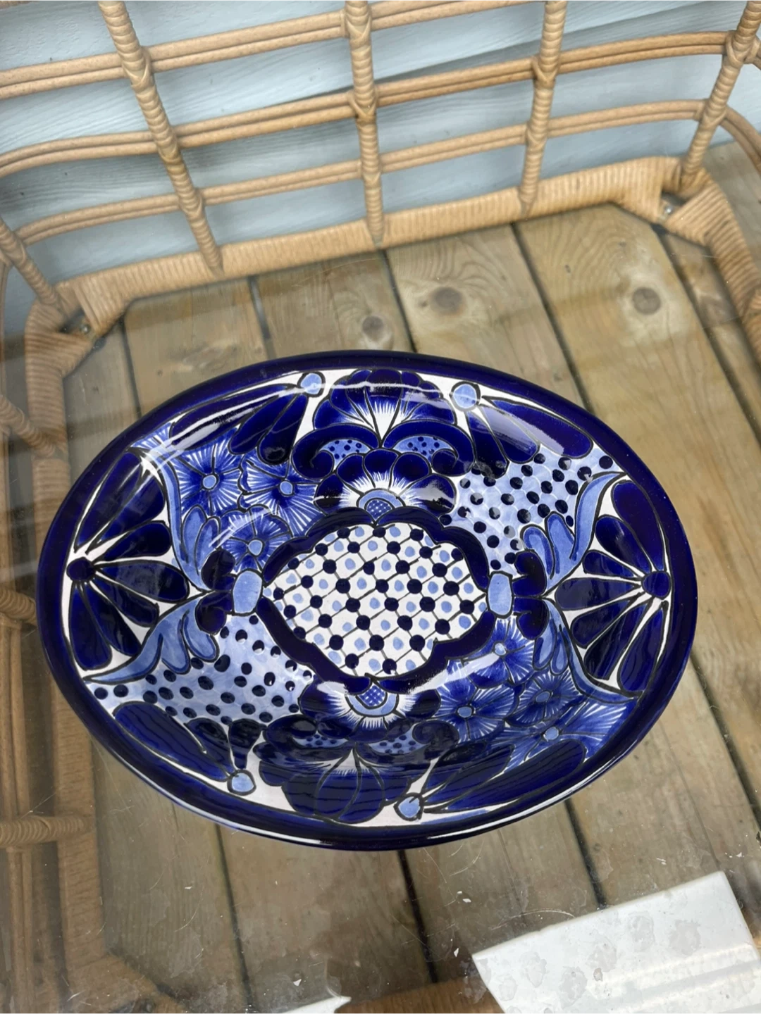 Beautiful decorative bowl in a Talavera style. It has a lovely blue and white floral pattern. Perfect for adding a touch of colour to your home decor!