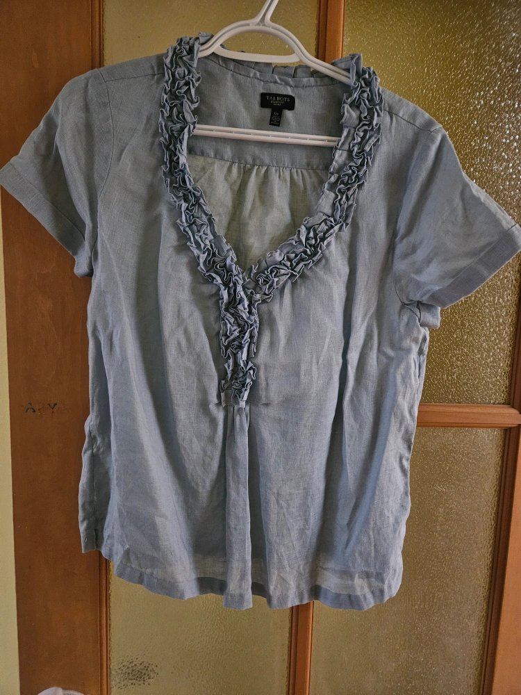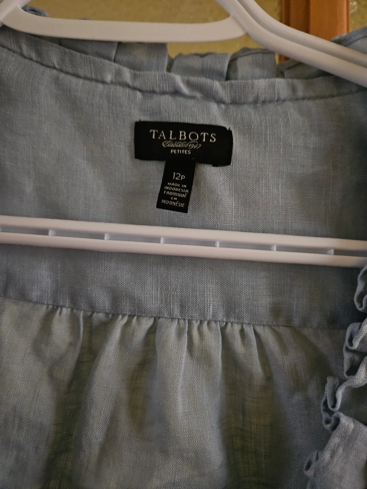Selling a Talbots linen top in size 12P. It's a light blue colour and made of 100% linen. Perfect for warmer weather!