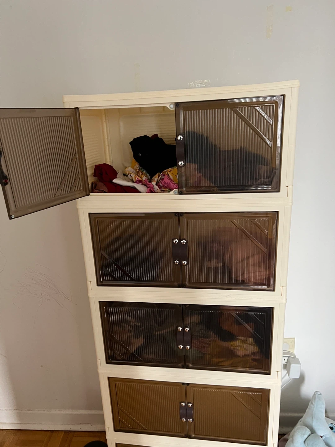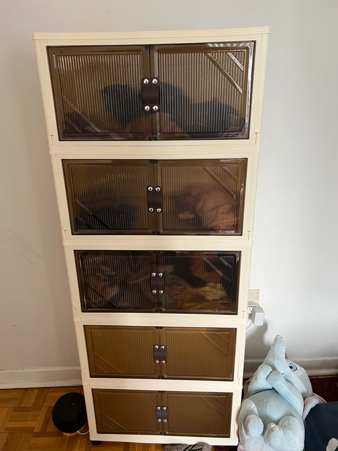 Tall plastic storage cabinet with multiple compartments! Great for organizing clothes, toys, or other household items. The cabinet features translucent doors, so you can easily see what's inside each section
