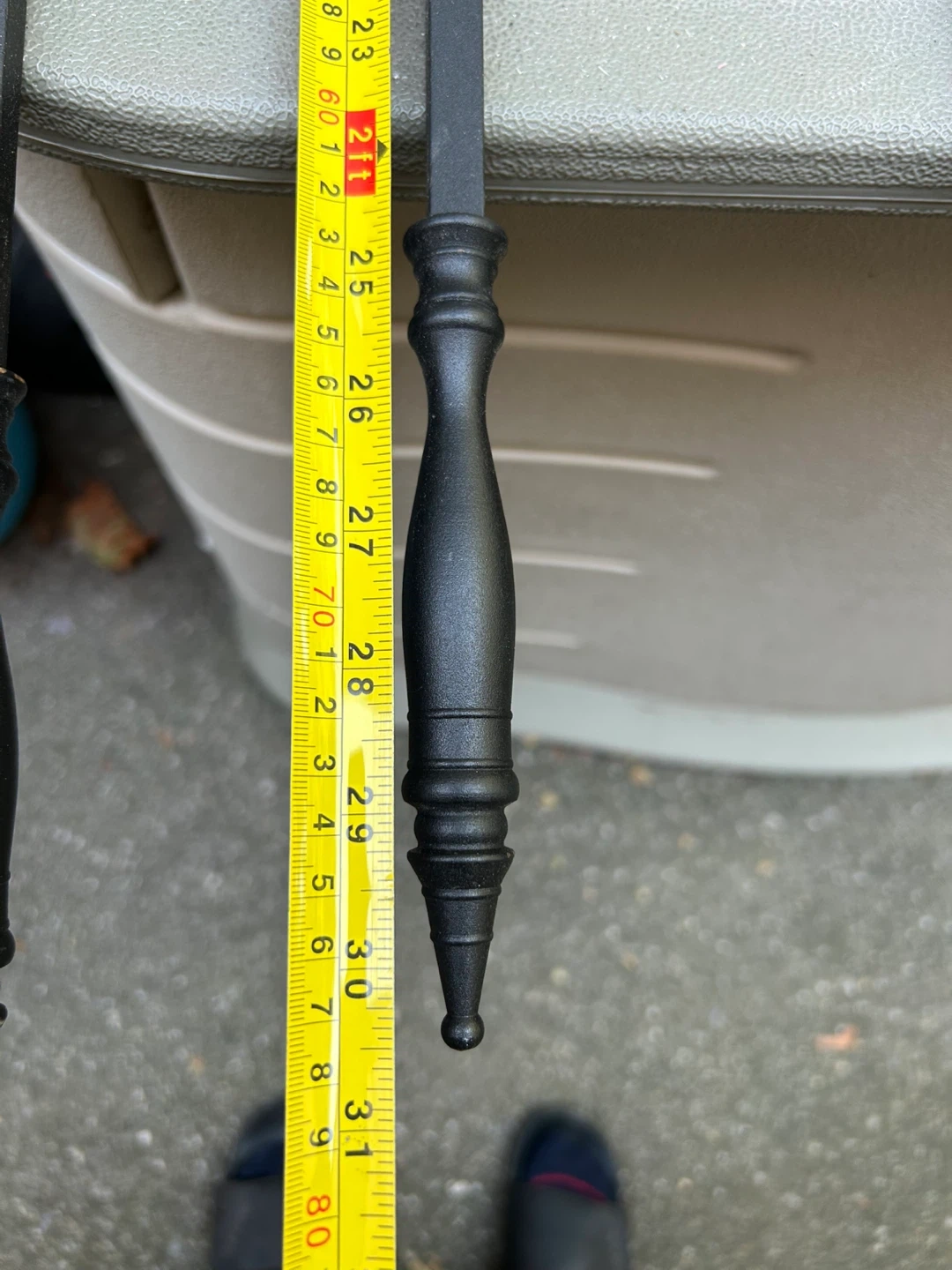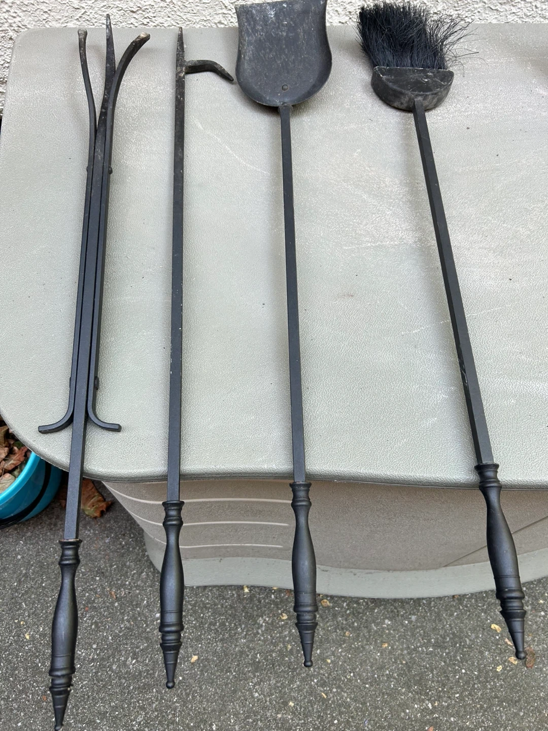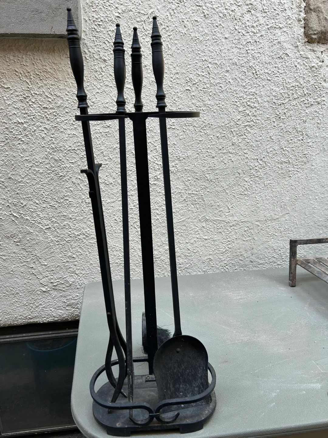 Tall set Black metal fireplace tools poker wood burning fire NOT BRASS 31 inches 5 piece East York Elegant 4 pieces and one stand Black metal well made Modern design with traditional finial Poker Broom Dust pan for ash Wood grabber for logs About 31 inches tall each piece Excellent condition 60.00 Flexible re pickup time & day Elmsdale Road M4J 3M3 Donlands O'Connor East York Don Mills south exit off DVP