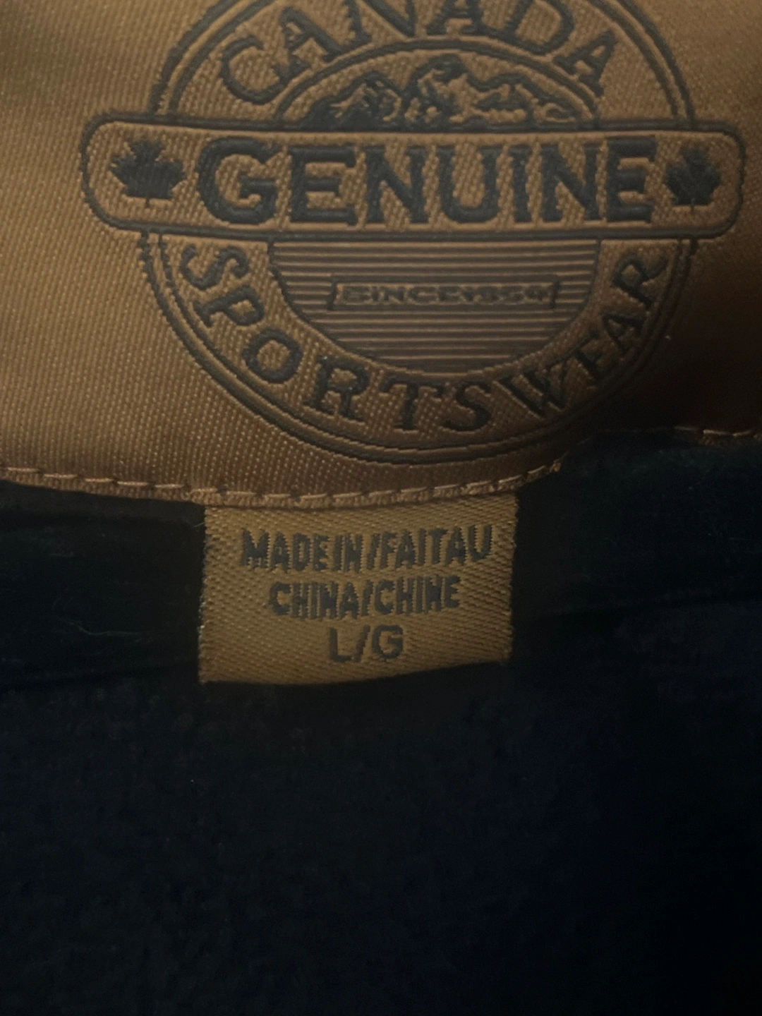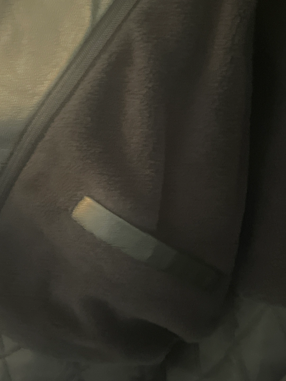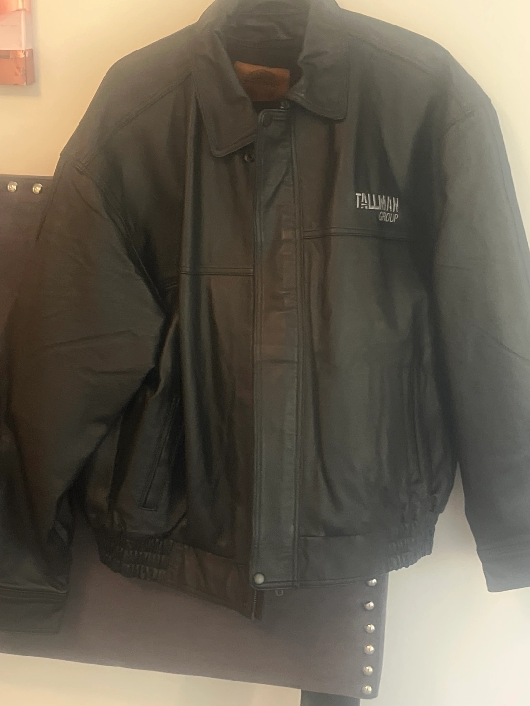 Black leather jacket with zipper closure, two front pockets, and elastic waistband. 2 inside side pockets and cell phone pouch
