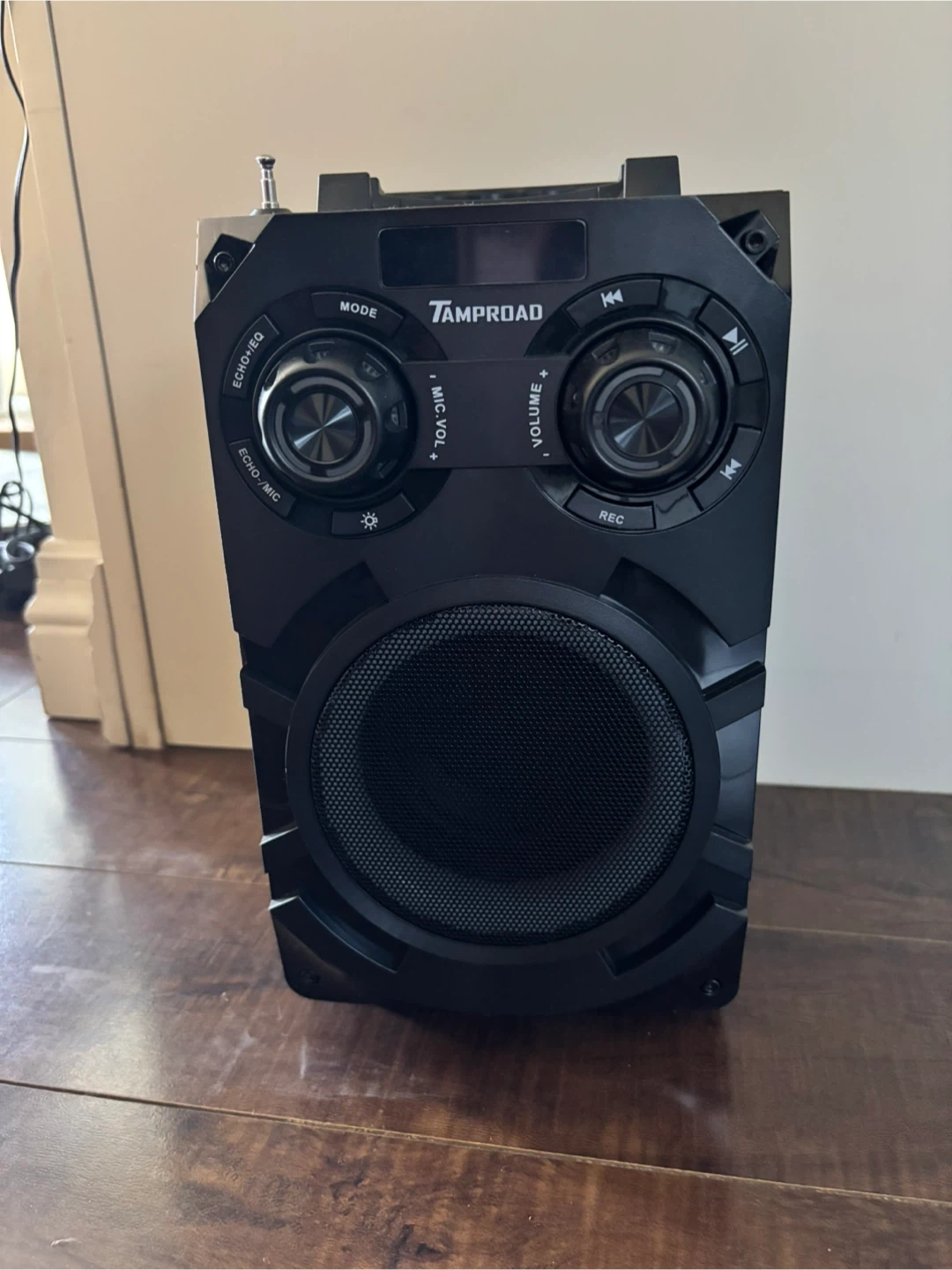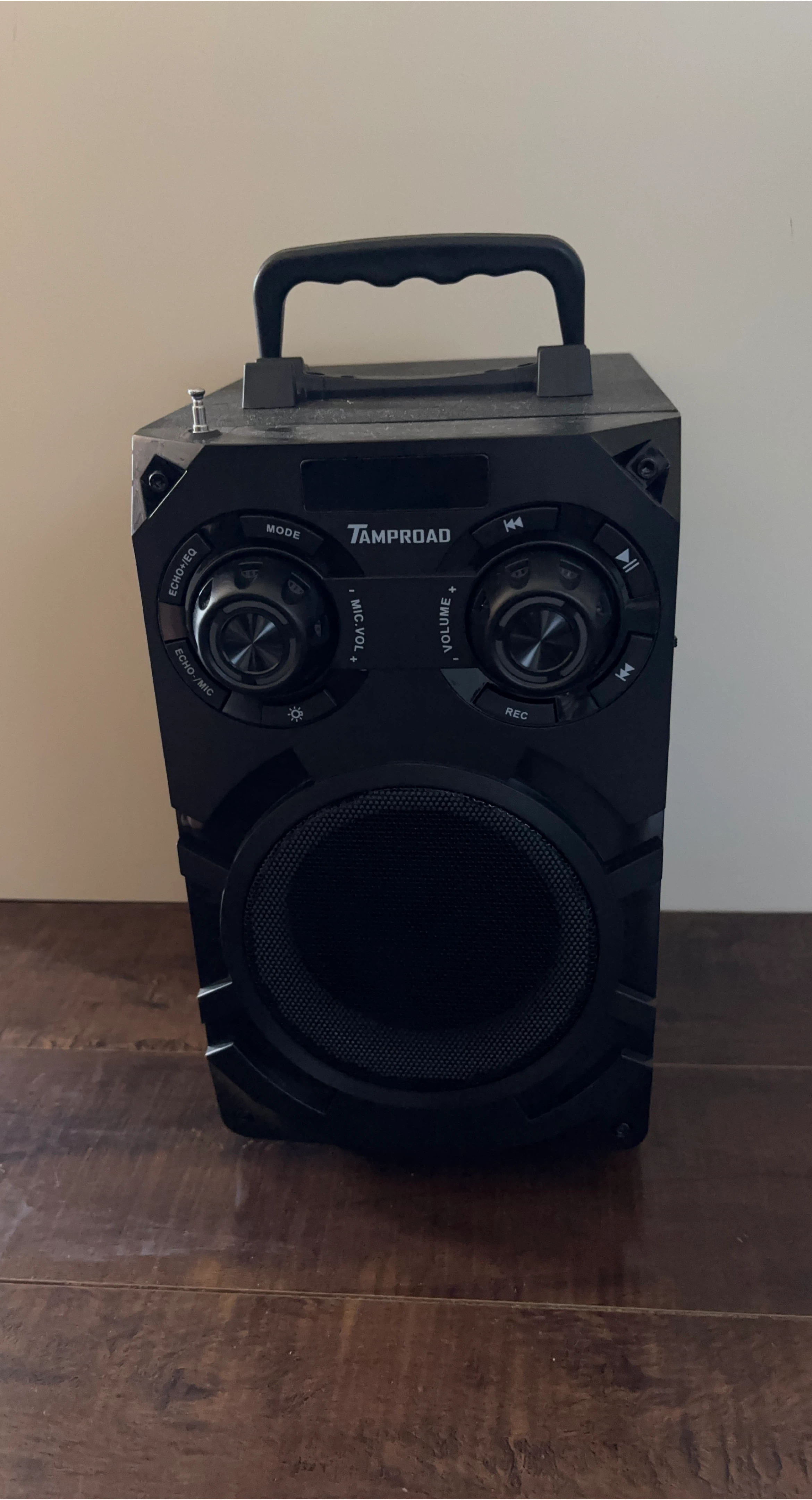Selling a Tamproad portable Bluetooth speaker. It's in great shape and ready to bring the tunes! Features include Bluetooth connectivity, volume and mic controls, and a built-in speaker for clear sound. Perfect for parties, outdoor gatherings, or just jamming out at home