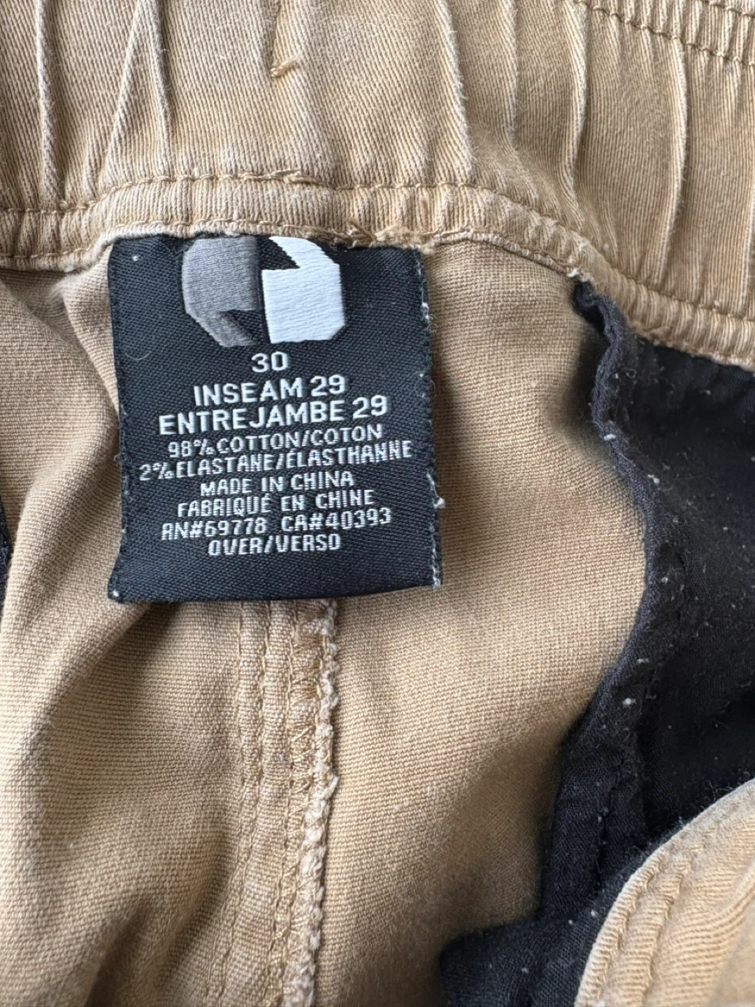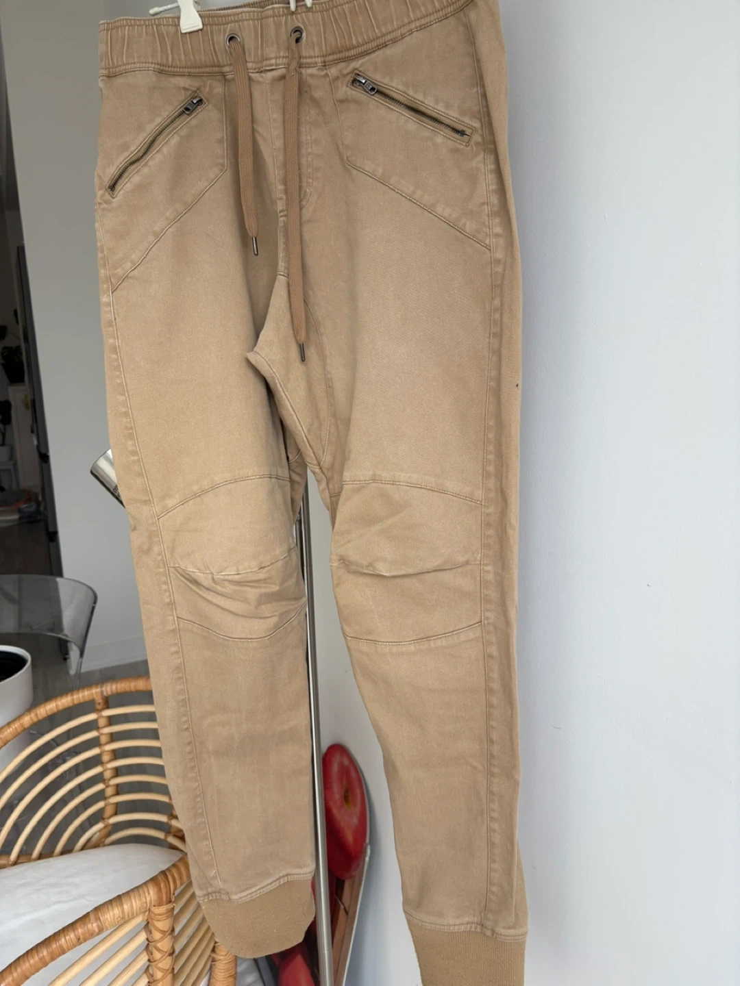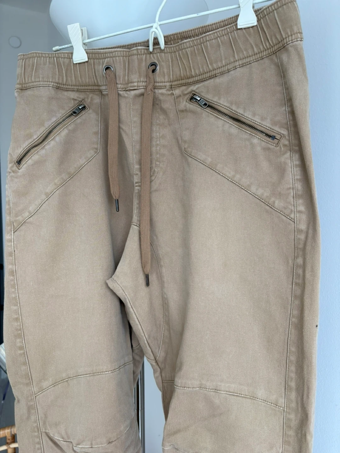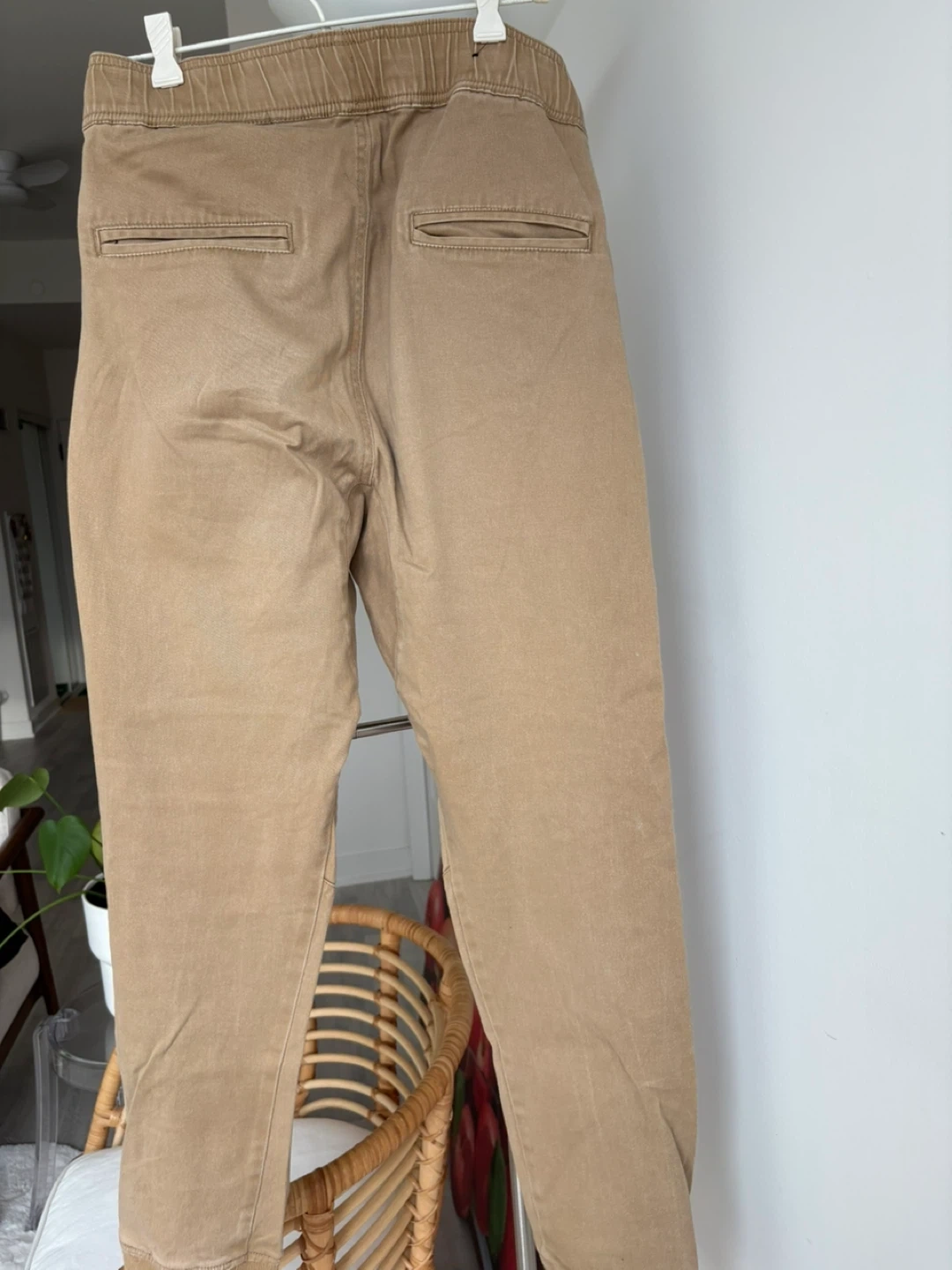 Selling a pair of tan jogger pants in size 30! They're made of 98% cotton and 2% elastane, making them super comfy. Perfect for everyday wear!