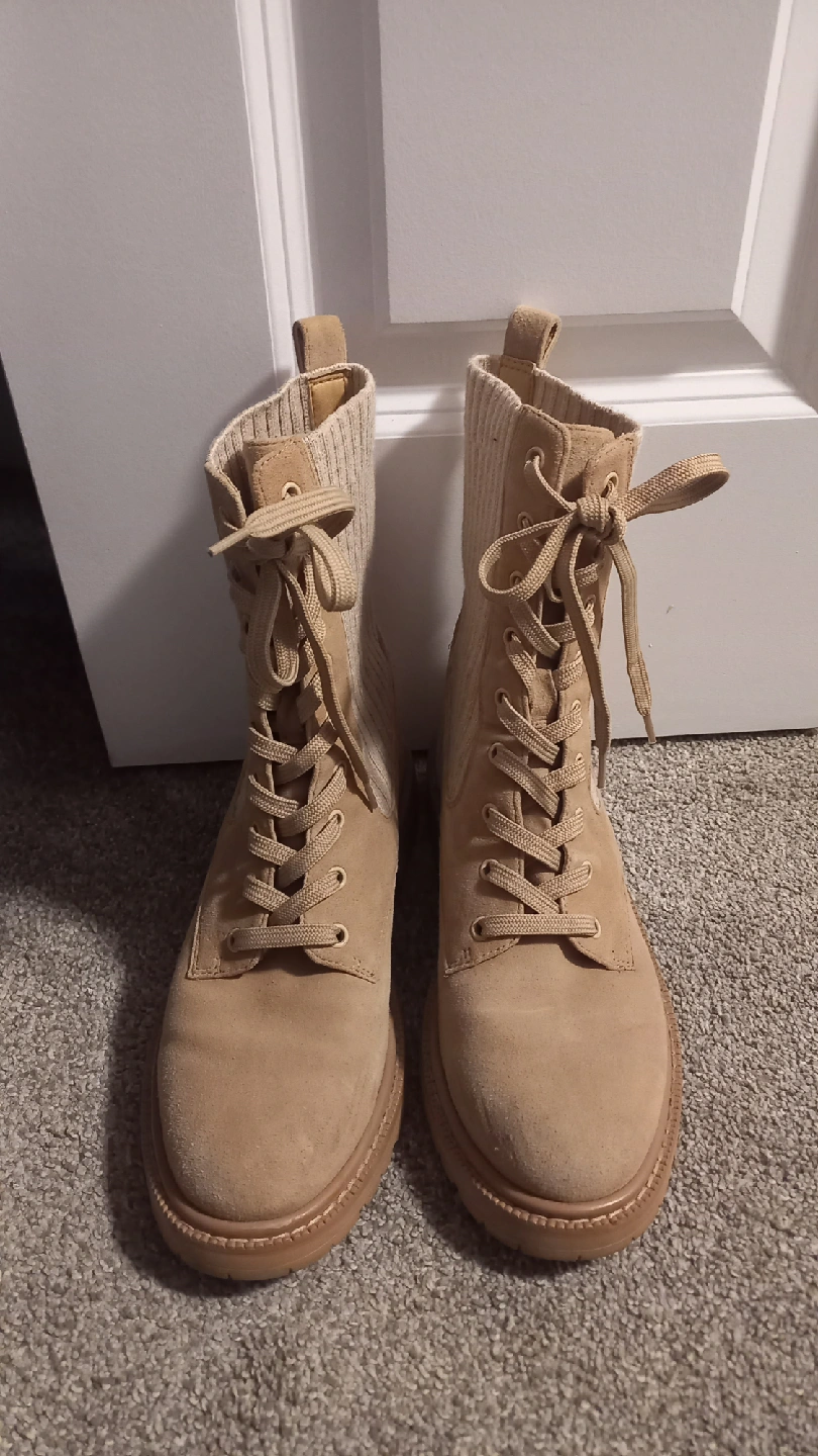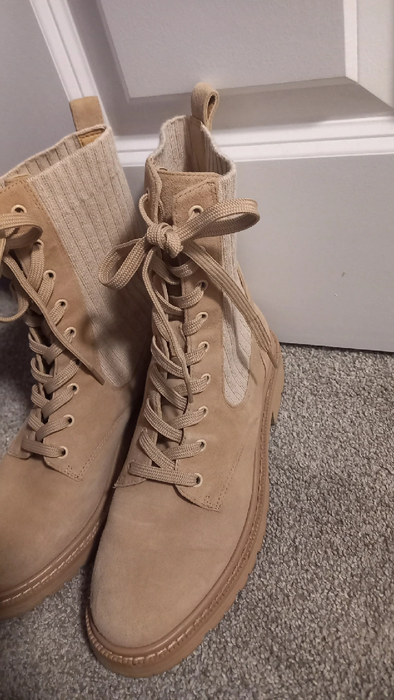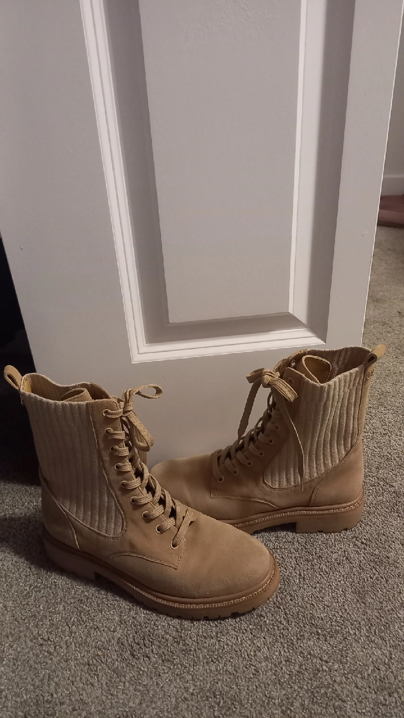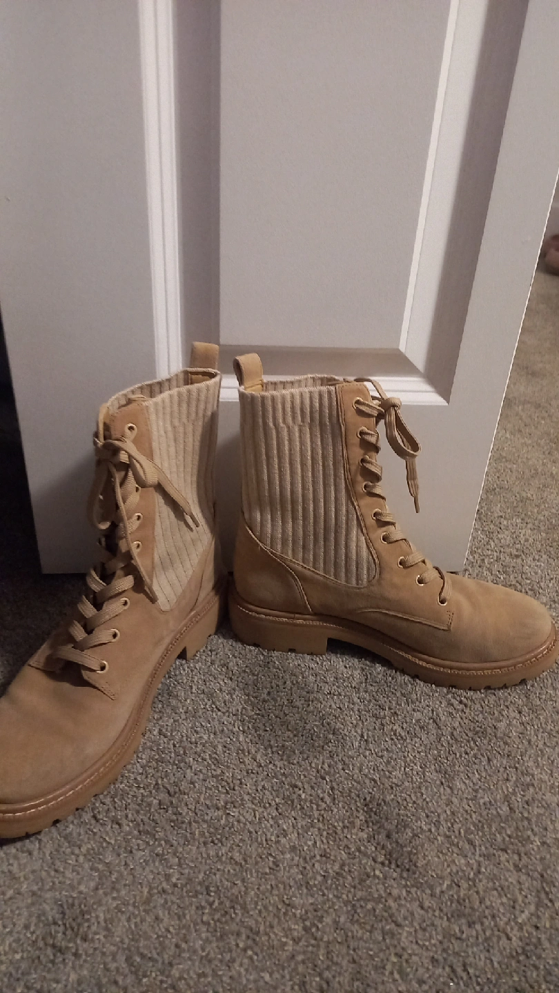 Cute tan ankle boots with a lace-up front! These boots are in great condition and ready for a new home. They feature a unique knit sock detail around the ankle