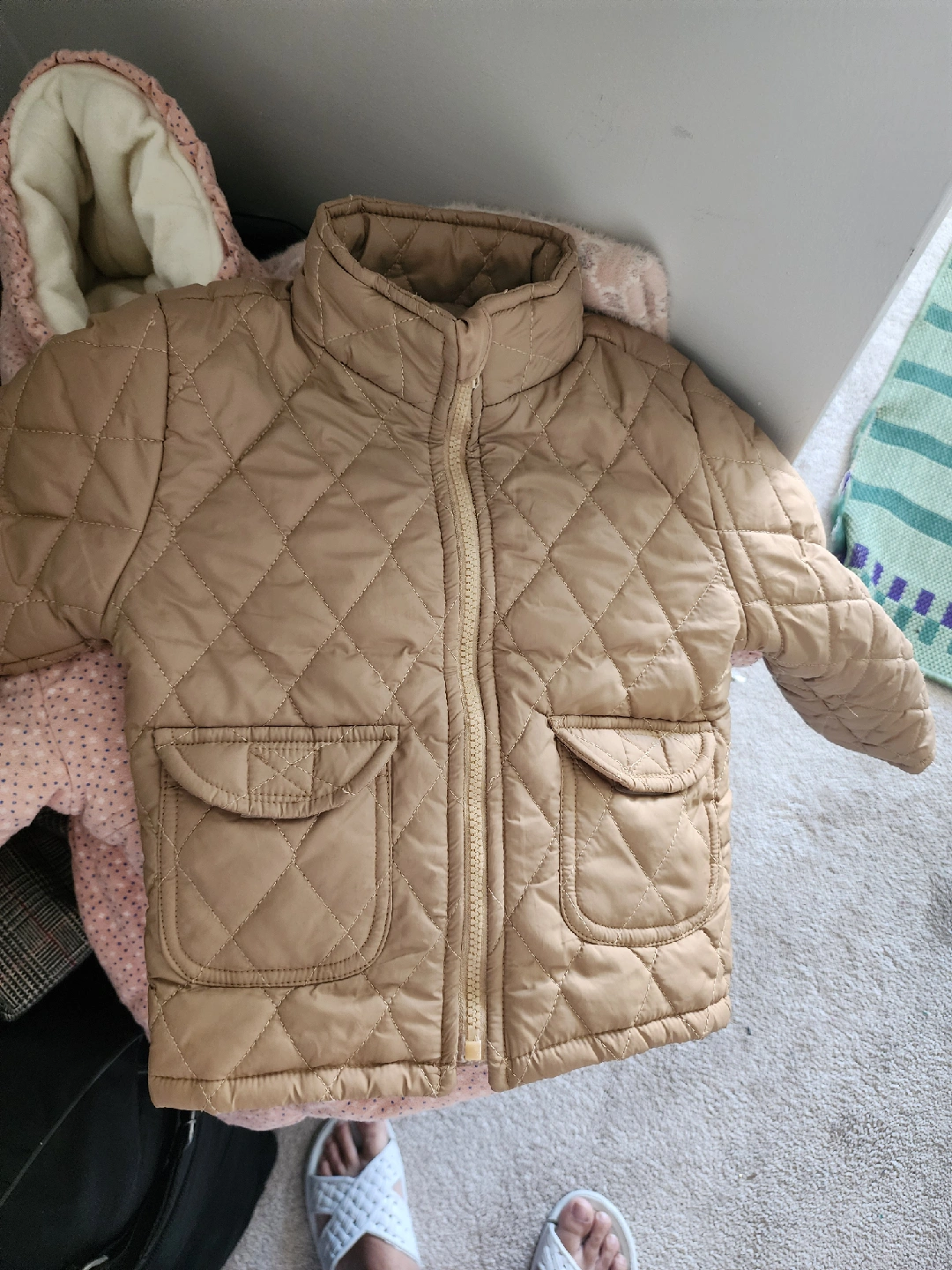 Selling a cute tan quilted jacket for a little one! It's in great condition and perfect for keeping your baby warm during cooler weather. The jacket features a zipper closure and two small pockets in the front, adding a touch of style and functionality. size 4