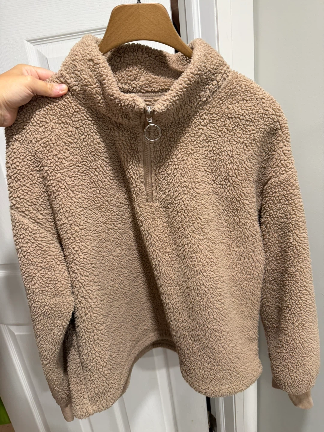 Selling a comfy tan sherpa pullover! It's super soft and perfect for chilly days. The pullover has a quarter-zip at the front. It's in great condition and ready for a new home!