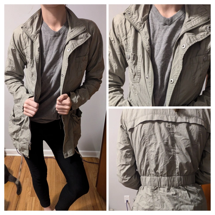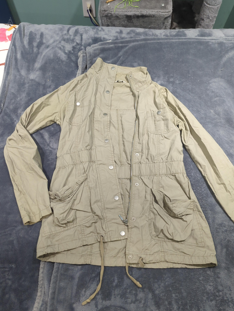 Selling a tan utility jacket. It has a zipper and button closure. It also has a drawstring around the waist. It's in great condition and ready for someone else's closet. Great for that early fall weather. Can withstand some light rain. Material is 100% cotton Brand is PURE; Alfred Sung