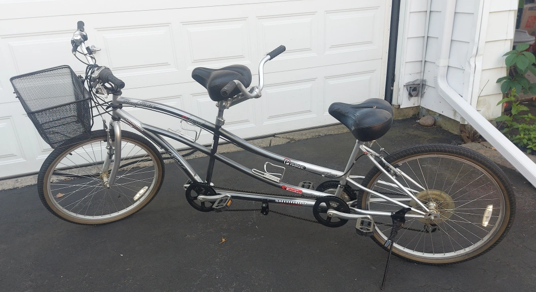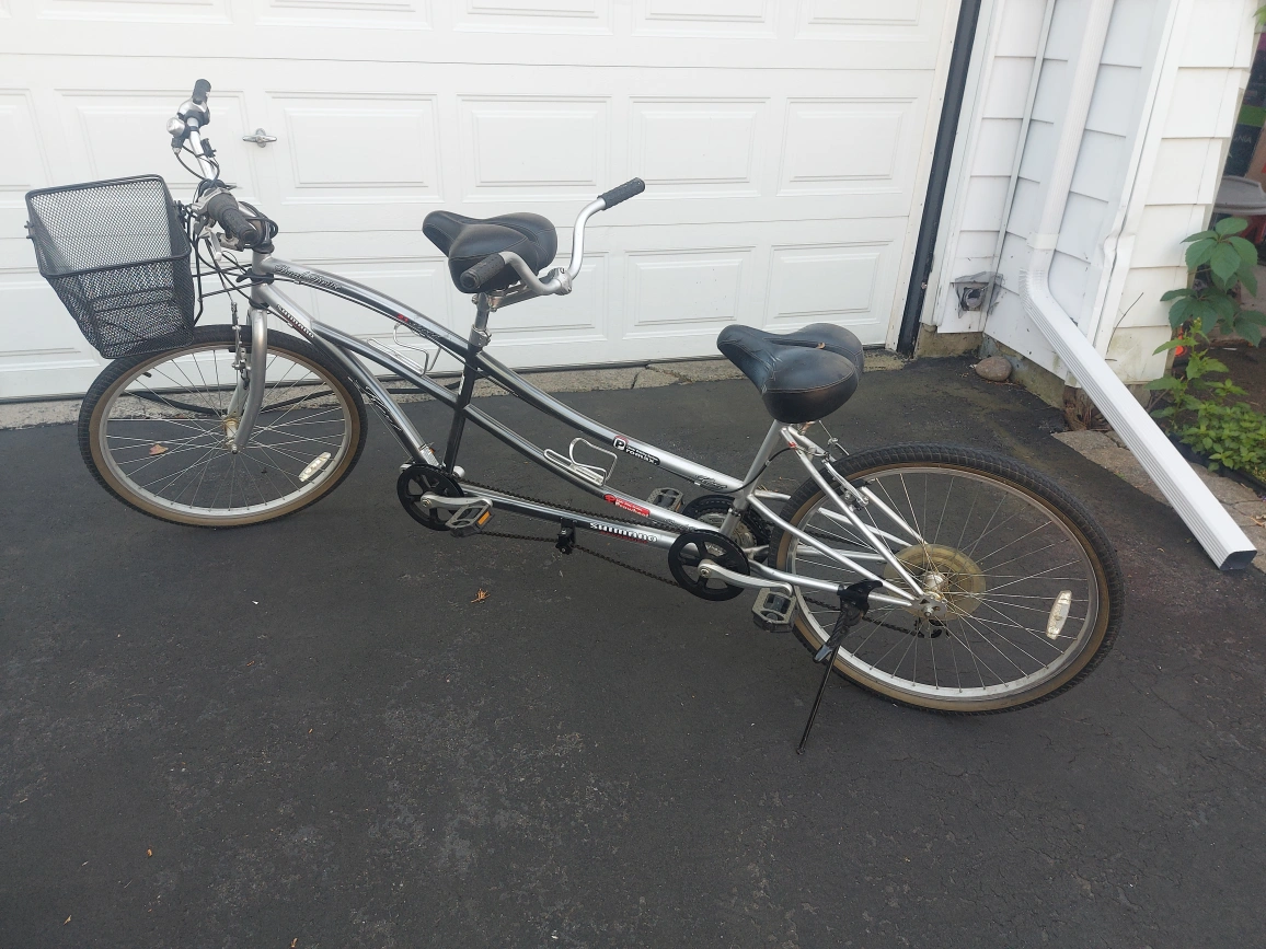 Selling a tandem bicycle in silver. It has a basket in the front, perfect for carrying groceries or other items on your ride. The bike also features Shimano components and Promax bottle cages. 26" wheels, 21 speed, upgraded seats.