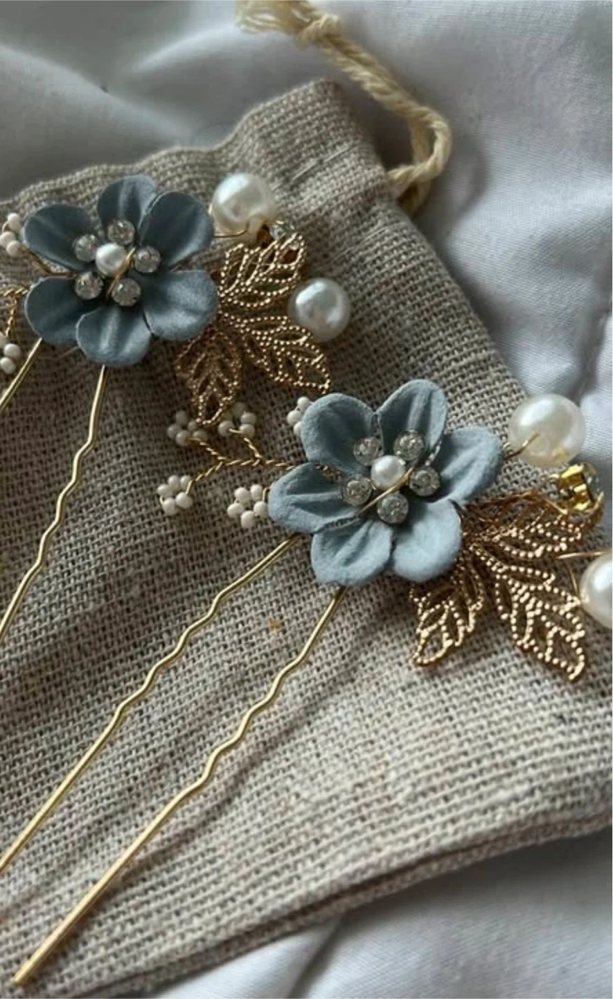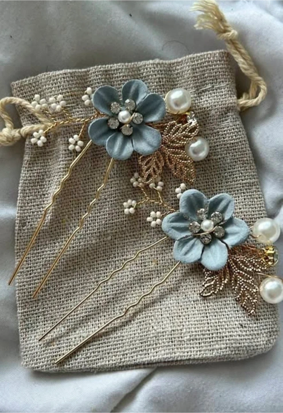Selling a set of two beautiful floral hair pins. They feature delicate blue flowers with pearl and crystal accents, and gold leaf details. Perfect for weddings, special occasions, or adding a touch of elegance to your everyday look! 2 pins - Retail $125 from Tania Maras. That’s “little something” for your something blue. Please respect pricing.