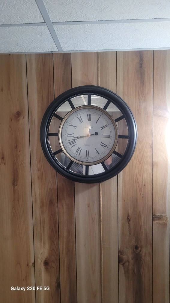 Selling a Tanis Huron wall clock. It has a black frame and a mirrored outer ring. The clock face features Roman numerals. A stylish addition to any room!