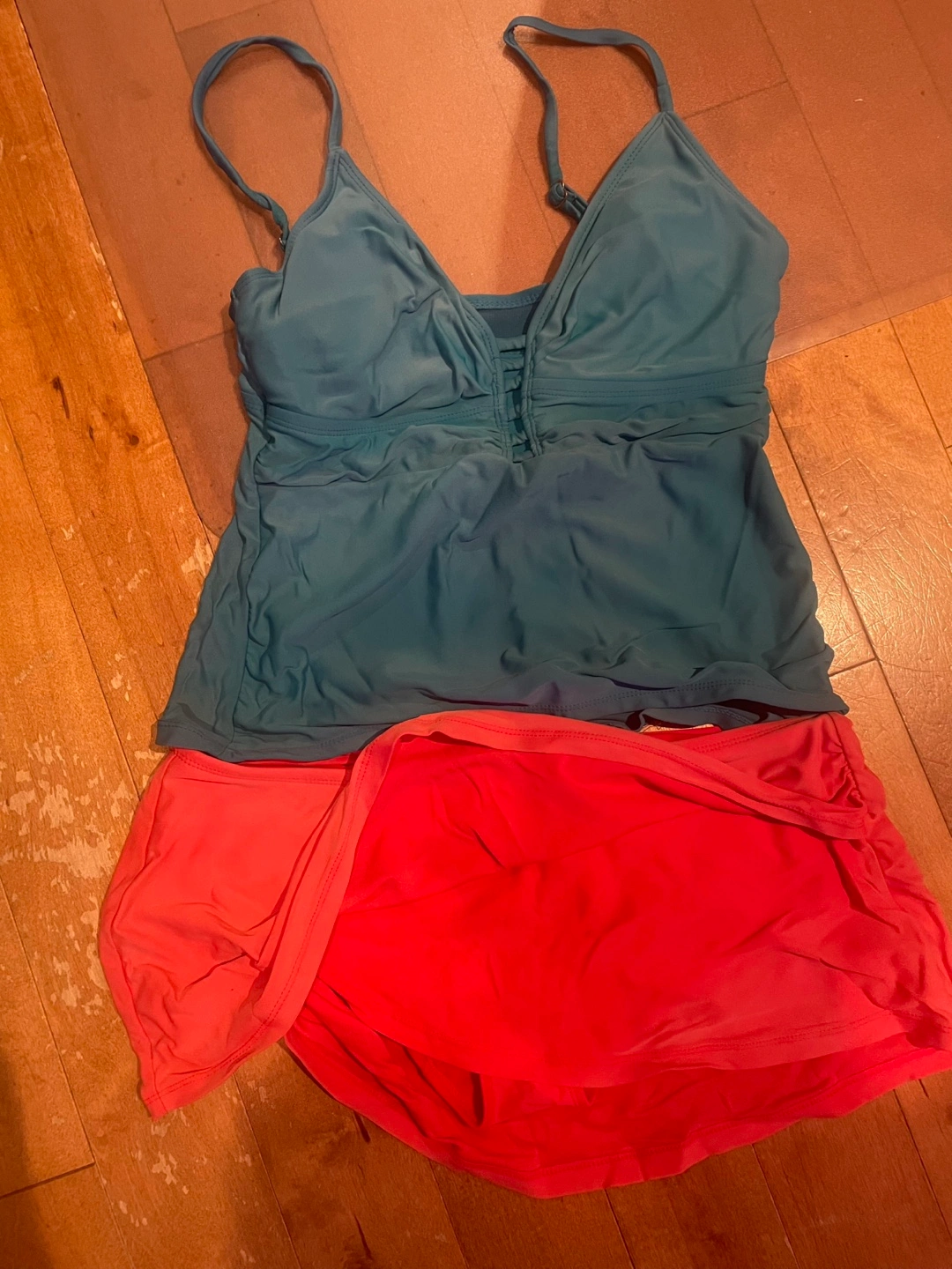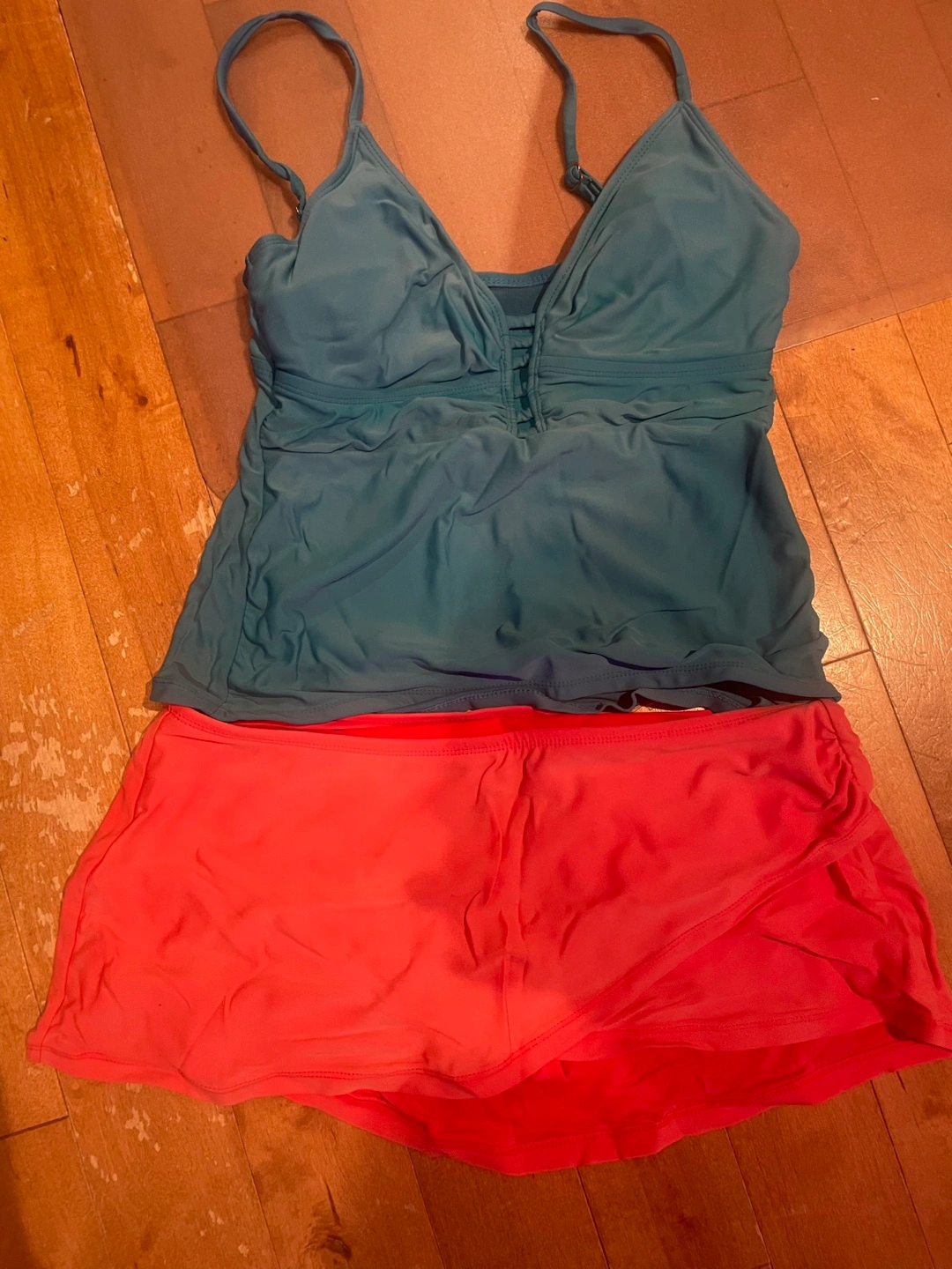 Selling a cute tankini swimsuit set! It features a blue tankini top and a coral pink swim skirt. Perfect for the pool or beach