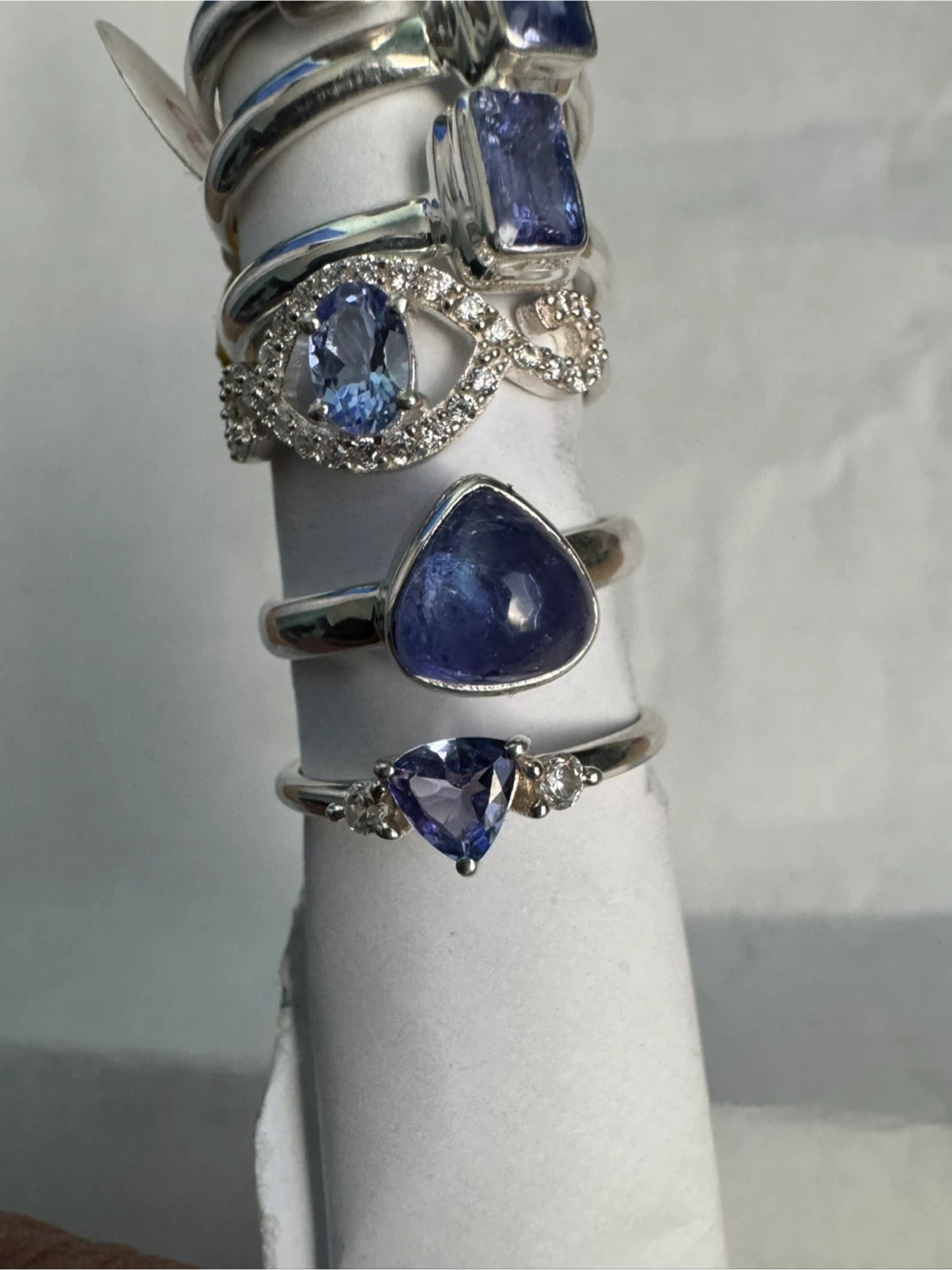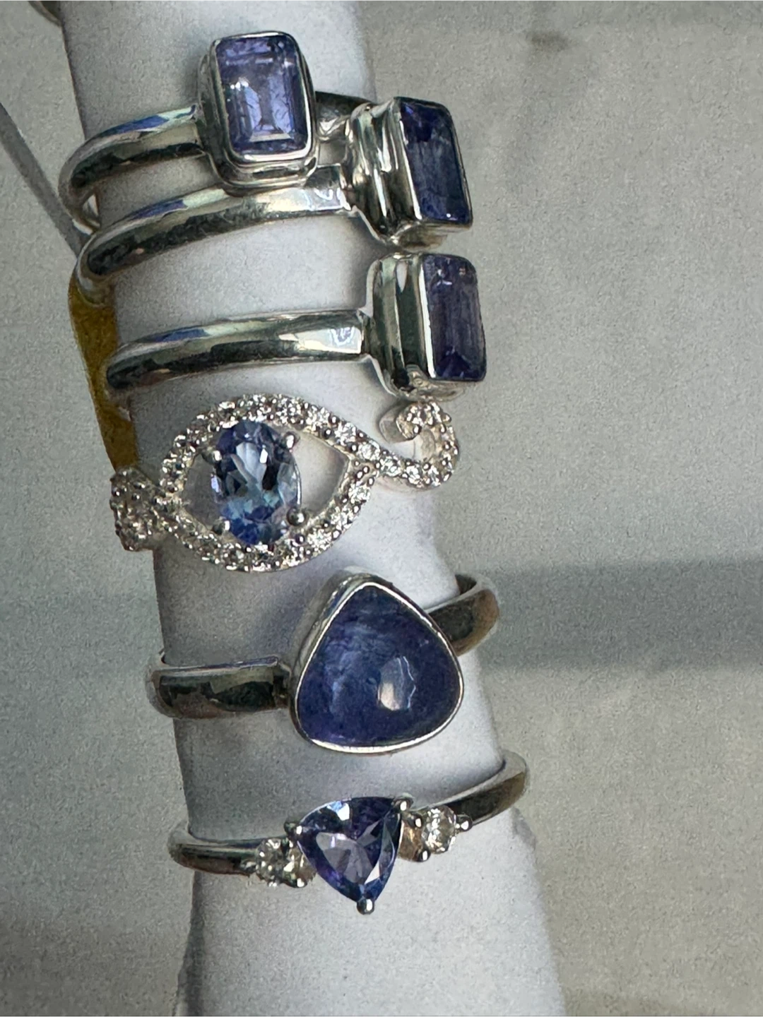Selling a collection of Tanzanite gemstone rings. Each ring features a unique cut and setting, from rectangular to heart-shaped. The gemstones are a beautiful shade of blue/purple. In shops sell them over 300$