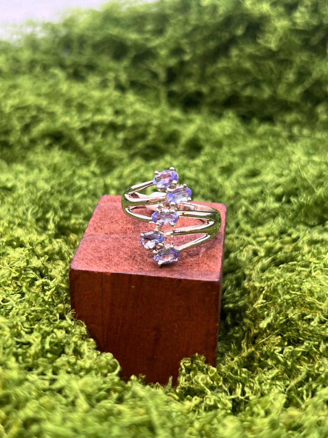 Selling a beautiful sterling silver ring featuring tanzanite stones. It's a unique design that catches the light nicely. Perfect for adding a touch of elegance to any outfit!