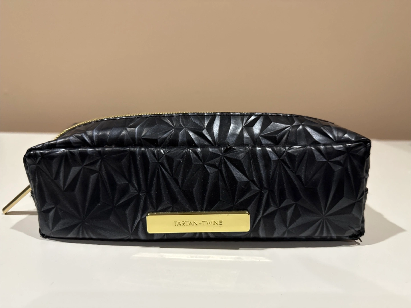 Small black cosmetic bag. Geometric pattern. Gold zipper and logo plate. Zipper closure. Meet up and cash only Meet at Brentwood mall
