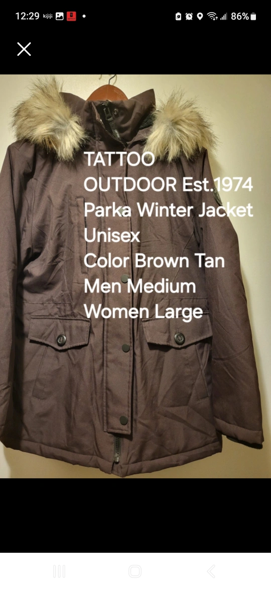 Tattoo Outdoor Parka Winter hooded Jacket - Unisex Size M/L Brown tan parka winter jacket. Faux fur trim hood. Zipper and button closure. Multiple pockets. Measurements: Shoulder 18 in Sleeve 24 in, Chest 24 in, Length 30 in. Men's medium, women's large. Note: The original price is way more + Tax Here, Price is the lowest/firm to go away faster. Please call/ text for a faster response. 647 855 6217 MEET UP OPTIONS: 1. Tim Hortons at Jane Park Plaza. Jane St. /Alliance Ave. 2. Any subway station from Kipling to young and Bloor NOTE: If u like, please see my other ad postings. Leather shoes, dress shirts, dress pants, jeans, Tennis/Squash Badminton Rackets, Exercise/Bike stuff, and more….. Mostly, brand name stuff is new or like new to go away in about half price. Thanks for your time