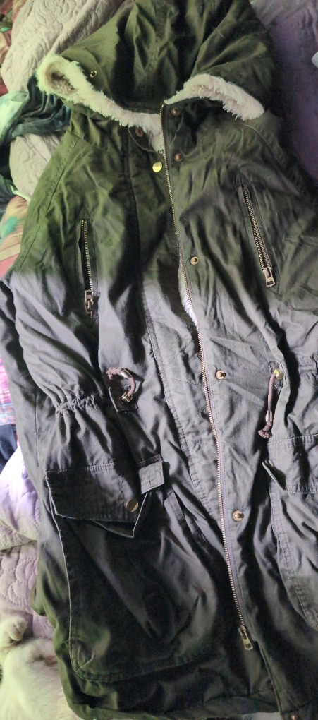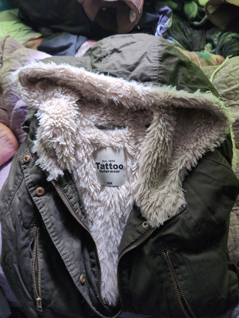 Cozy olive green parka from Tattoo Outerwear! It's a size M/M and features a warm, fuzzy lining. Perfect for those chilly Canadian days!