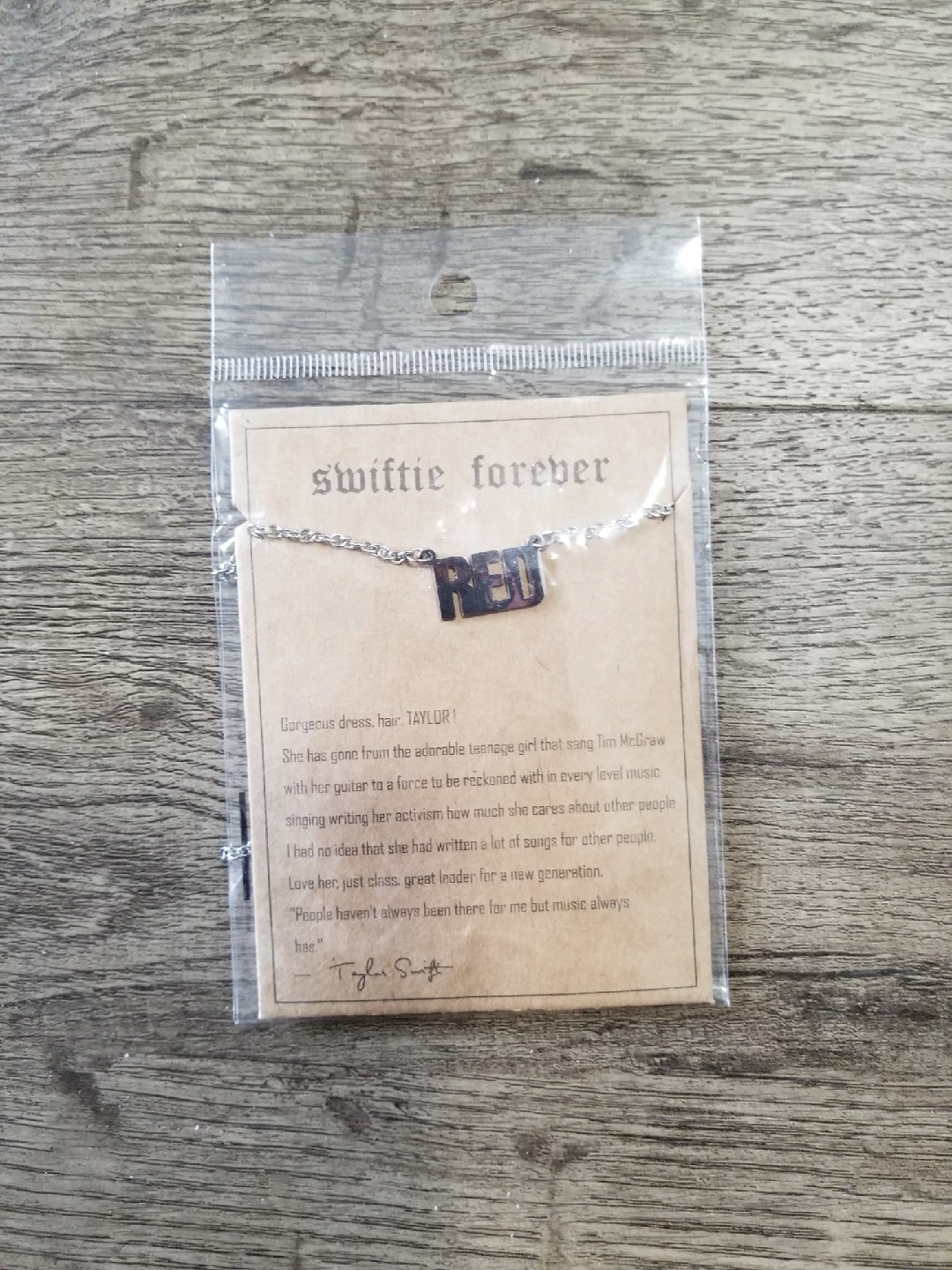 Selling a brand new Taylor Swift necklace! It says 'RED' and comes on a card that says 'Swiftie forever'. A perfect gift for any Swiftie! Brand new