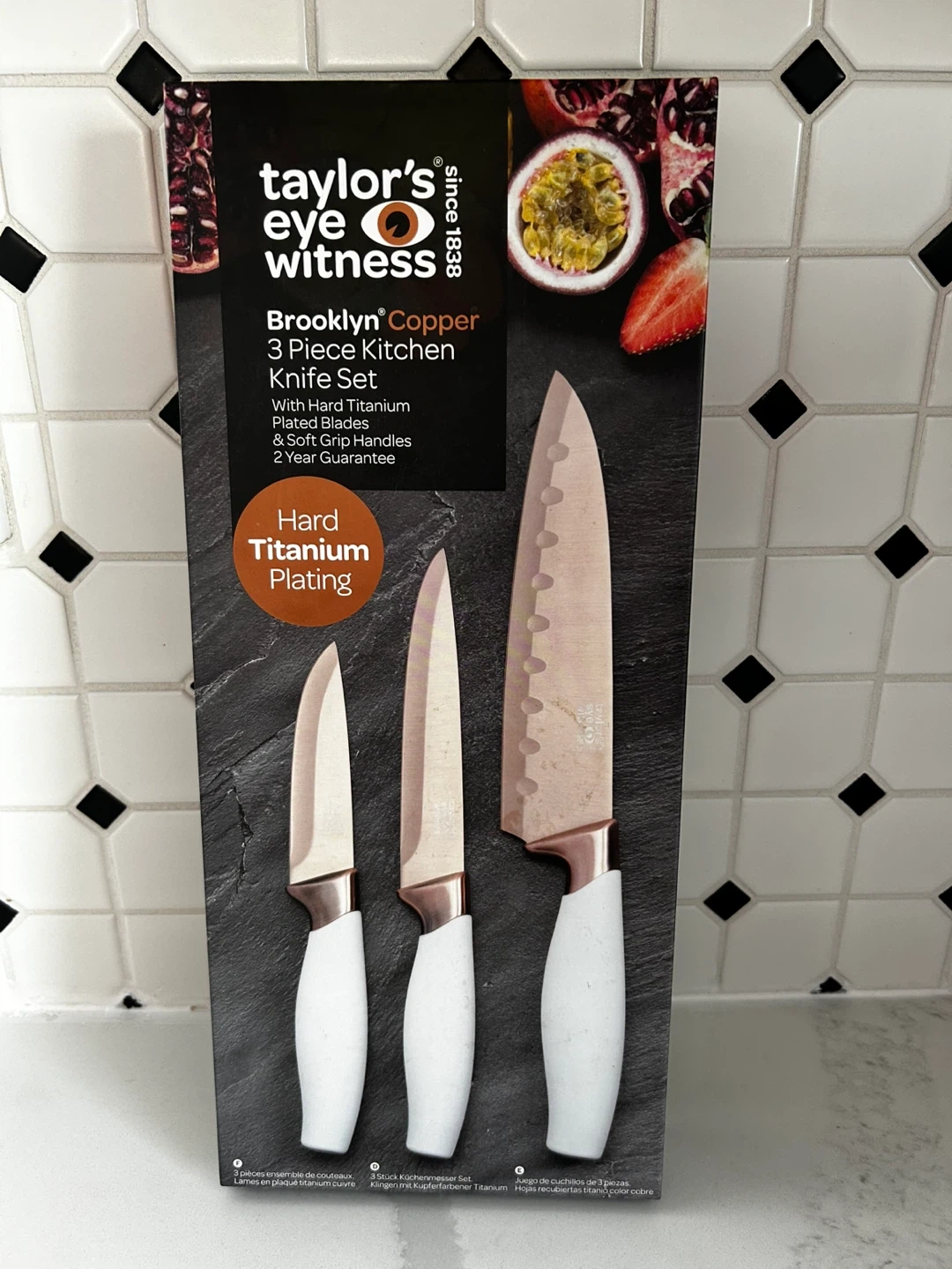 Selling a Taylor's Eye Witness Brooklyn Copper 3-Piece Kitchen Knife Set. It comes with hard titanium plated blades and soft grip handles. Also includes the box!