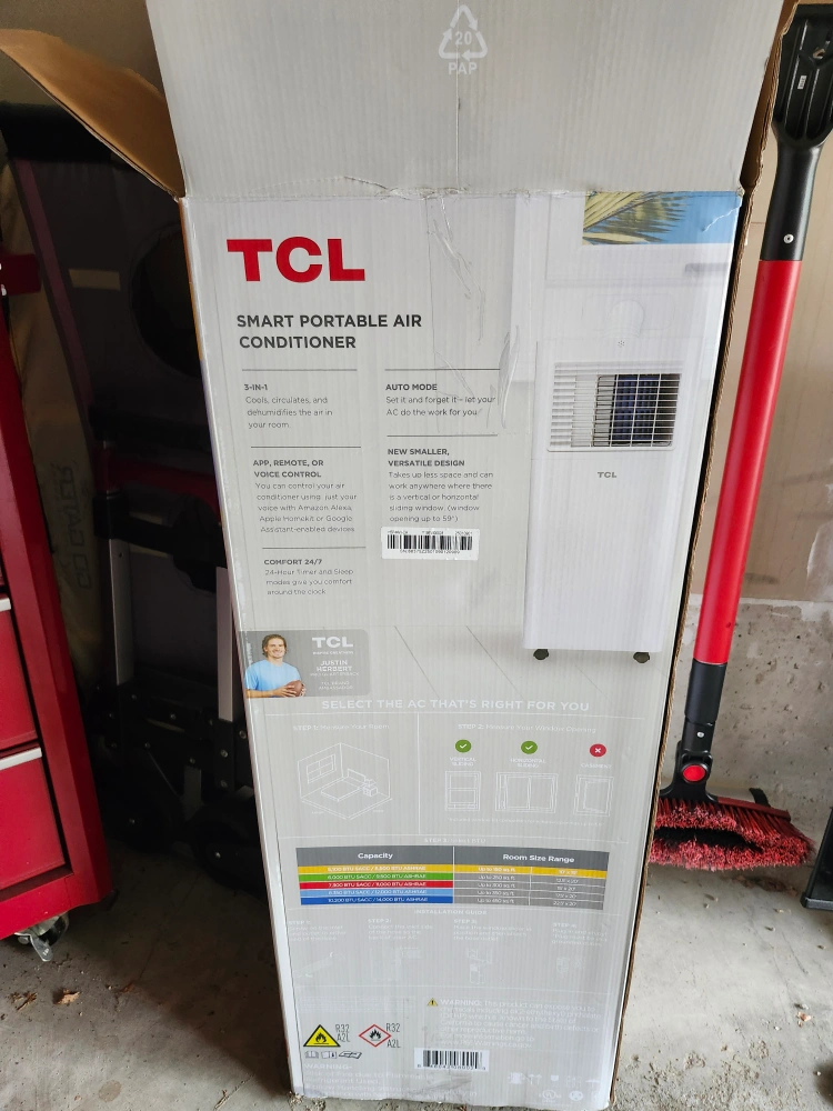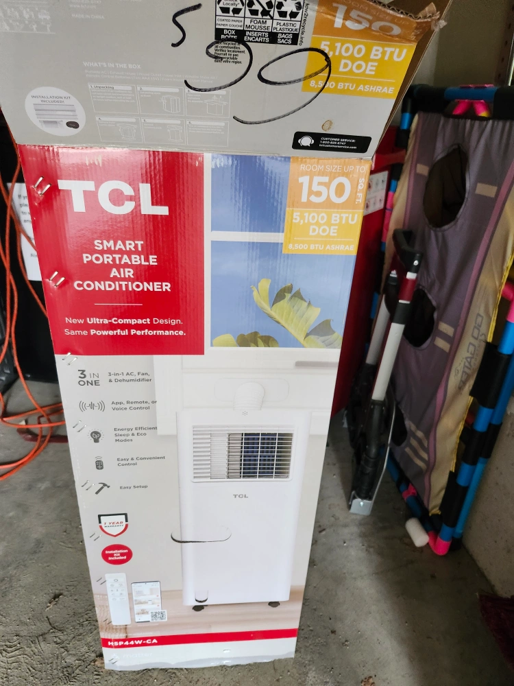 Selling a TCL Smart Portable Air Conditioner. It's a 3-in-1 unit that cools, circulates, and dehumidifies the air in your room. You can control it with the app, remote, or voice control. It's designed to take up less space and can be installed in either a vertical or horizontal window, covering up to 150 sq ft. Includes installation kit